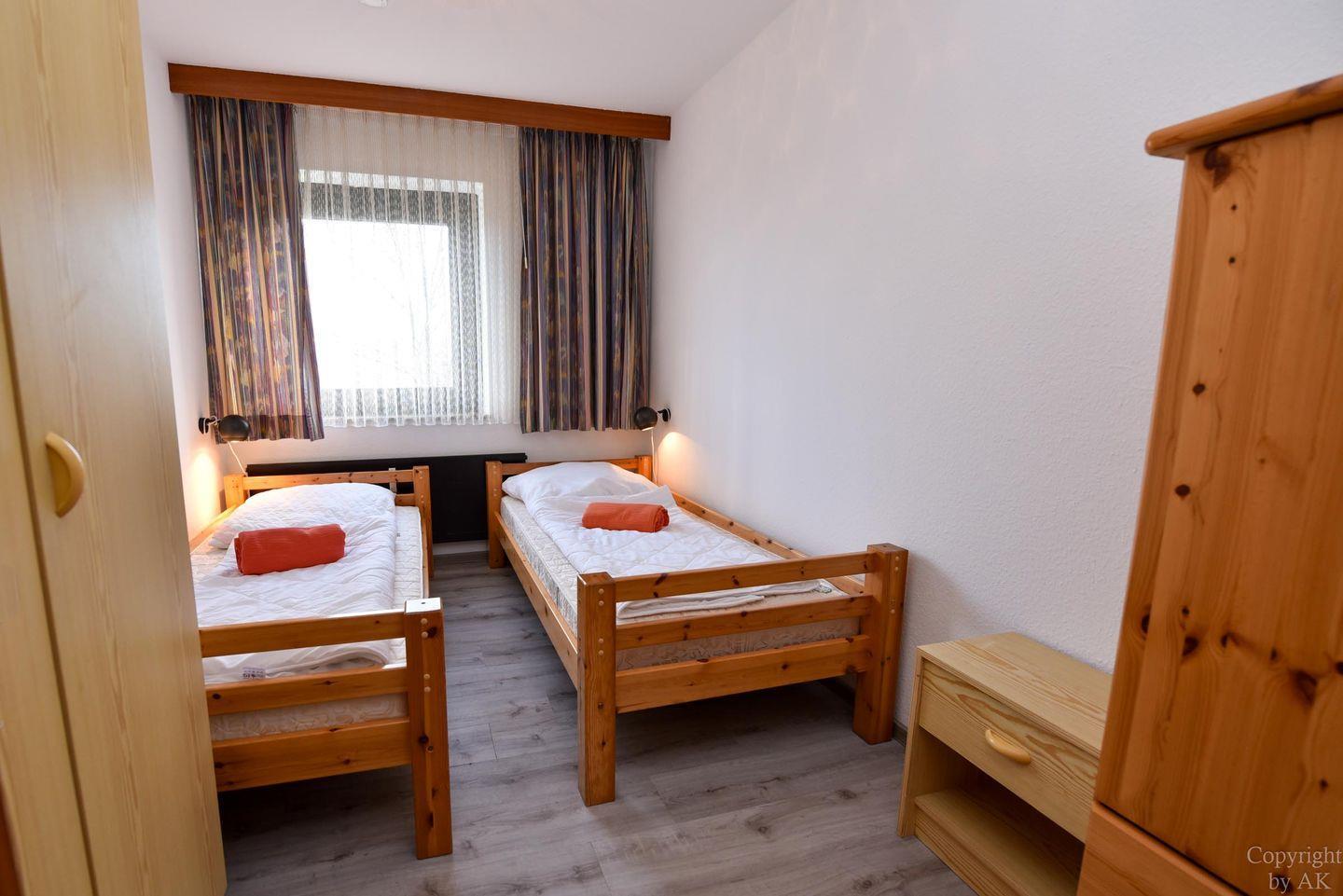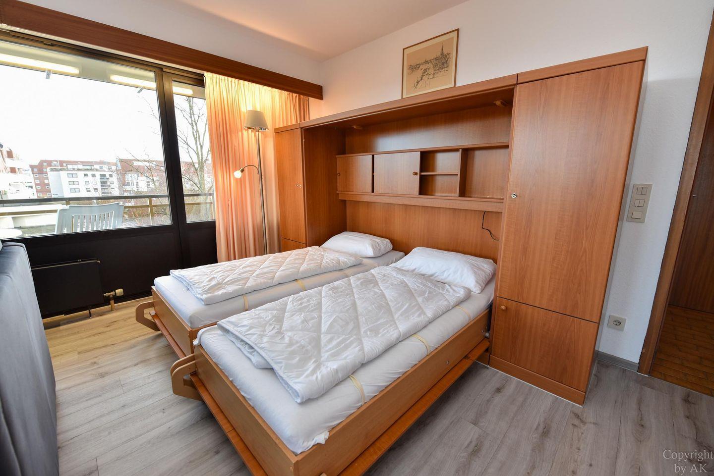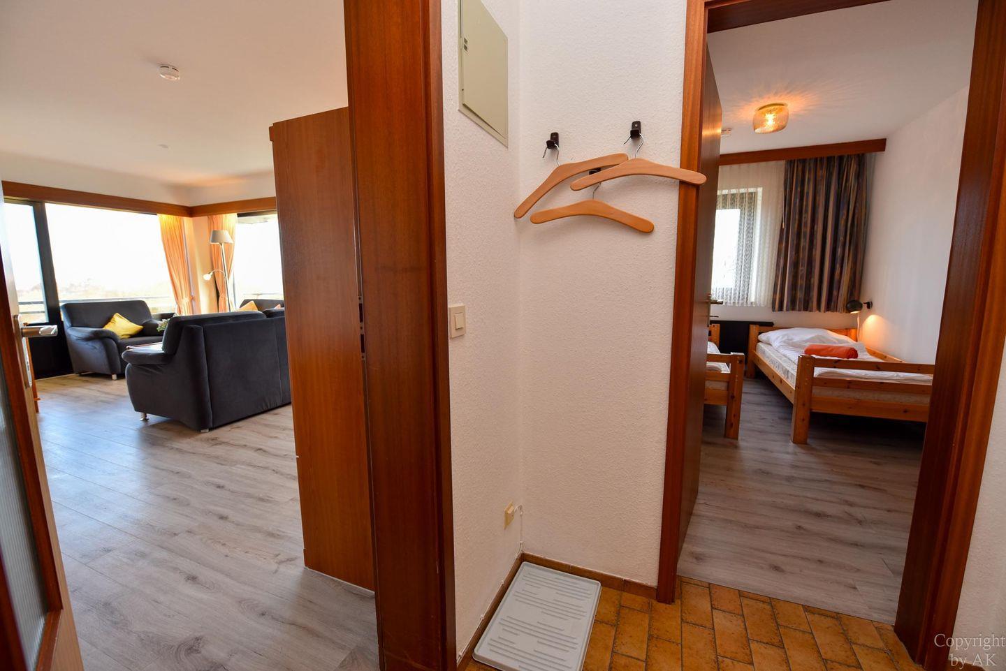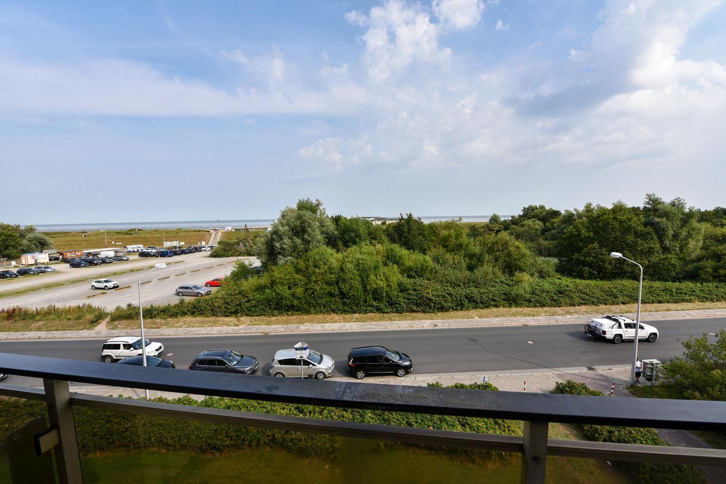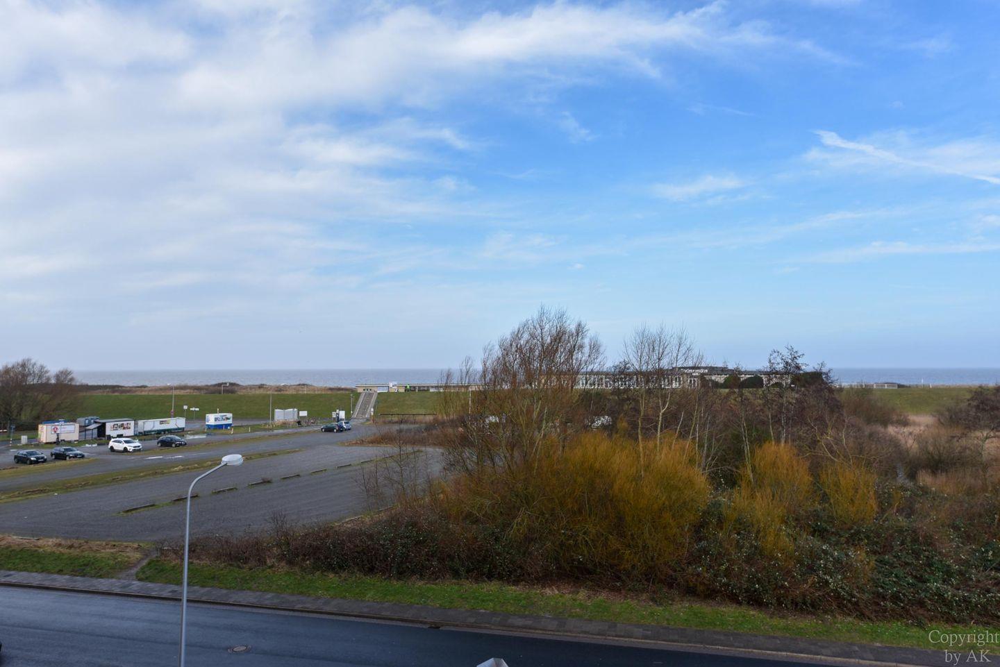 3-Zimmer Appartement für 2-4 Personen im 3. OG mit großem Balkon und Blick zum Weltschifffahrtsweg. Im Wohnbereich befinden sich u.a. zwei Schrankbetten, ein Sofa, Sessel und ein Tisch. Zugang zum großen Balkon haben Sie über zwei Türen. Es gibt ein Esszimmer mit Seeblick, welches für vier Personen ausgelegt ist und Zugang zum Balkon hat. Der dritte Raum ist der Schlafraum mit zwei Einzelbetten. Vom Wohnbereich geht es zur Küche, in der es auch eine Mikrowelle gibt. Das Appartement verfügt über ein Wannen-/ Duschbad mit WC. Der kostenlose Tiefgaragenstellplatz hat eine Einstellhöhe bis 149 cm.
