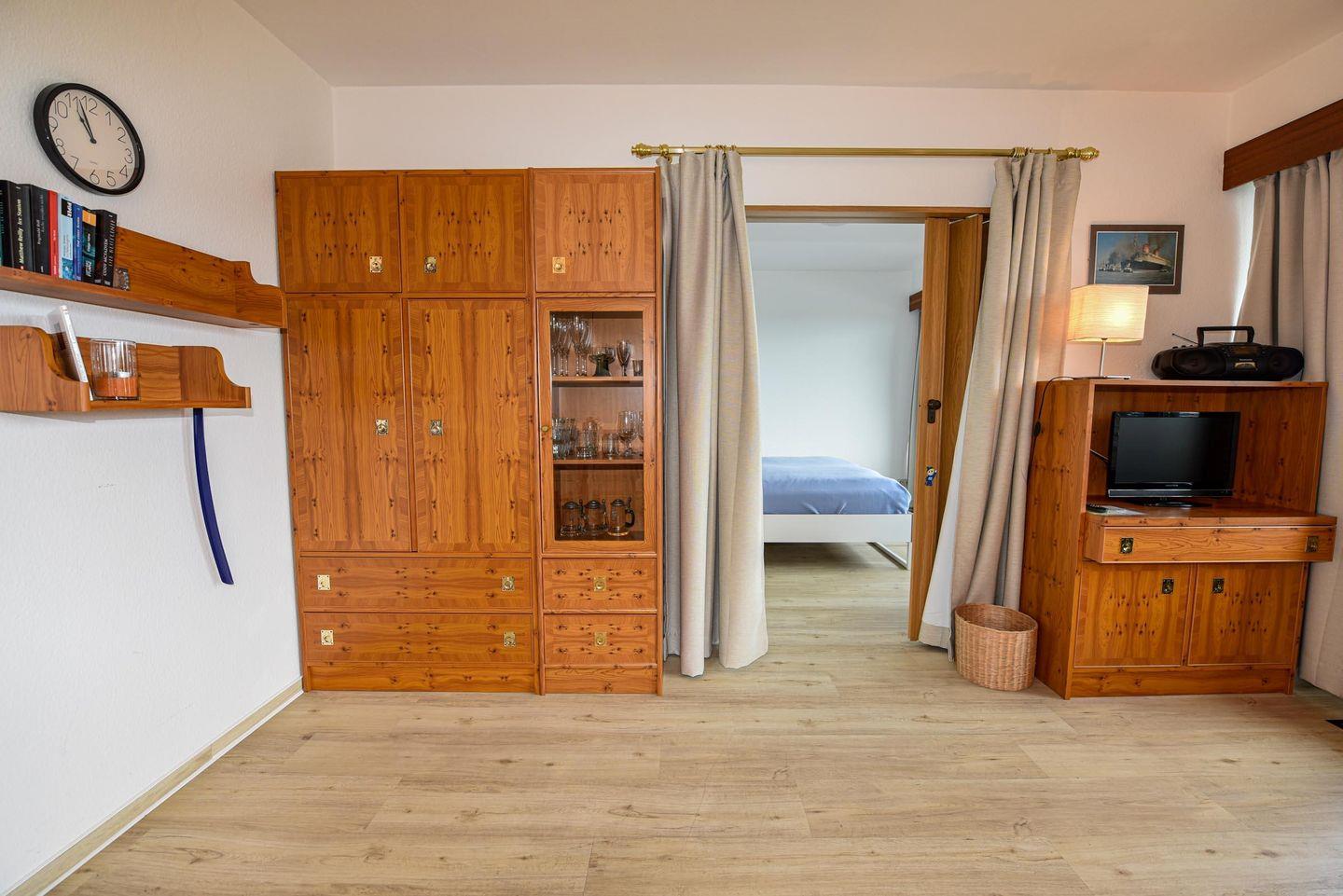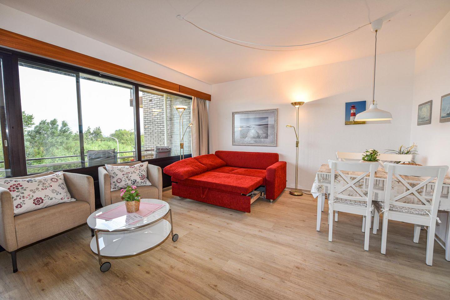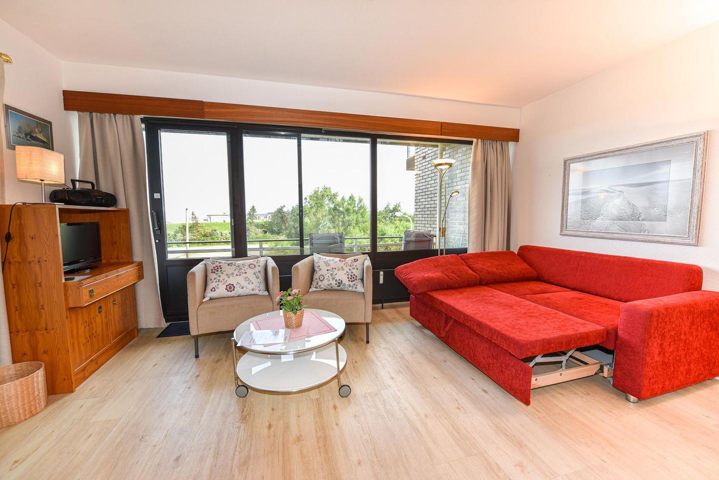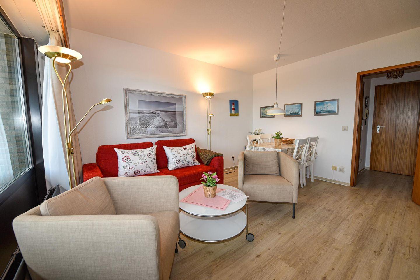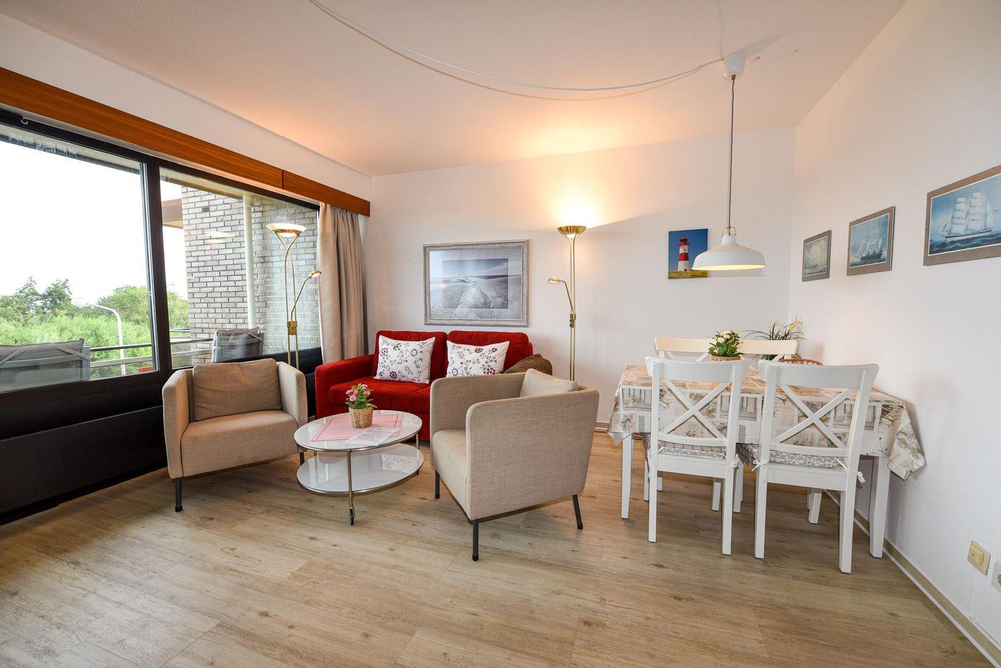 2-Zimmer Appartement mit Sicht auf den Weltschifffahrtsweg und eigenem Strandkorb (01.05.-30.09.) am Sandstrand. Das im 2. OG gelegene Appartement mit großem Balkon ist für bis zu 4 Personen ausgelegt. Im Wohnraum befinden sich ein Schlafsofa und zwei Sessel, sowie ein Esstisch mit 4 Stühlen. Das Schlafzimmer ist mit einem Ehebett ausgestattet. In der kleinen Küche können Sie sich selbst verpflegen. Duschbad/WC. Der Tiefgaragenstellplatz hat eine Einstellhöhe von 149 cm.