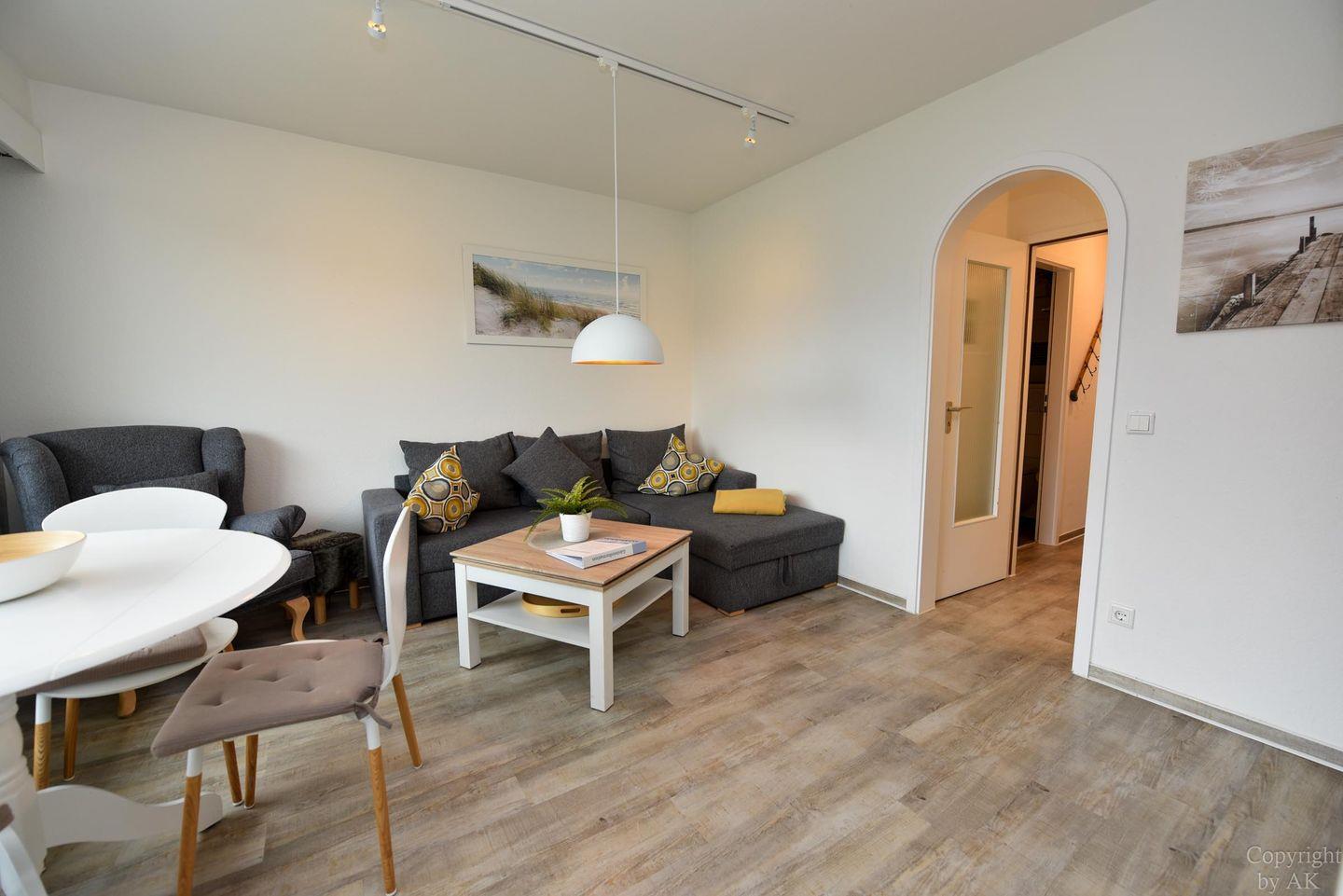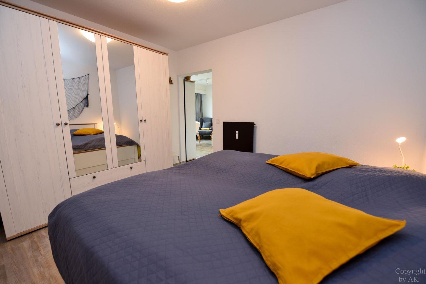 Gemütliches und frisch (2019) renoviertes 3-Zimmer Appartement im 1. OG mit Südbalkon. Im Wohn- und Essbereich befindet sich unter anderem ein Schlafsofa und ein bequemer Sessel der zum entspannen und TV schauen oder lesen einlädt. Dazu ist der Raum mit einem Esstisch ausgestattet. Der durch eine Falttür vom Wohnraum getrennte Schlafraum verfügt über ein Ehebett und einen großen Kleiderschrank. Im zweiten Schlafraum befindet sich ein freundliches Etagenbett und ein Kleiderschrank, sowie ein Tisch mit 2 Stühlen. In der separaten und gut ausgestatteten Küchennische ist ein Geschirrspüler und eine Mikrowelle untergebracht. Das moderne Bad mit geräumiger Dusche vervollständigt dieses schöne Appartement im Haus "Jan am Strand". Der dazugehörige und kostenlose Tiefgaragenstellplatz hat eine Einstellhöhe von 149 cm.
