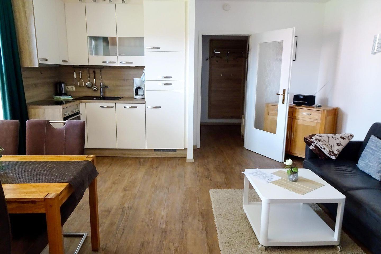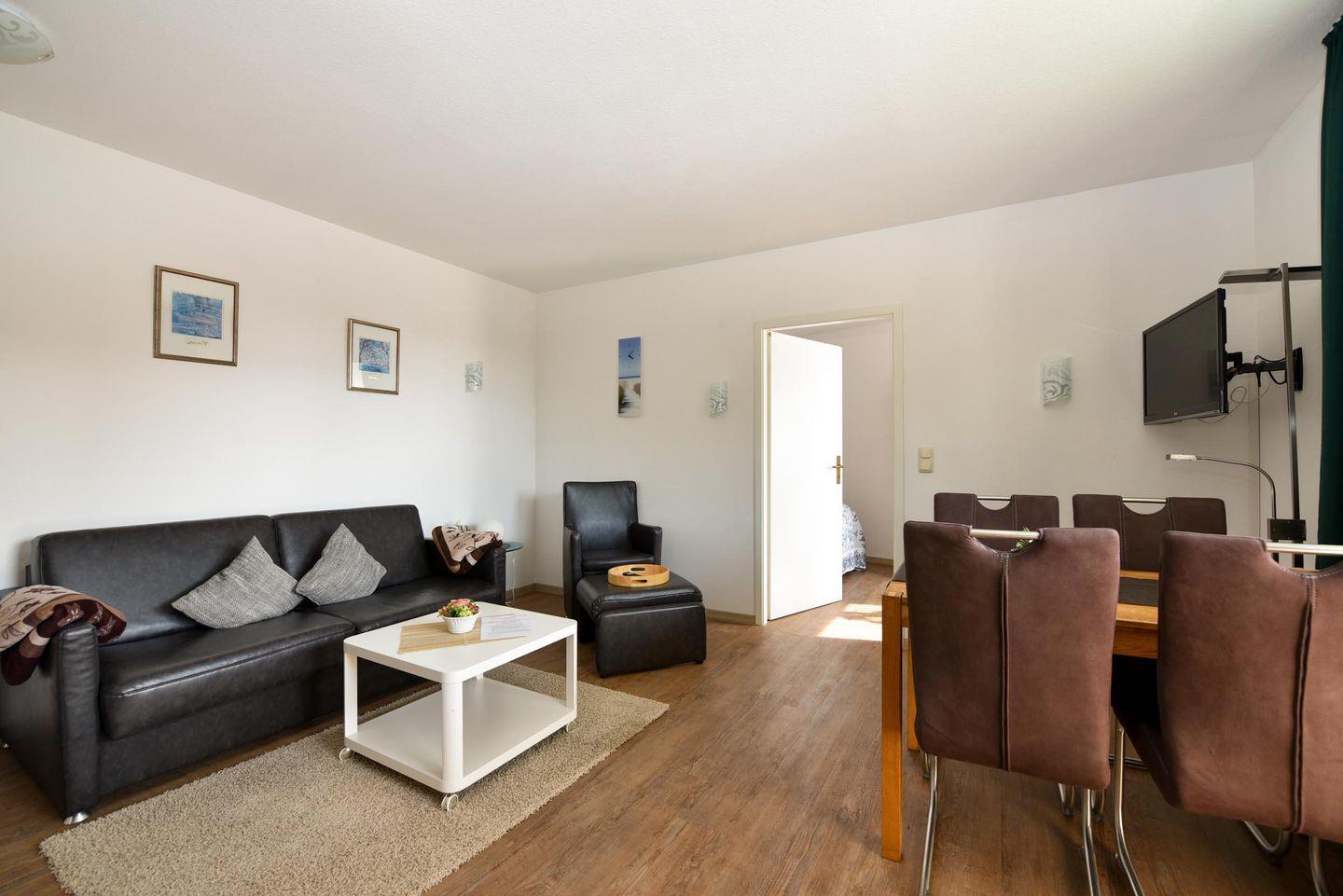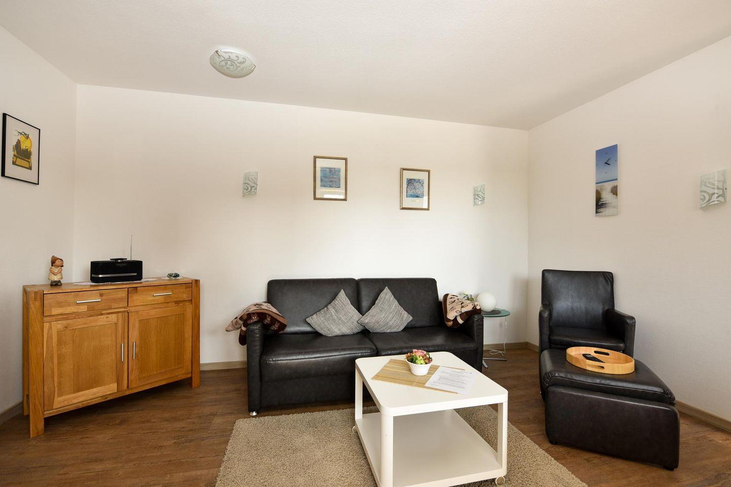 Im Wohnbereich erwartet Sie ein komfortables, modernes Schlafsofa, ein gemütlicher Sessel sowie ein Esstisch mit Platz für vier Personen. Das Schlafzimmer ist behaglich mit einem hochwertigen Boxspringbett eingerichtet, um Ihnen optimale Erholung zu gewährleisten. Zudem steht Ihnen ein Duschbad/WC zur Verfügung.