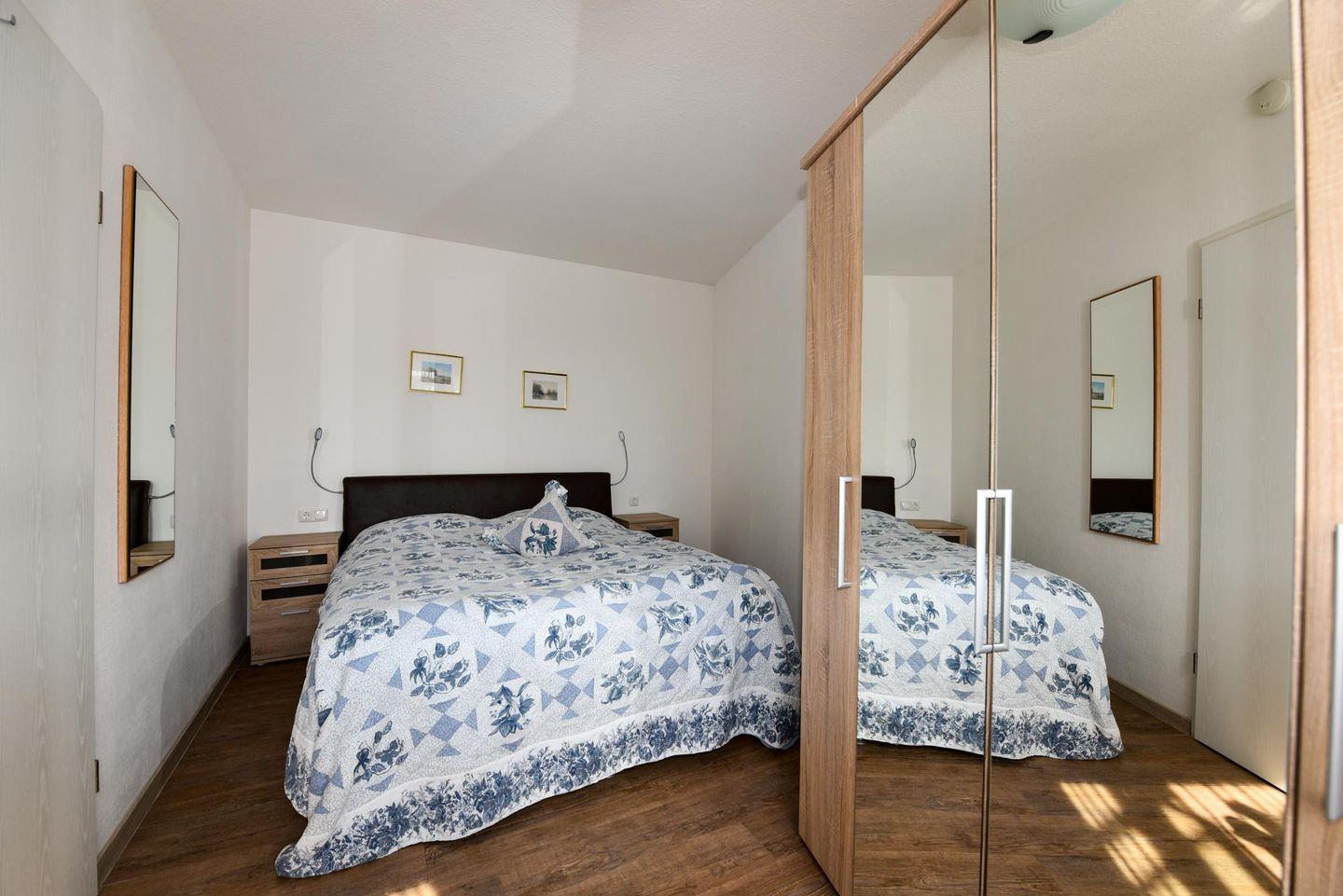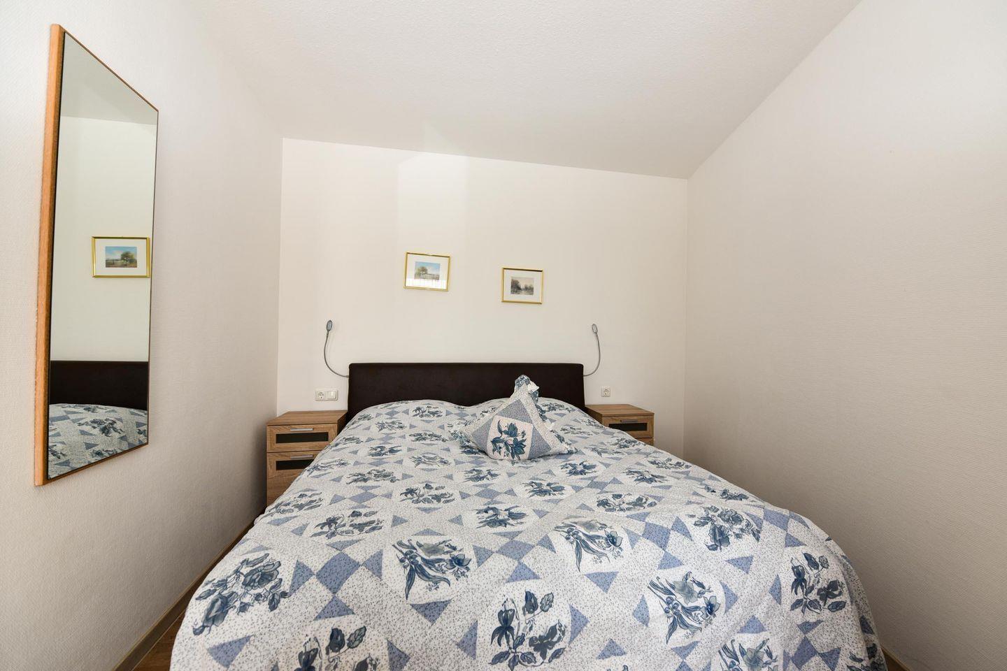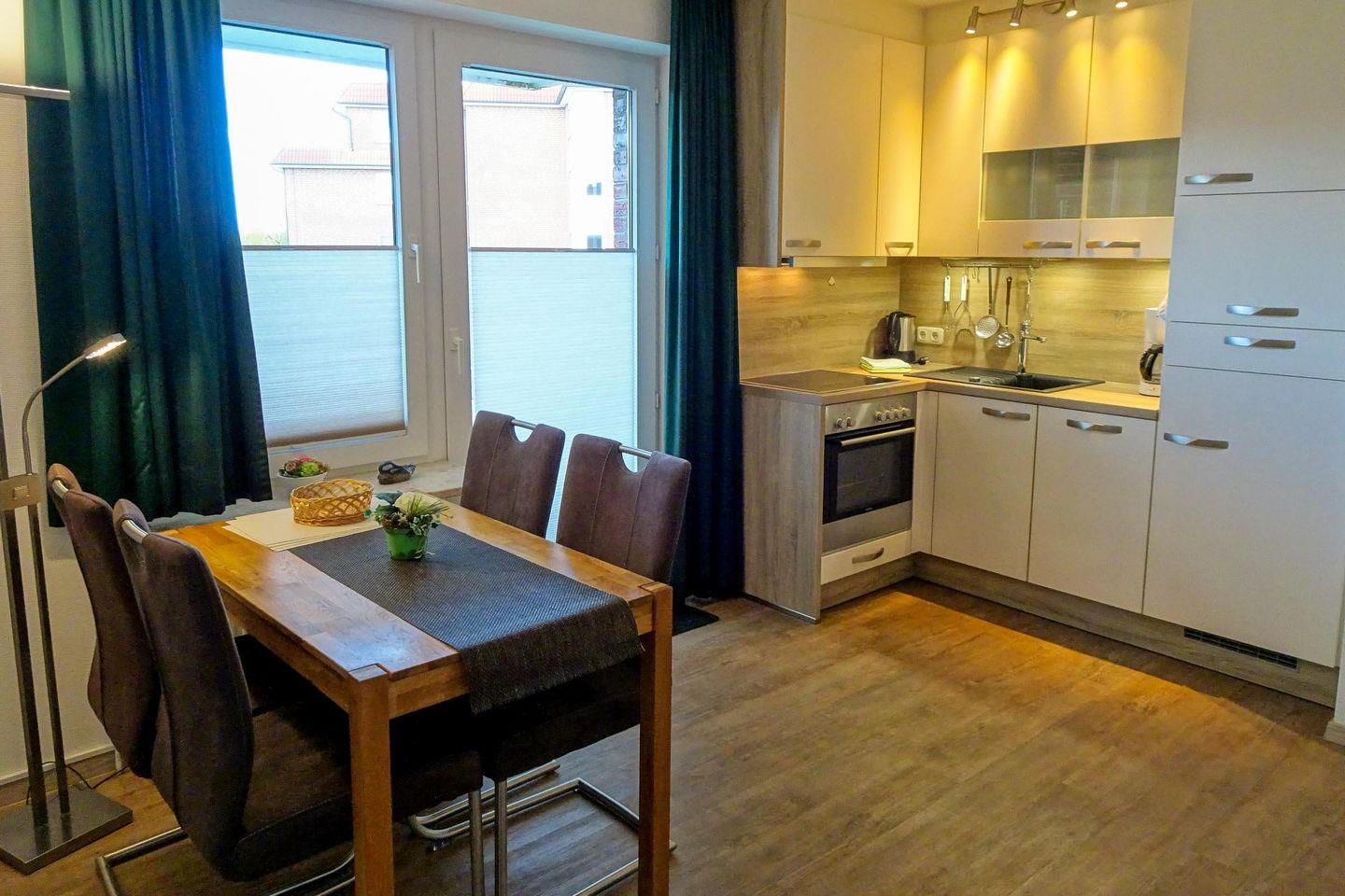 Im Wohnbereich erwartet Sie ein komfortables, modernes Schlafsofa, ein gemütlicher Sessel sowie ein Esstisch mit Platz für vier Personen. Das Schlafzimmer ist behaglich mit einem hochwertigen Boxspringbett eingerichtet, um Ihnen optimale Erholung zu gewährleisten. Zudem steht Ihnen ein Duschbad/WC zur Verfügung.