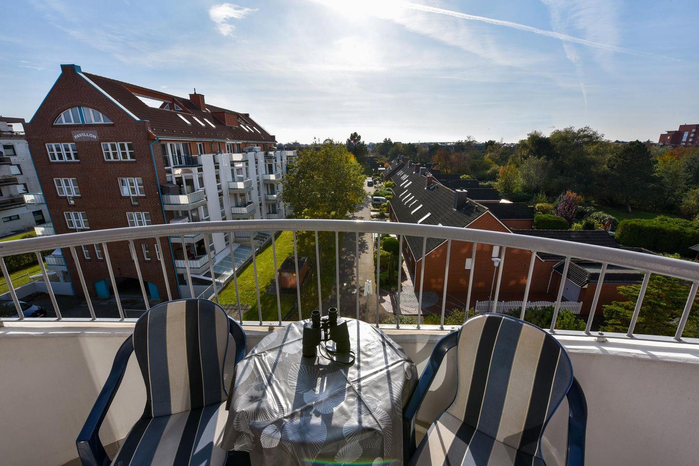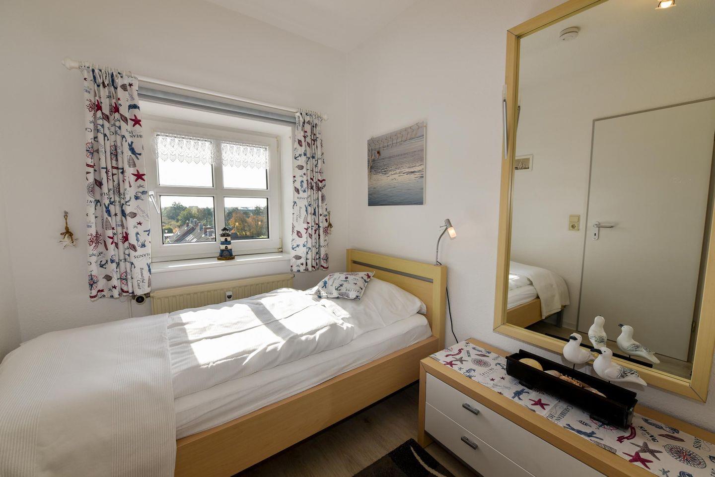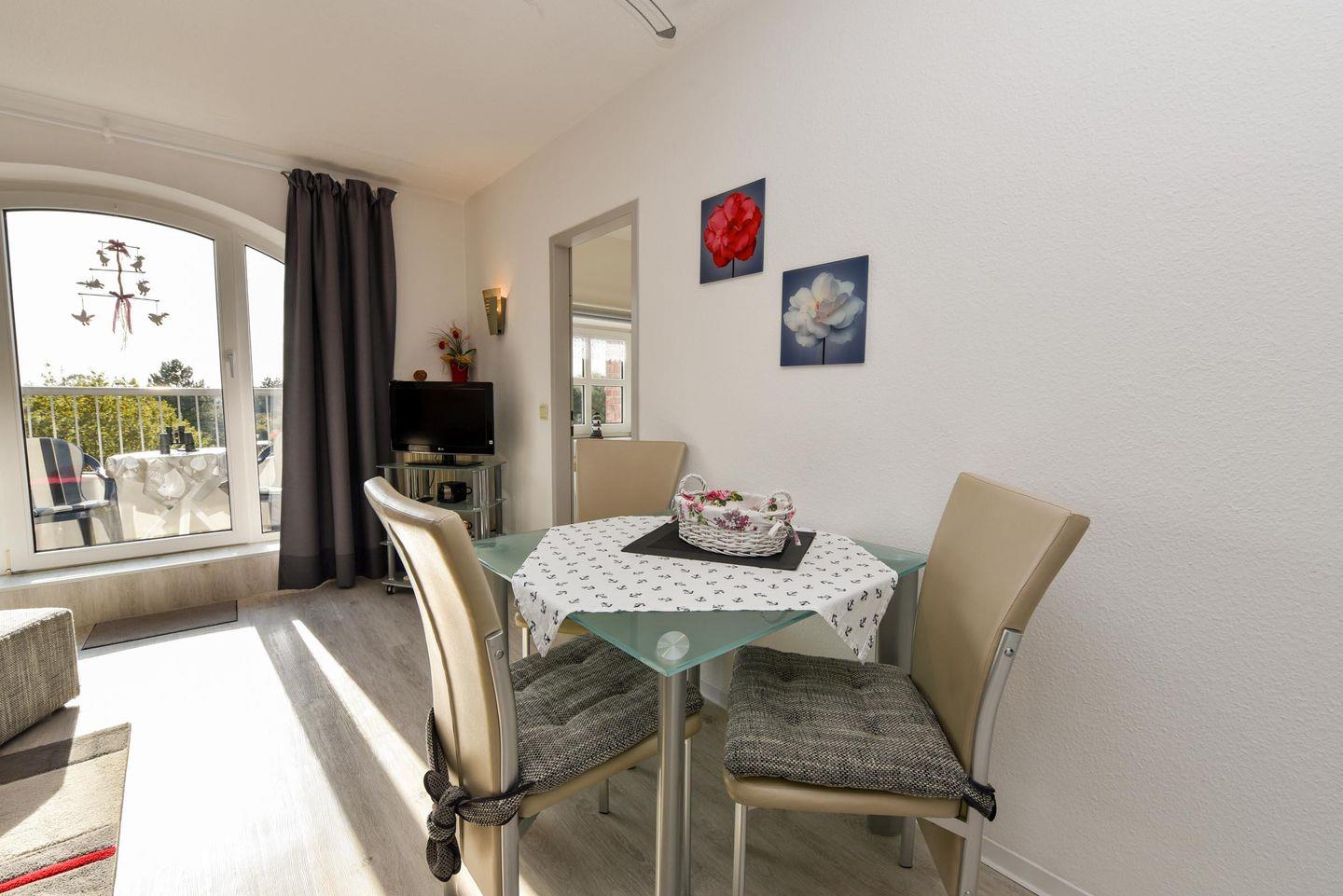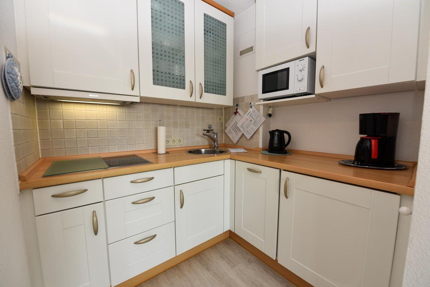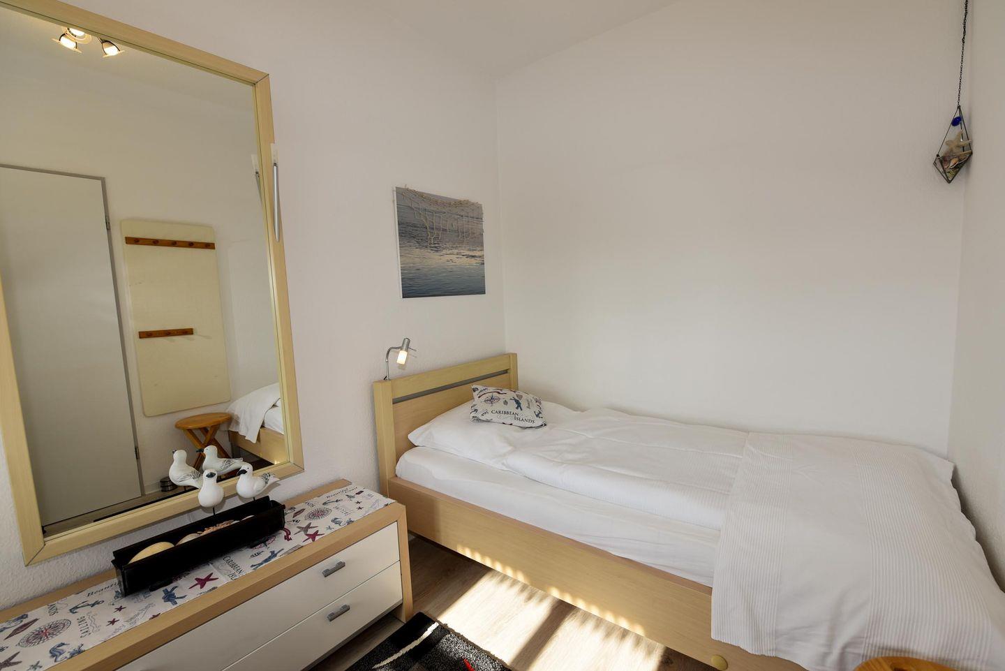 Schönes 2-Zimmer Appartement im 3. OG. In dem hellen Wohnraum befindet sich u.a. eine offene und gut ausgestattete Küchenzeile mit Mikrowelle und Geschirrspülautomat, sowie eine Schlafcouch mit einem Sessel, ein Couchtisch und ein Esstisch mit Stühlen. Im Schlafraum befinden sich zwei Einzelbetten die nicht zusammen gestellt werden können. Beide Räume liegen zur Südseite. Es gibt einen kleinen Balkon, auf welchen man über eine Stufe gelangen kann. Dusch-Wannen-Bad/WC., SAT-TV. Zu dem Appartement gehört natürlich auch ein kostenloser PKW Stellplatz.