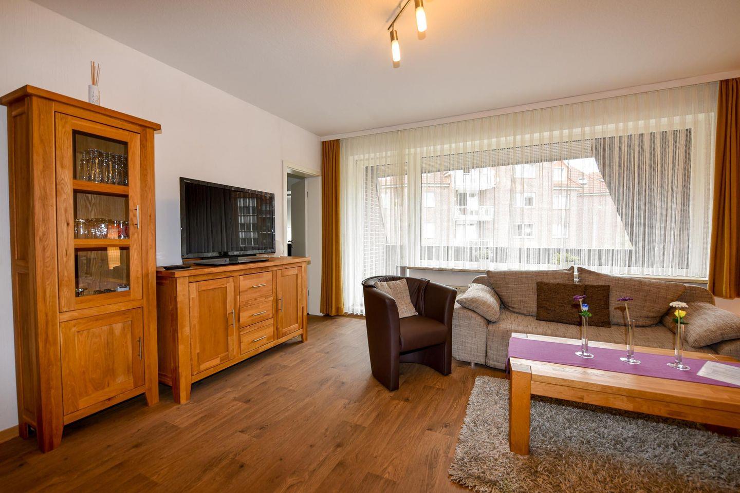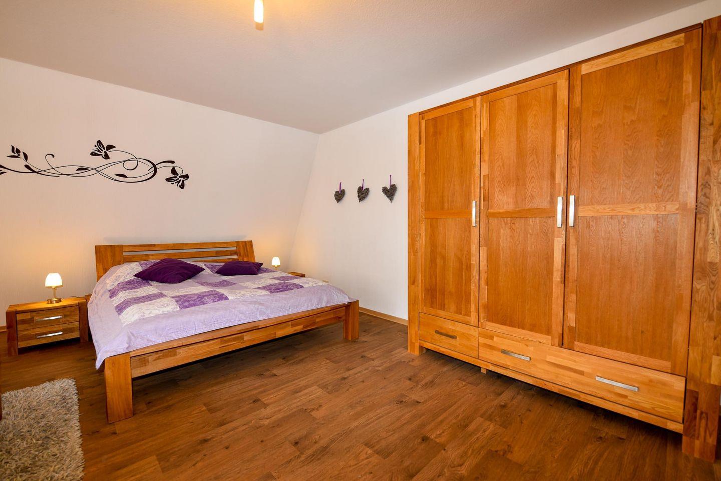 1-Zimmer-Ferienwohnung im 1. OG des Hauses LUV mit WLAN. 1 Wohn-Schlafraum mit Ehebett u. moderner Schlafcouchgarnitur. Großer Flachbildschirm, CD-Player, 1 Küchenraum mit Esstisch, 4 Stühle u. Einbauküche mit Geschirrspülautomat, Mikrowelle und Kühl-Gefrierschrank. Im Bad eine Duschbad mit WC, möblierter West-Balkon. Spielrasen, Spielgerät und Sandkiste auf dem Grundstück, PKW-Stellplatz neben dem Hauseingang. Schwimmbadnutzung kostenfrei.