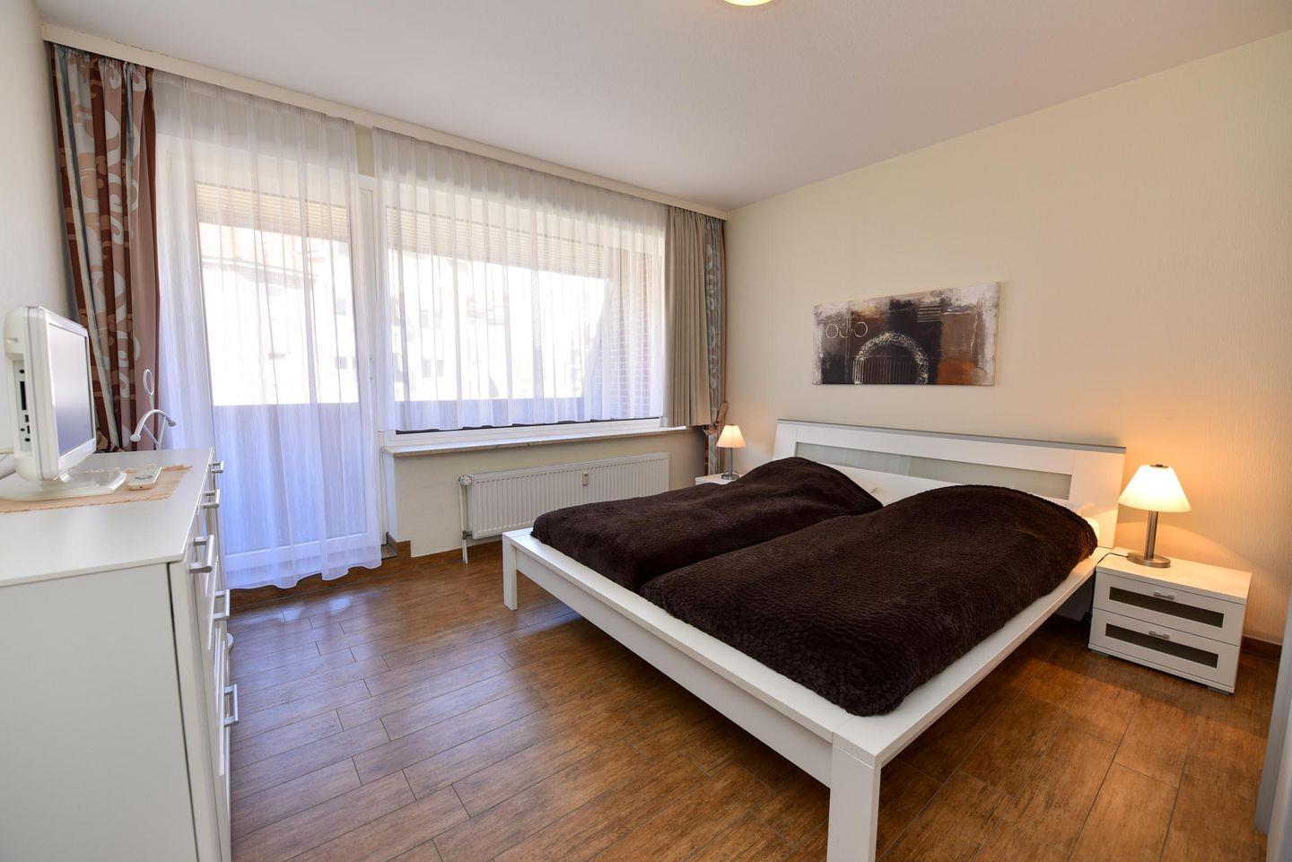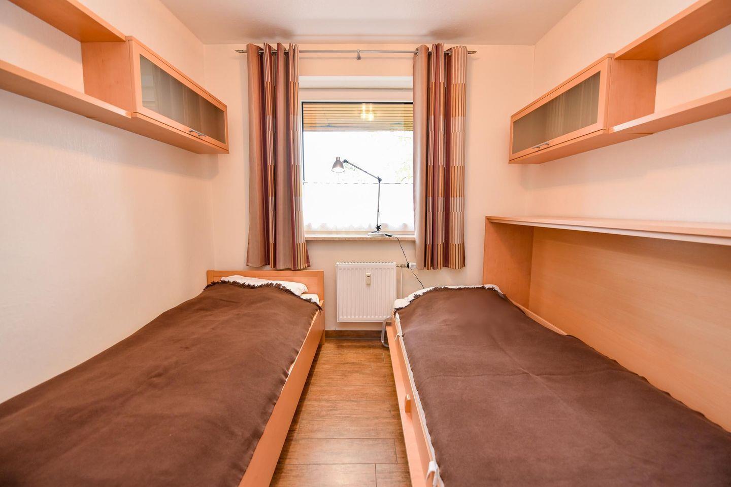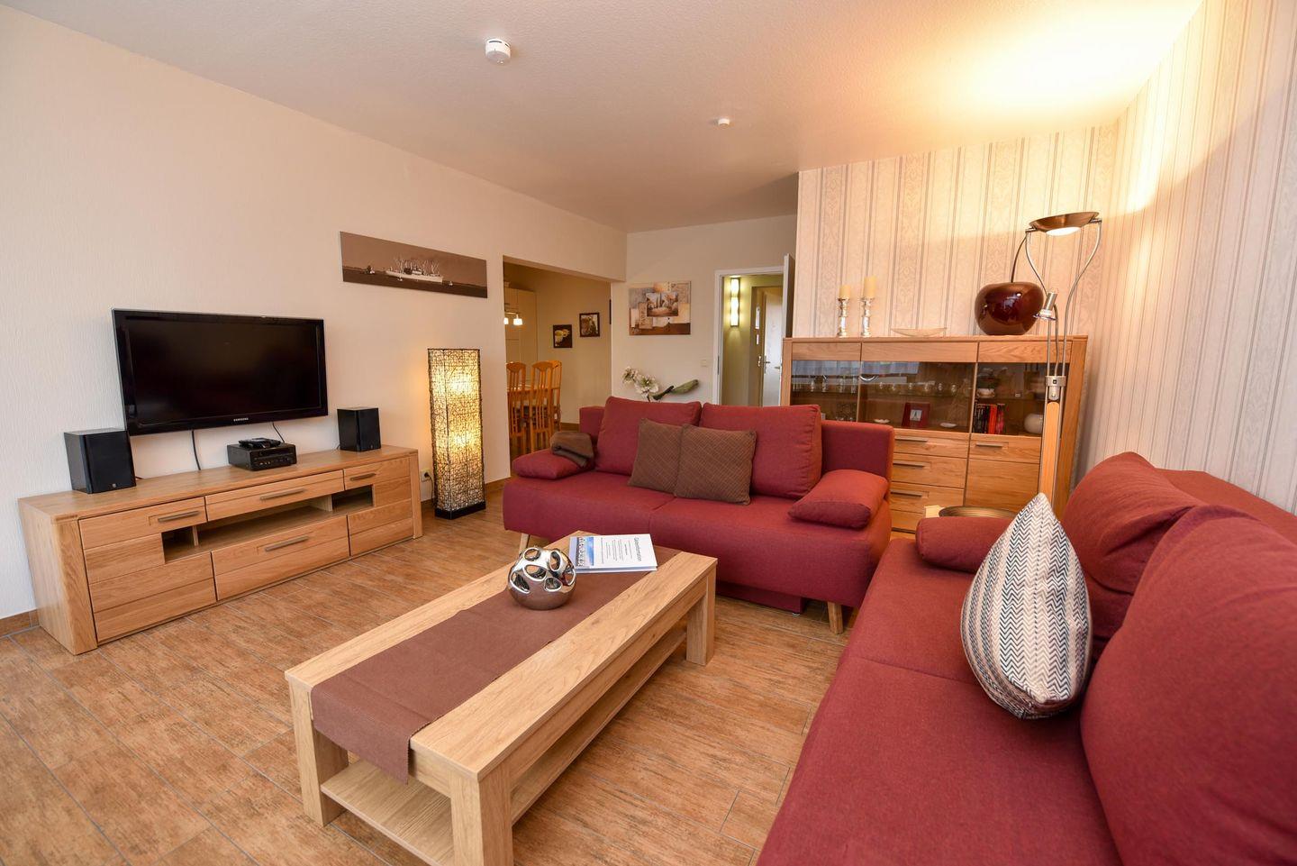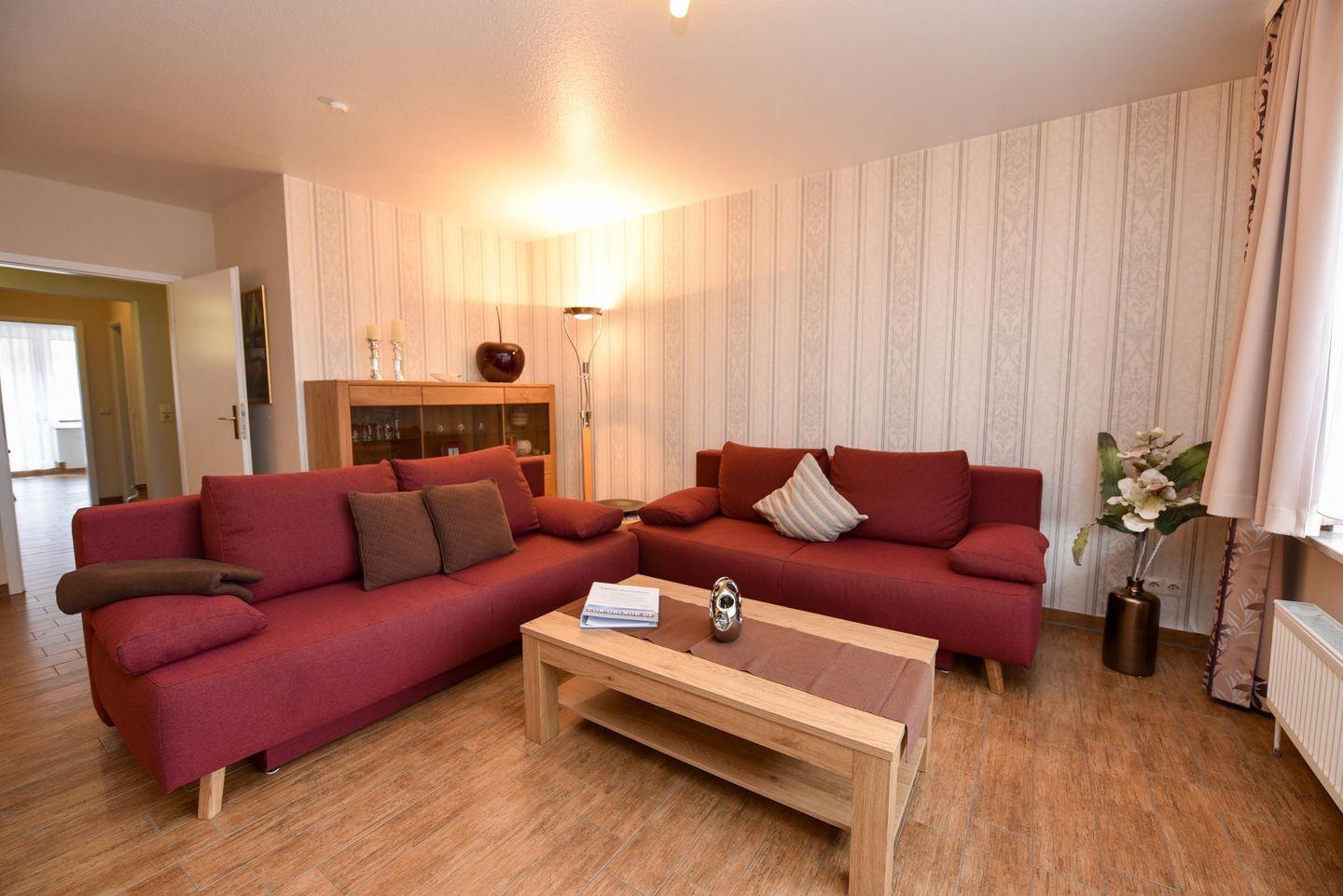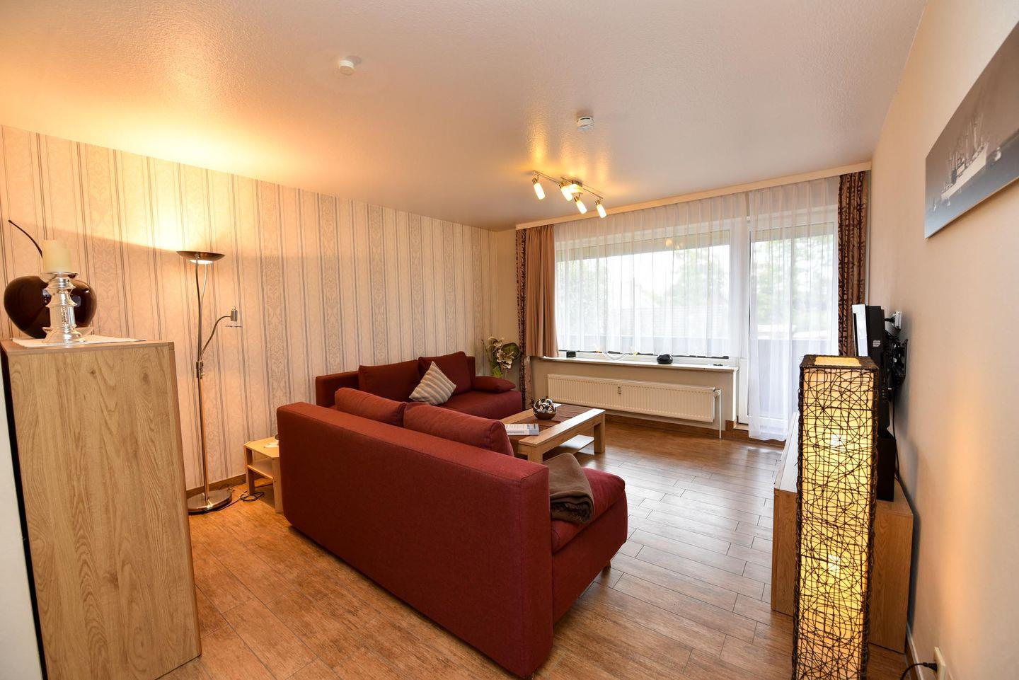 3-Zimmer-Wohlfühl-Ferienwohnung im 1. OG des Hauses LUV. Diese 3-Zimmer Ferienwohnung ist für bis zu 6 Personen ausgestattet und verfügt über 2 Bäder (1x WC u. Dusche / 1x WC u. Wanne). Es gibt einen Wohn-/Essraum und 2 Schlafräume sowie ein separater Küchenraum mit moderner Einbauküche, inklusive diversen E-Geräten. Im Wohnraum befindet sich eine Wohnschlafcouch. Das Schlafzimmer ist mit einem Ehebett ausgestattet und verfügt zudem über einen eigenen Balkon. Das weitere Schlafzimmer verfügt über zwei Einzelbetten und hat zudem Platz für ein zusätzliches Reisebett. Kabel-TV im Wohn- als auch im Schlafraum. Multi-Mediaanlage im Wohnzimmer. Die Wohnung verfügt über einen jeweils möblierten West- und ein Ostbalkon. Es gibt in der Anlage einen Spielrasen sowie Spielgerät. Auch gehört ein Garagenstellplatz dazu, welcher kostenfrei genutzt werden kann. Das Schwimmbad im Nebenhaus kann kostenfrei genutzt werden!