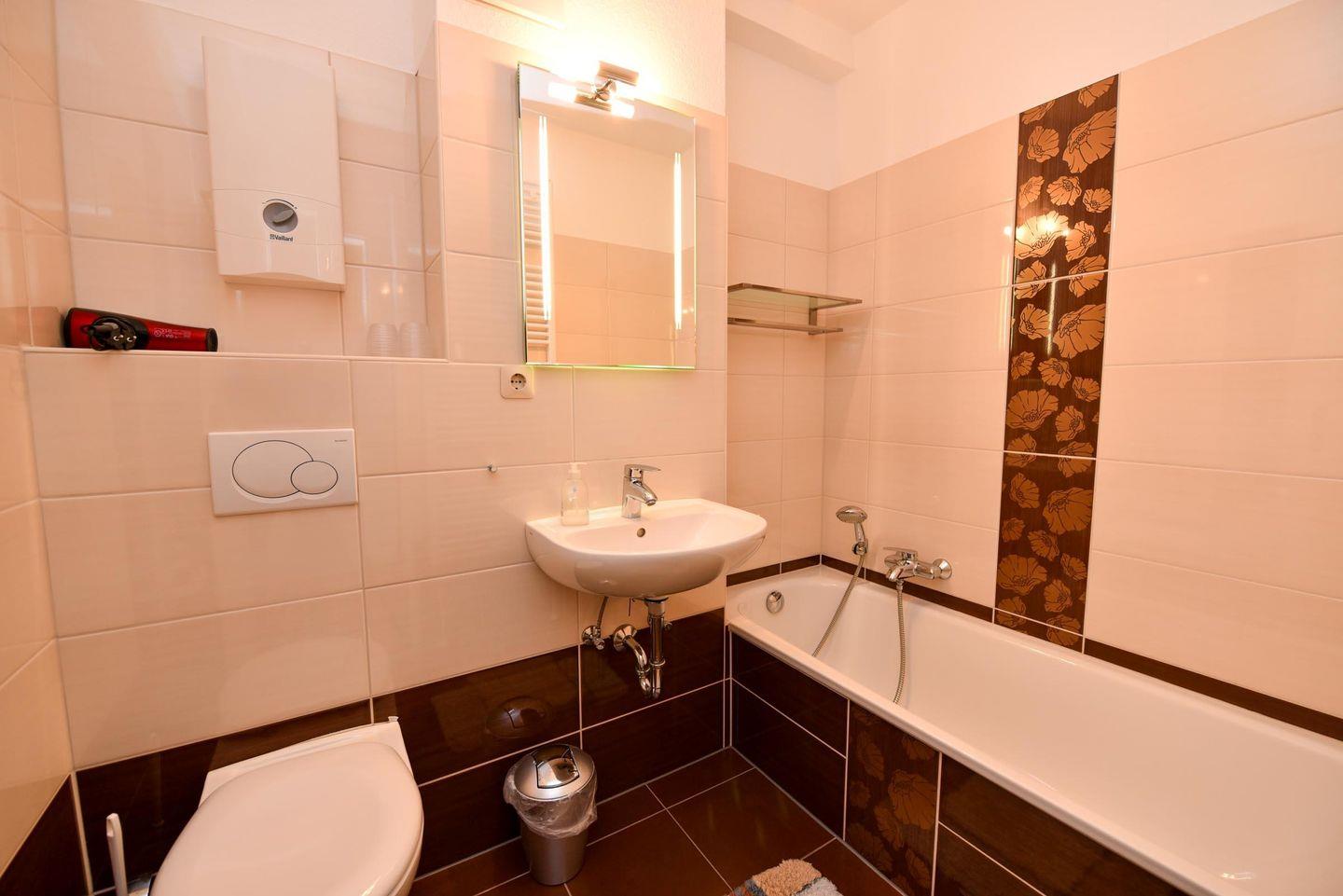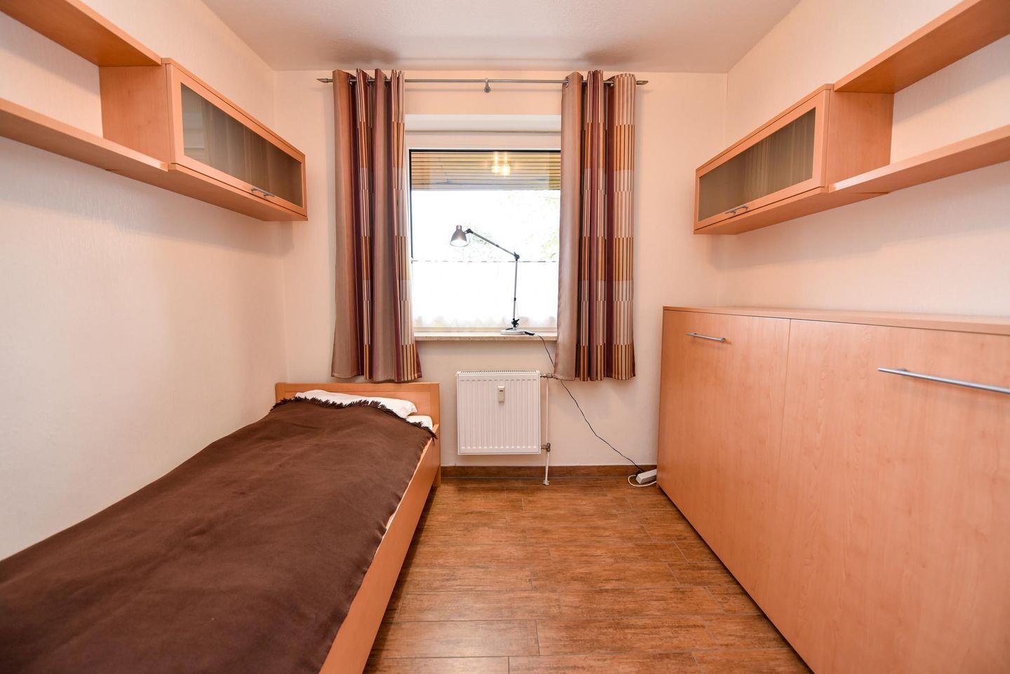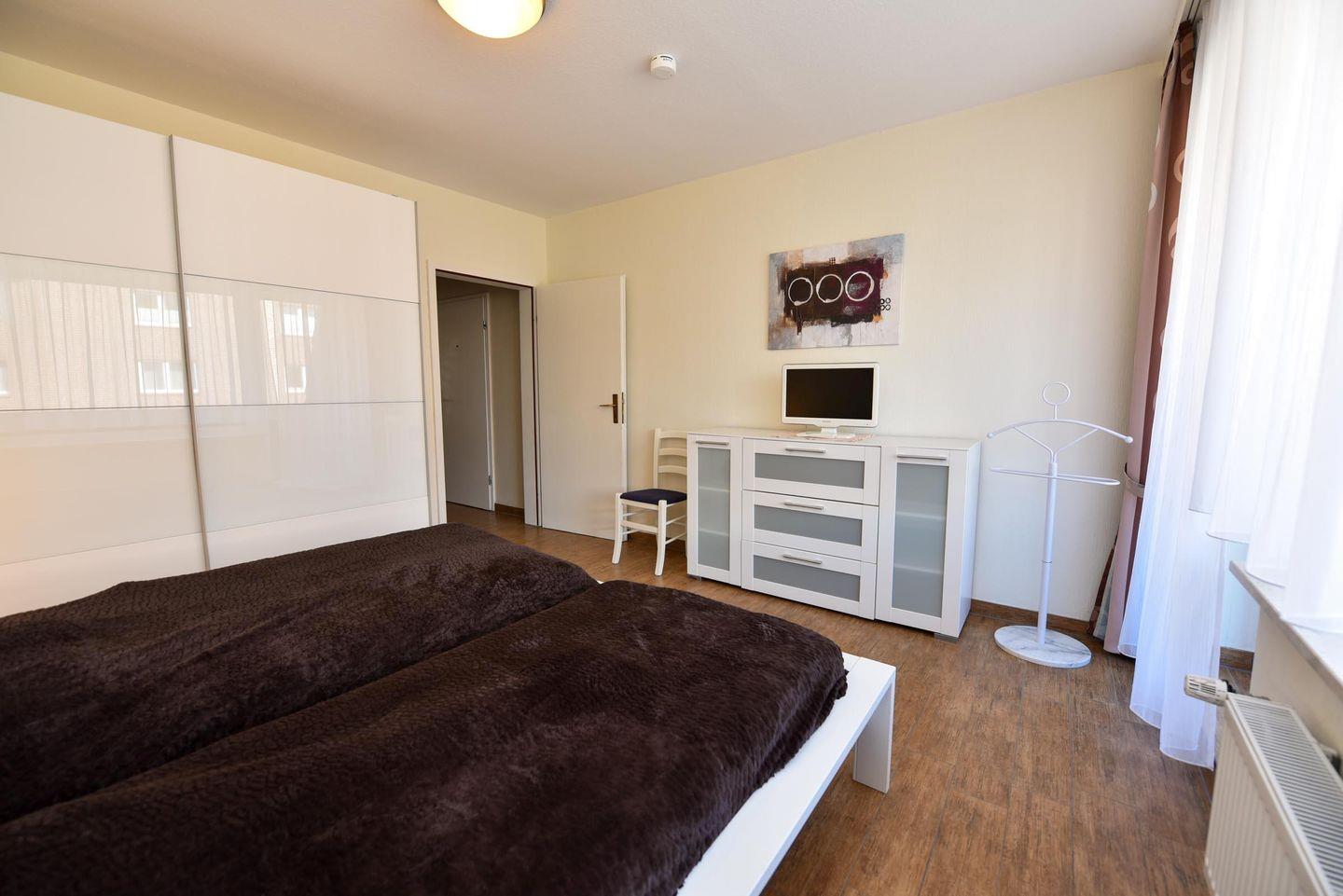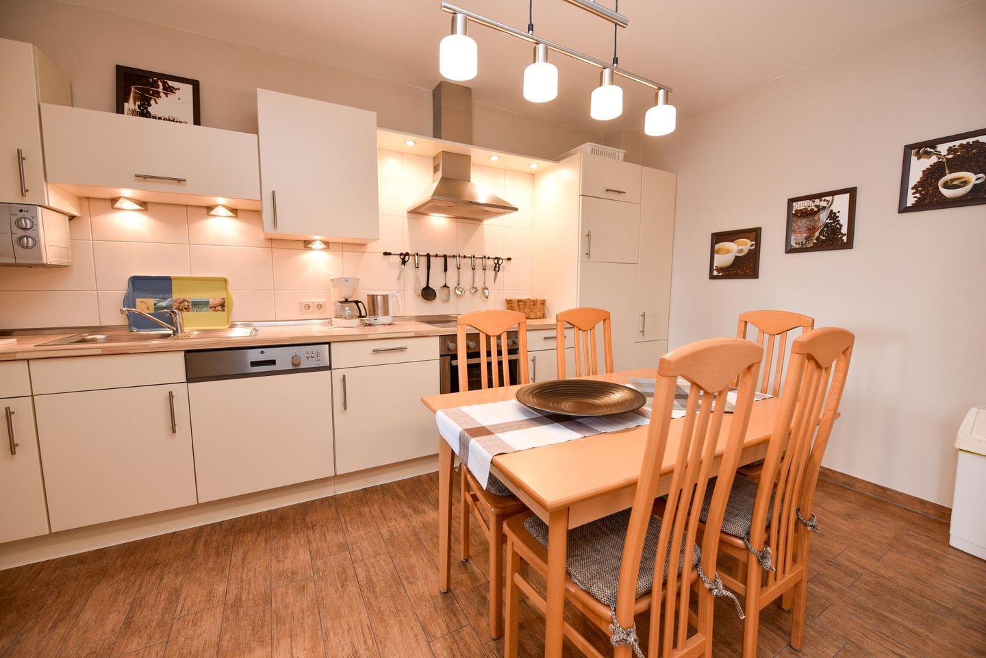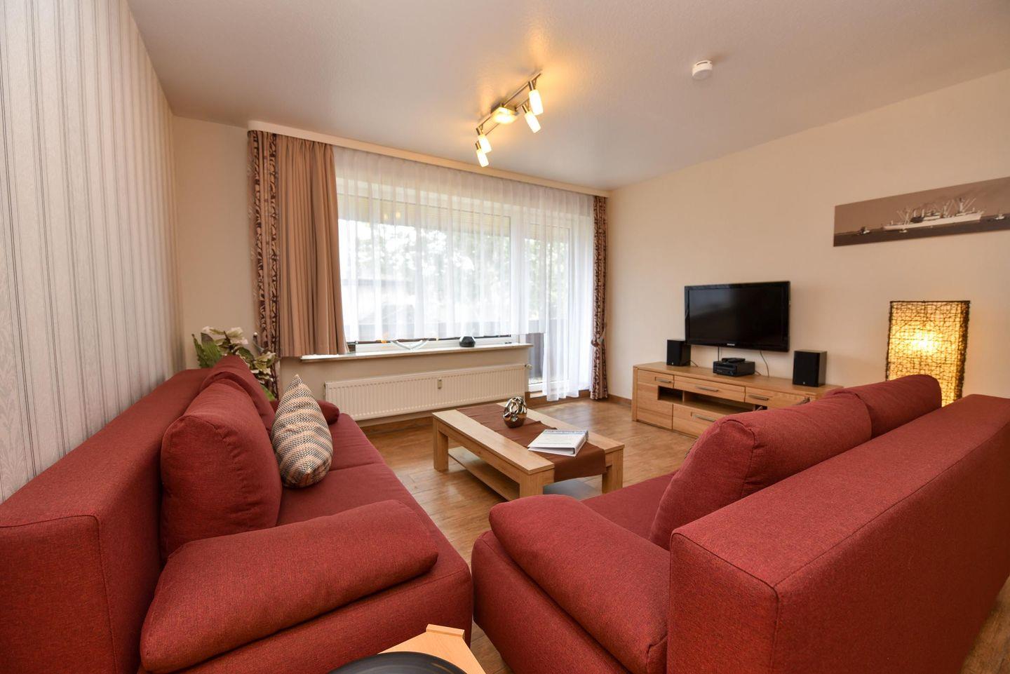 3-Zimmer-Wohlfühl-Ferienwohnung im 1. OG des Hauses LUV. Diese 3-Zimmer Ferienwohnung ist für bis zu 6 Personen ausgestattet und verfügt über 2 Bäder (1x WC u. Dusche / 1x WC u. Wanne). Es gibt einen Wohn-/Essraum und 2 Schlafräume sowie ein separater Küchenraum mit moderner Einbauküche, inklusive diversen E-Geräten. Im Wohnraum befindet sich eine Wohnschlafcouch. Das Schlafzimmer ist mit einem Ehebett ausgestattet und verfügt zudem über einen eigenen Balkon. Das weitere Schlafzimmer verfügt über zwei Einzelbetten und hat zudem Platz für ein zusätzliches Reisebett. Kabel-TV im Wohn- als auch im Schlafraum. Multi-Mediaanlage im Wohnzimmer. Die Wohnung verfügt über einen jeweils möblierten West- und ein Ostbalkon. Es gibt in der Anlage einen Spielrasen sowie Spielgerät. Auch gehört ein Garagenstellplatz dazu, welcher kostenfrei genutzt werden kann. Das Schwimmbad im Nebenhaus kann kostenfrei genutzt werden!