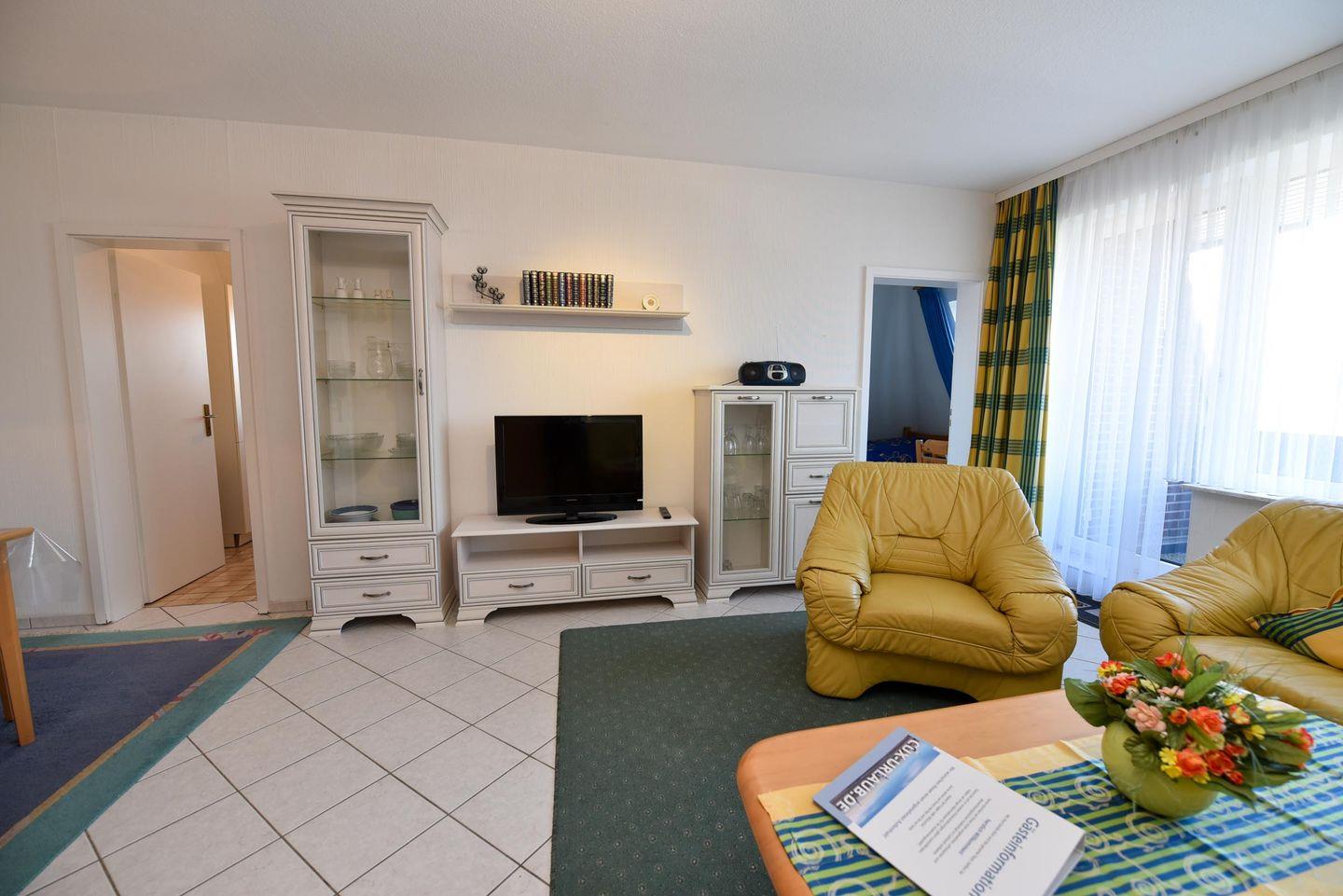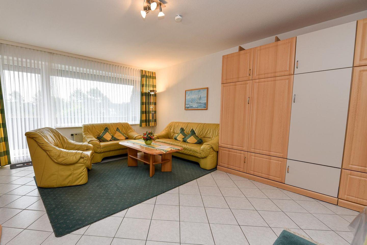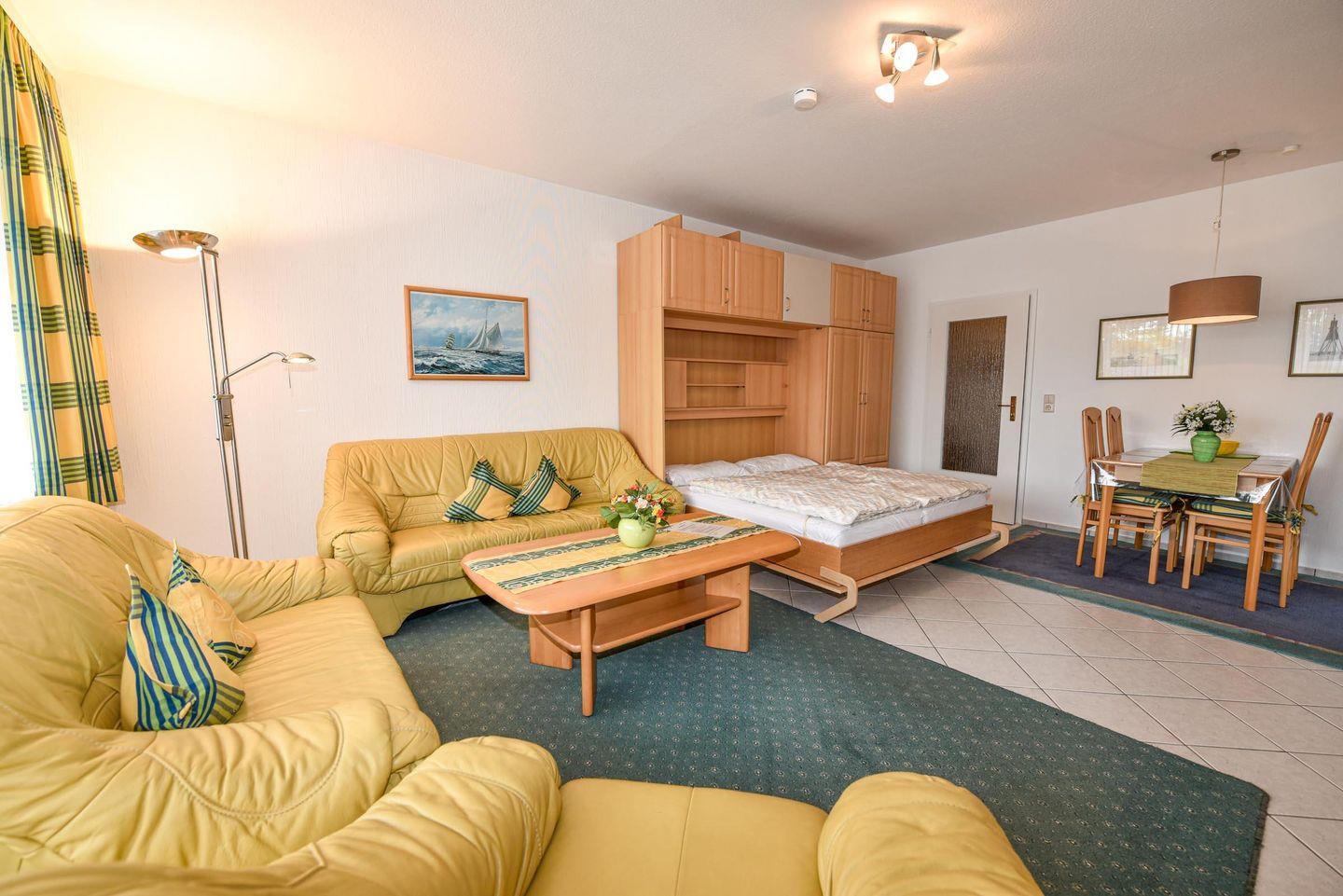 2-Zimmer Ferienwohnung im 1. OG im Haus LEE mit WLAN. Sehr schöne und allergikerfreundlich gefließte Wohnung. Im Wohn- u. Essraum befindet sich u.a. auch ein Schrankbett und eine gemütliche Couchgarnitur, sowie ein Esstisch mit vier Stühlen. Es gibt Kabel-TV. Der Schlafraum ist mit einem Einzelbett und einem Etagenbett ausgestattet und bietet zusätzlich Platz für ein Kinder-Reisebett. In der der gut ausgestatteten Küche finden Sie eine Mikrowelle, einen Backofen und einen Geschirrspüler. Duschbad/WC. Möblierter Südost-Balkon. Garagenplatz. Schwimmbadnutzung kostenfrei!
