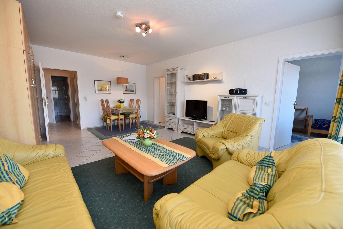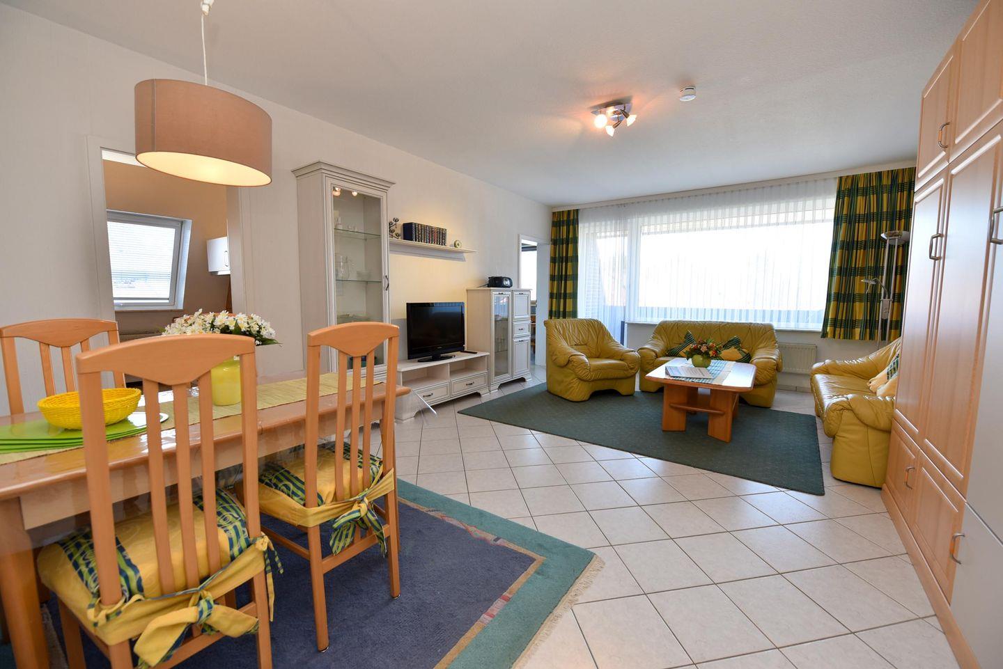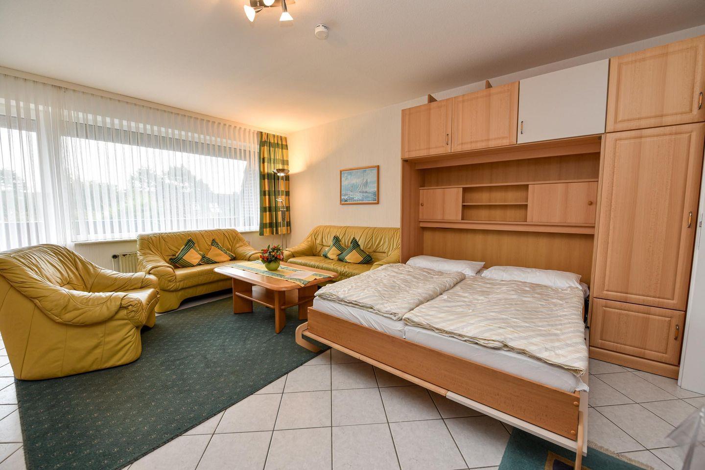 2-Zimmer Ferienwohnung im 1. OG im Haus LEE mit WLAN. Sehr schöne und allergikerfreundlich gefließte Wohnung. Im Wohn- u. Essraum befindet sich u.a. auch ein Schrankbett und eine gemütliche Couchgarnitur, sowie ein Esstisch mit vier Stühlen. Es gibt Kabel-TV. Der Schlafraum ist mit einem Einzelbett und einem Etagenbett ausgestattet und bietet zusätzlich Platz für ein Kinder-Reisebett. In der der gut ausgestatteten Küche finden Sie eine Mikrowelle, einen Backofen und einen Geschirrspüler. Duschbad/WC. Möblierter Südost-Balkon. Garagenplatz. Schwimmbadnutzung kostenfrei!