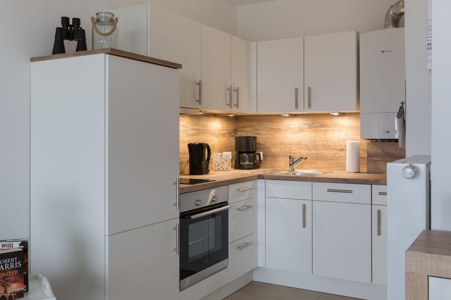 Haus Atlantic in Döse, Fewo im 4. OG, bis 2 Pers., ca. 35 qm Größe, kombiniertes Wohn-/Schlafzimmer mit Schrankbett , Bettwäsche und Handtücher nicht inklusive, Küchenzeile mit 2-Platten-Ceranfeld, Mikrowelle, Backofen und Geschirrspüler, Dusche/WC, kostenloser WLAN-Anschluss, Pkw-Garagenstellplatz, keine Haustiere erlaubt, Nichtraucherwohnung, Außenbereich für Fahrräder (nicht überdacht und nicht abschließbar).