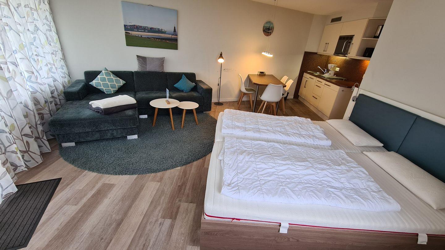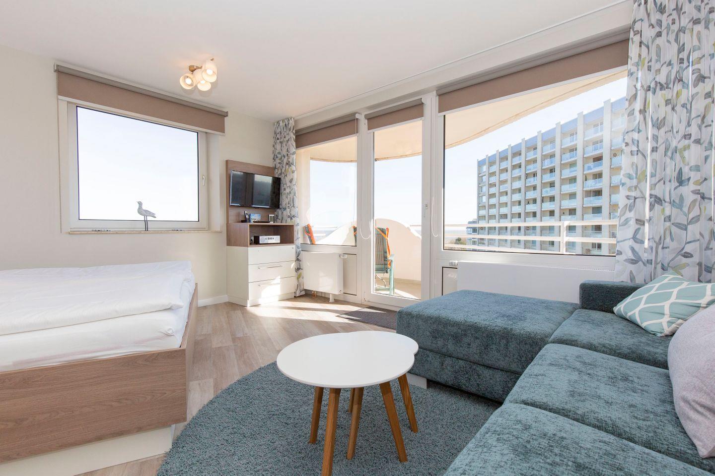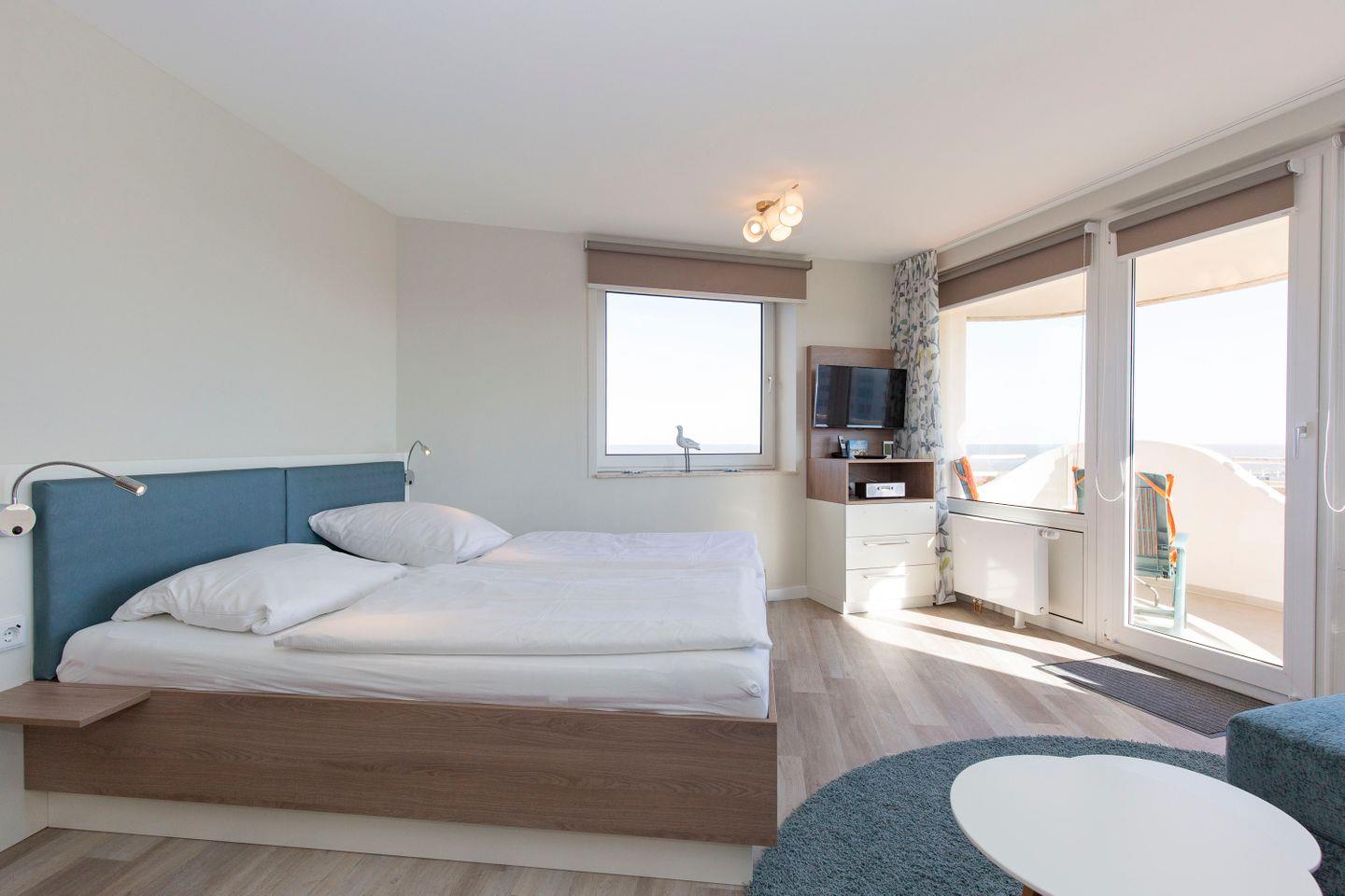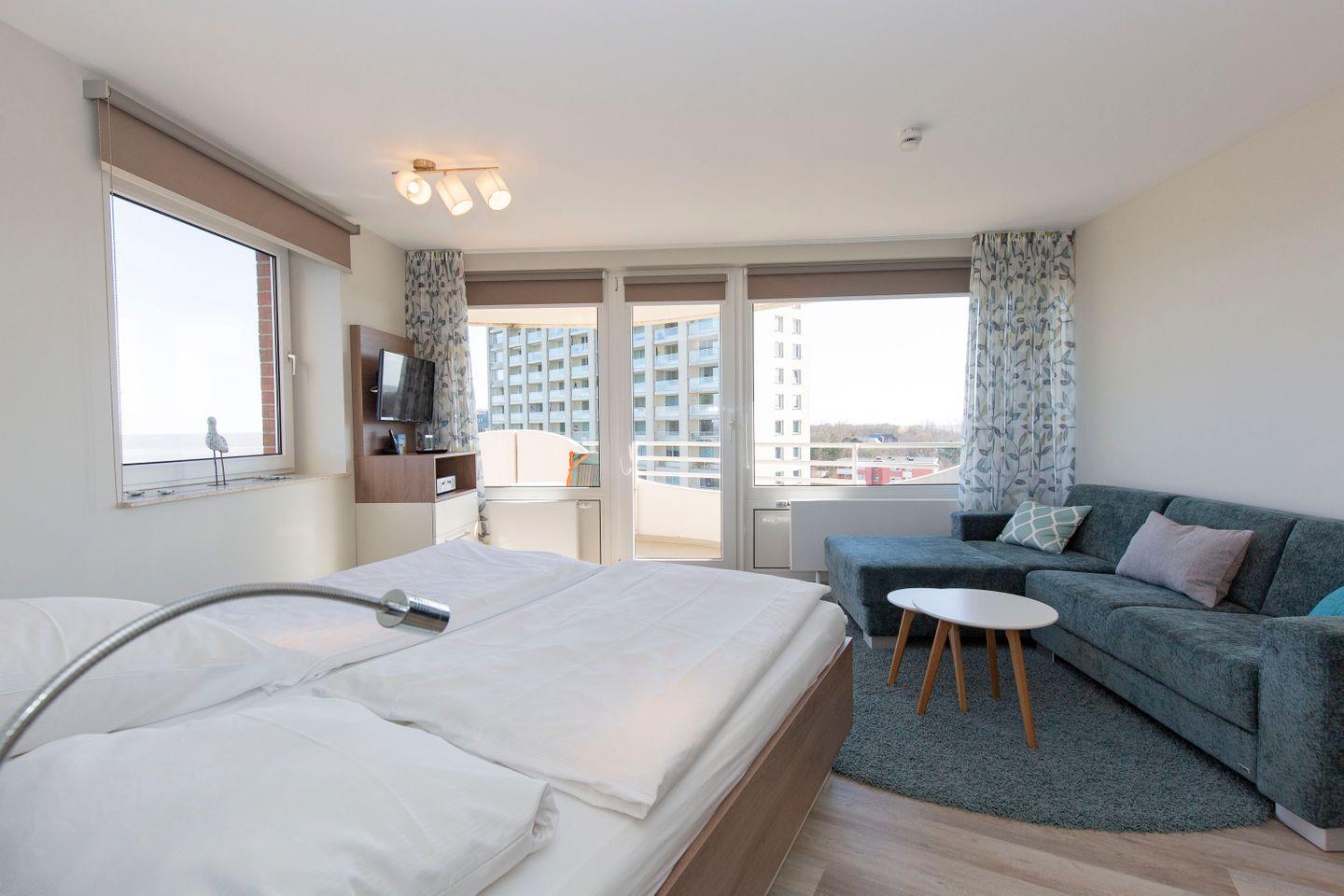 Haus "Lord Nelson", Typ 1, App.-Nr. "720", bis 3 Pers., 7.te Etage, ca. 43 qm, Nord/Ostseite, Meerblick Richtung Nordsee, seitlicher Meerblick Richtung Elbe, Wohnbereich mit feststehendem Doppelbett, sep. kleines Schlafzimmer mit Einzelbett, Dusche/WC, Küchenzeile mit Geschirrspüler/ Mikrowelle, 4-Platten-Ceranfeld, Telefon, Kabel-TV, kostenl. W-Lan Zugang, Balkon, Tiefgaragenstellplatz, Nichtraucherappartement, keine Haustiere erlaubt, Strandkorb im Sommer 2026.