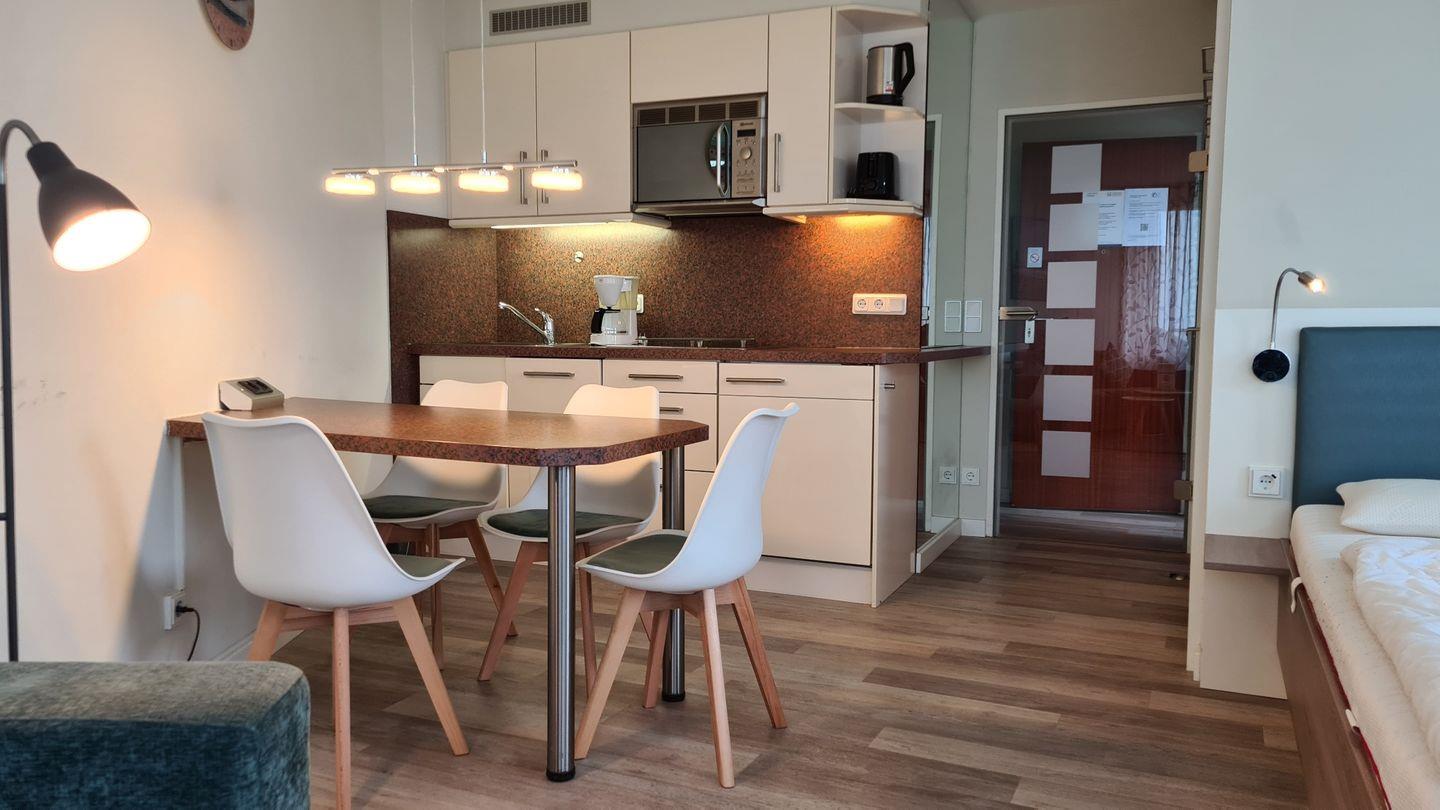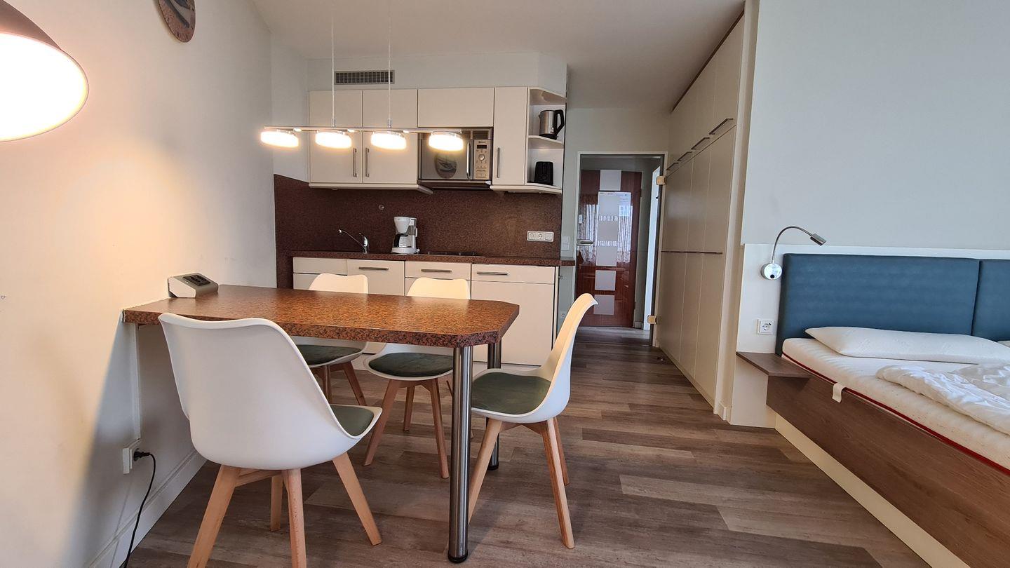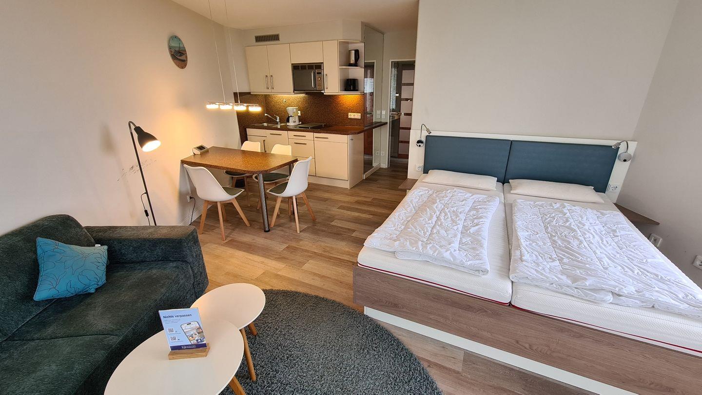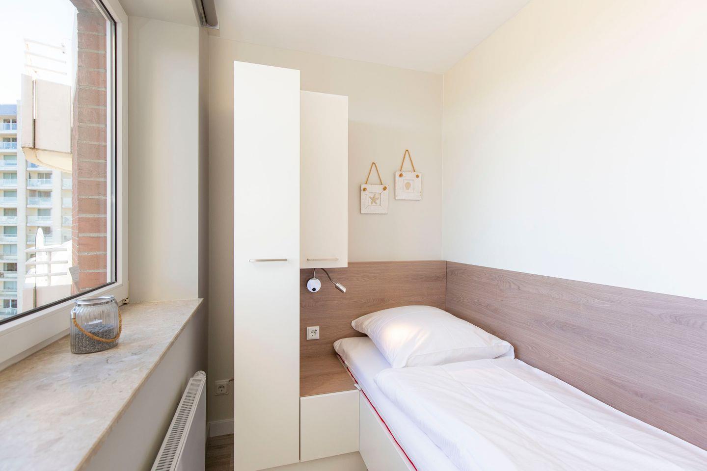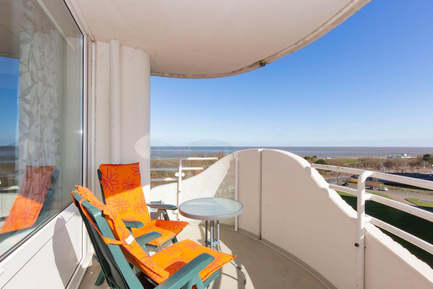 Haus "Lord Nelson", Typ 1, App.-Nr. "720", bis 3 Pers., 7.te Etage, ca. 43 qm, Nord/Ostseite, Meerblick Richtung Nordsee, seitlicher Meerblick Richtung Elbe, Wohnbereich mit feststehendem Doppelbett, sep. kleines Schlafzimmer mit Einzelbett, Dusche/WC, Küchenzeile mit Geschirrspüler/ Mikrowelle, 4-Platten-Ceranfeld, Telefon, Kabel-TV, kostenl. W-Lan Zugang, Balkon, Tiefgaragenstellplatz, Nichtraucherappartement, keine Haustiere erlaubt, Strandkorb im Sommer 2026.