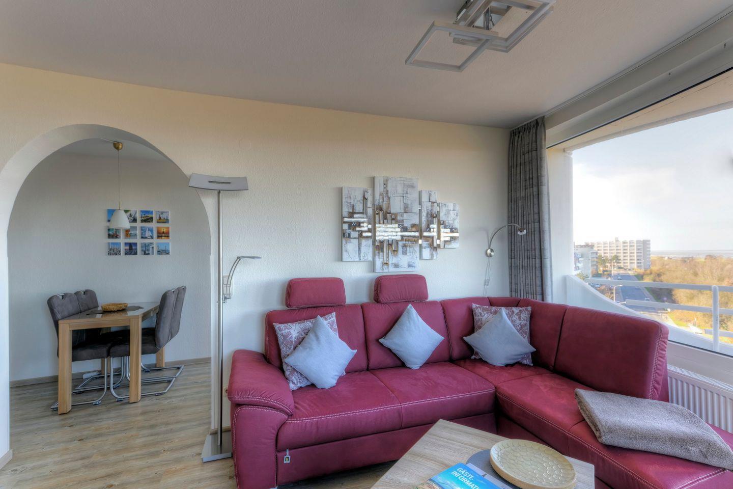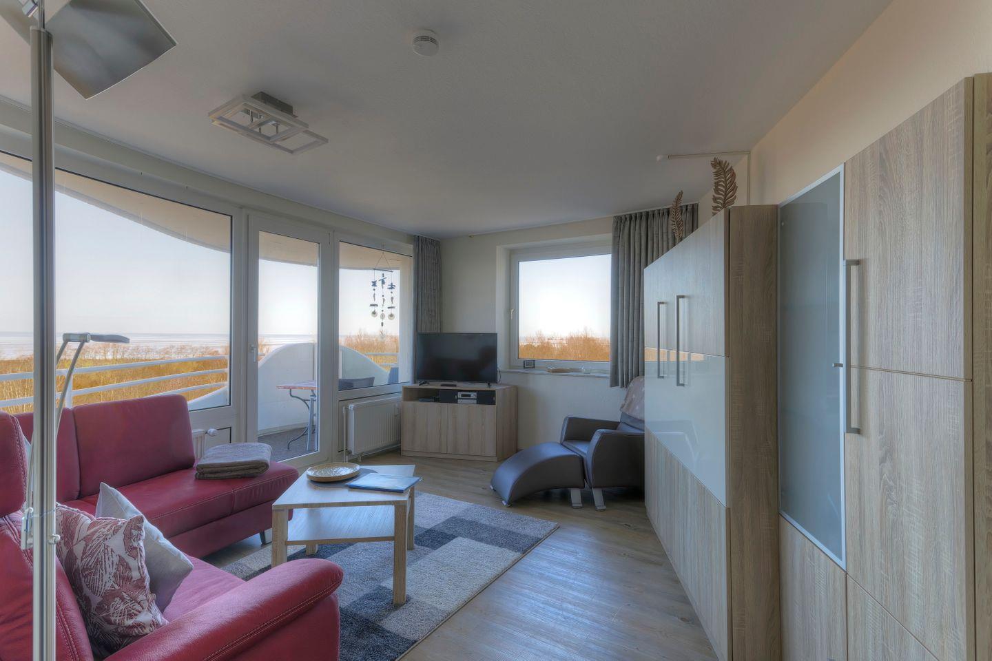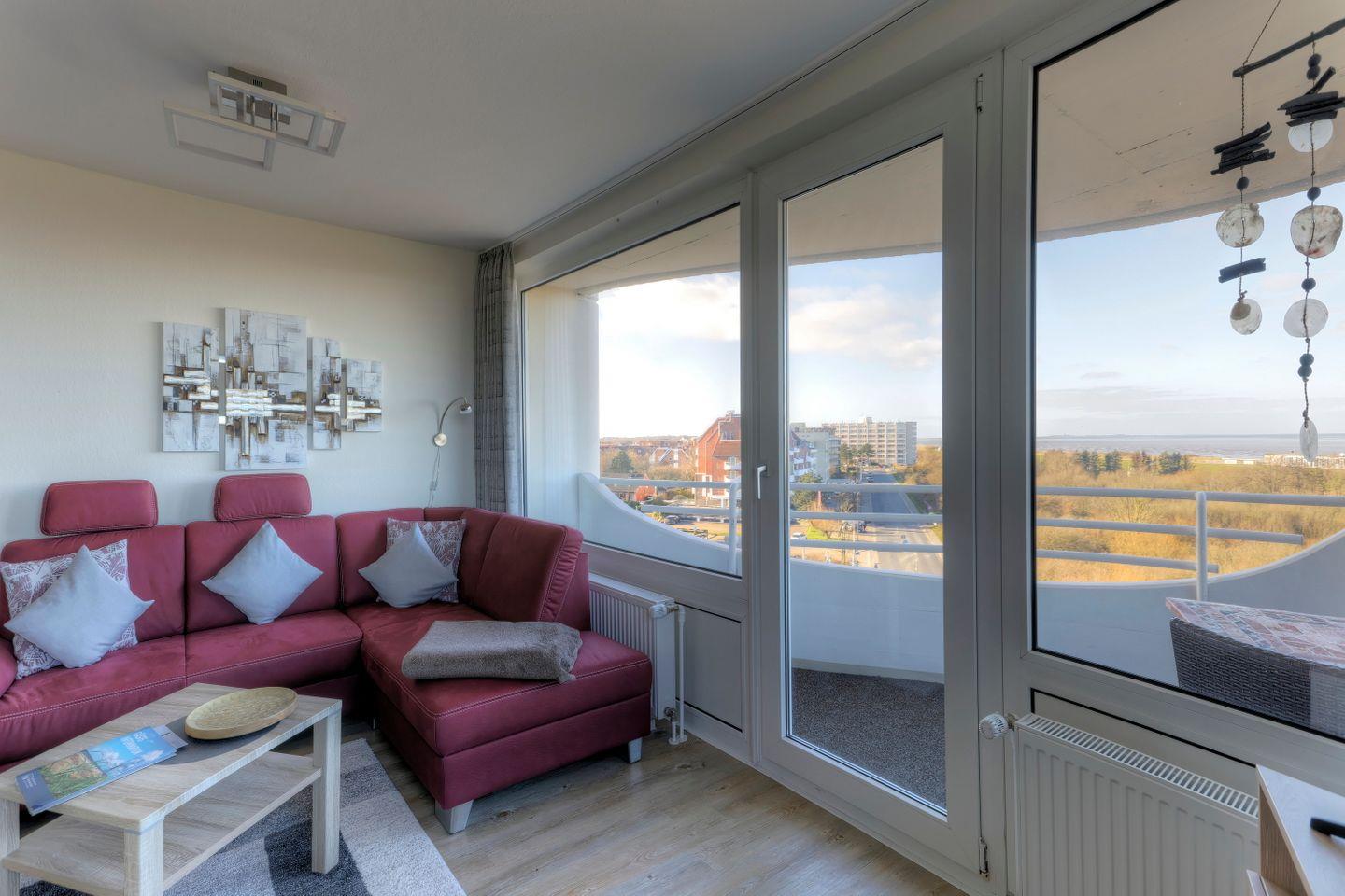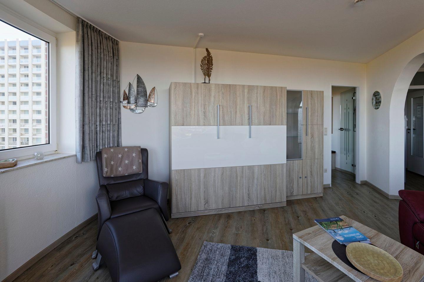 Haus "Lord Nelson", Typ 6, Appartement-Nr. 501, bis 4 Personen, 5. Etage, ca. 66 qm, Seesicht, Blick Richtung Weltnaturerbe Wattenmeer sowie auf den Weltschifffahrtsweg, Schlafzimmer mit Doppelbett, Wohnbereich mit Schrankbett, Dusche/WC, separate Küche mit Geschirrspüler und Mikrowelle, Balkon, kostenloser WLAN-Zugang im App., Kabel-TV, Nichtraucher, Haustiere sind nicht erlaubt, Strandkorb im Sommer 2025,Tiefgaragenstellplatz.