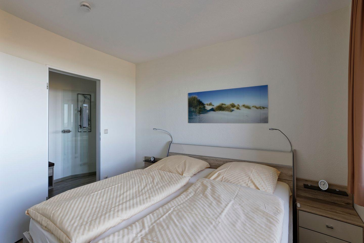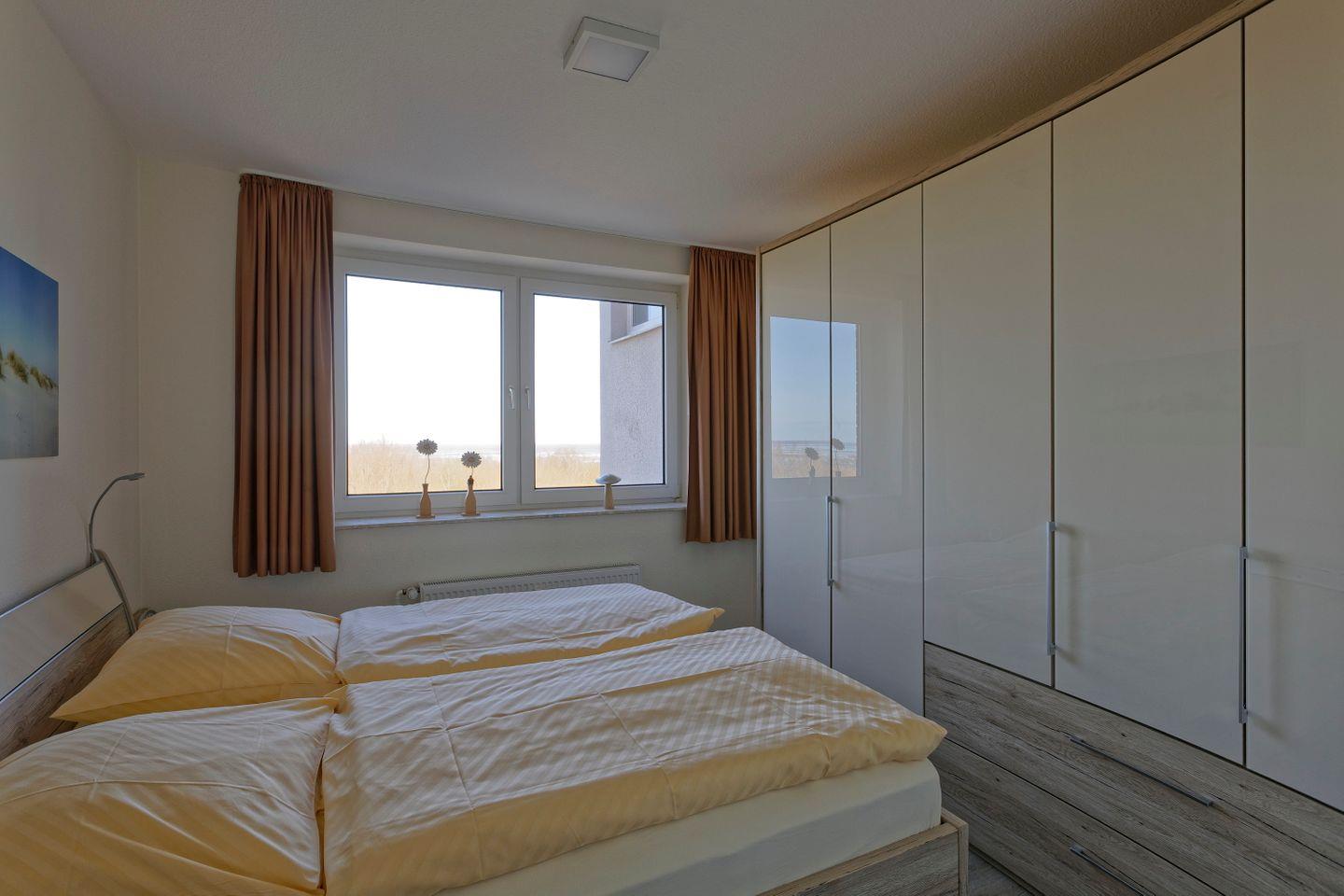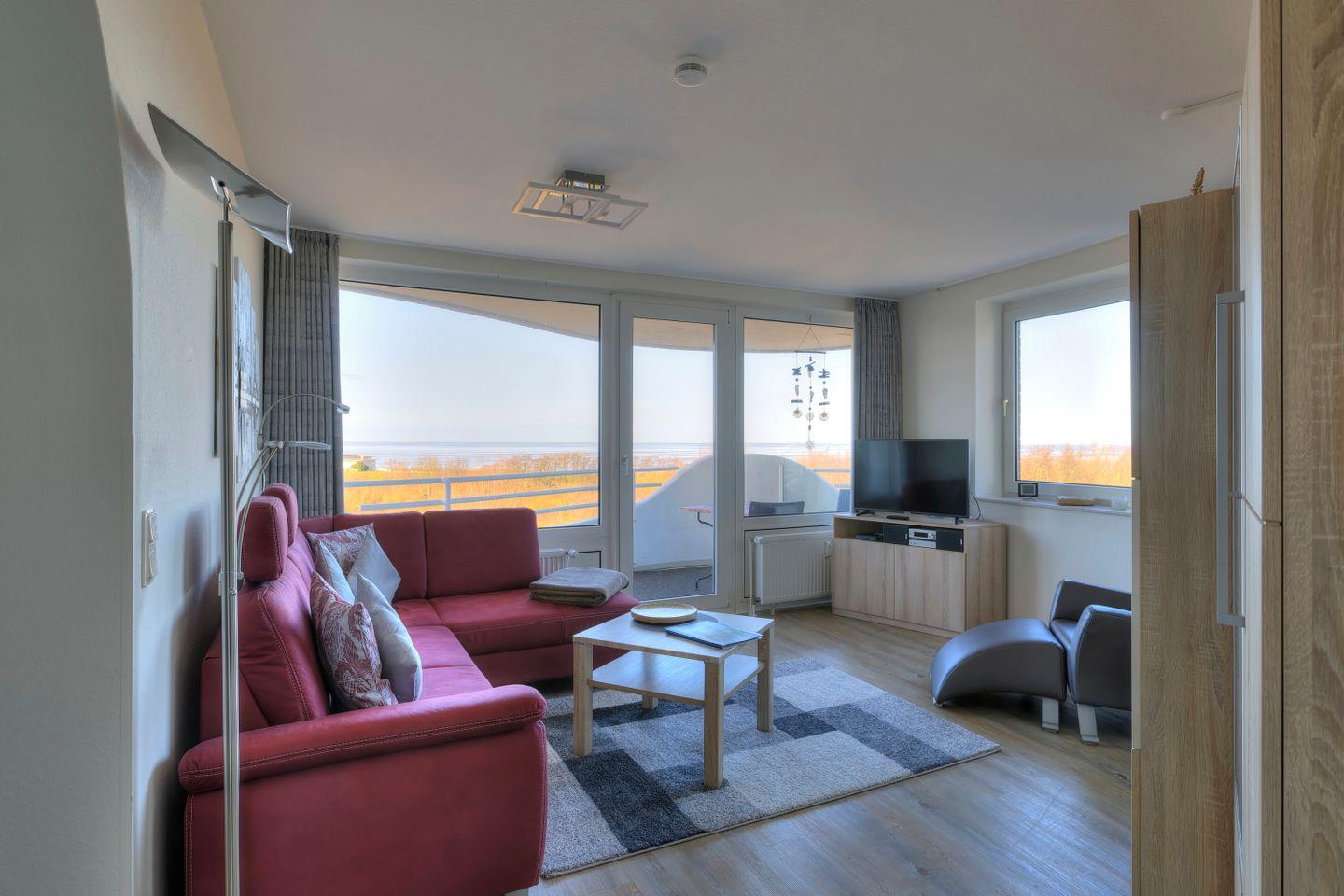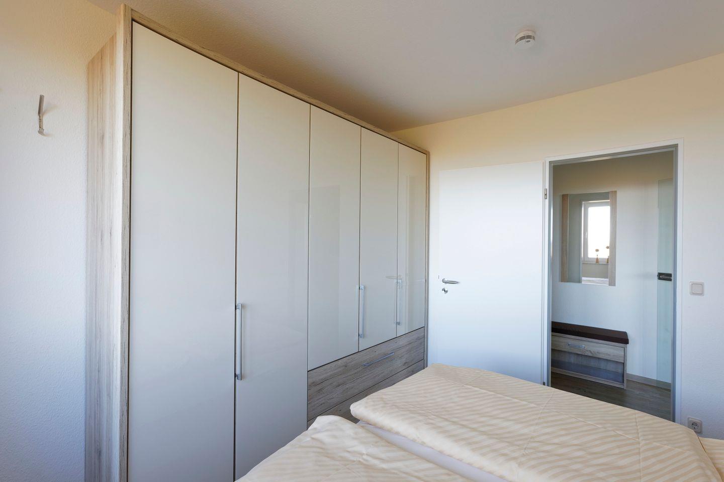 Haus "Lord Nelson", Typ 6, Appartement-Nr. 501, bis 4 Personen, 5. Etage, ca. 66 qm, Seesicht, Blick Richtung Weltnaturerbe Wattenmeer sowie auf den Weltschifffahrtsweg, Schlafzimmer mit Doppelbett, Wohnbereich mit Schrankbett, Dusche/WC, separate Küche mit Geschirrspüler und Mikrowelle, Balkon, kostenloser WLAN-Zugang im App., Kabel-TV, Nichtraucher, Haustiere sind nicht erlaubt, Strandkorb im Sommer 2025,Tiefgaragenstellplatz.