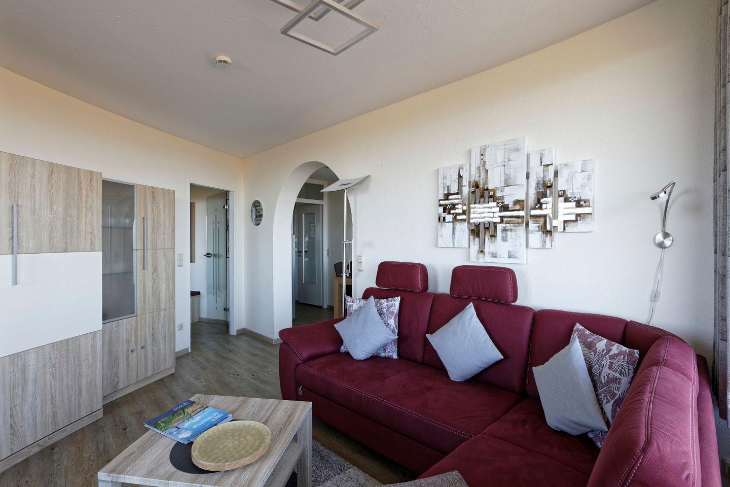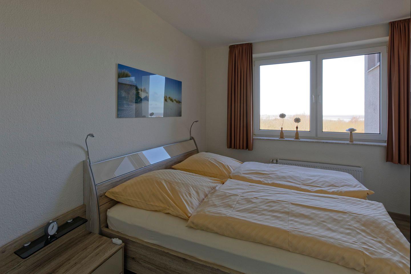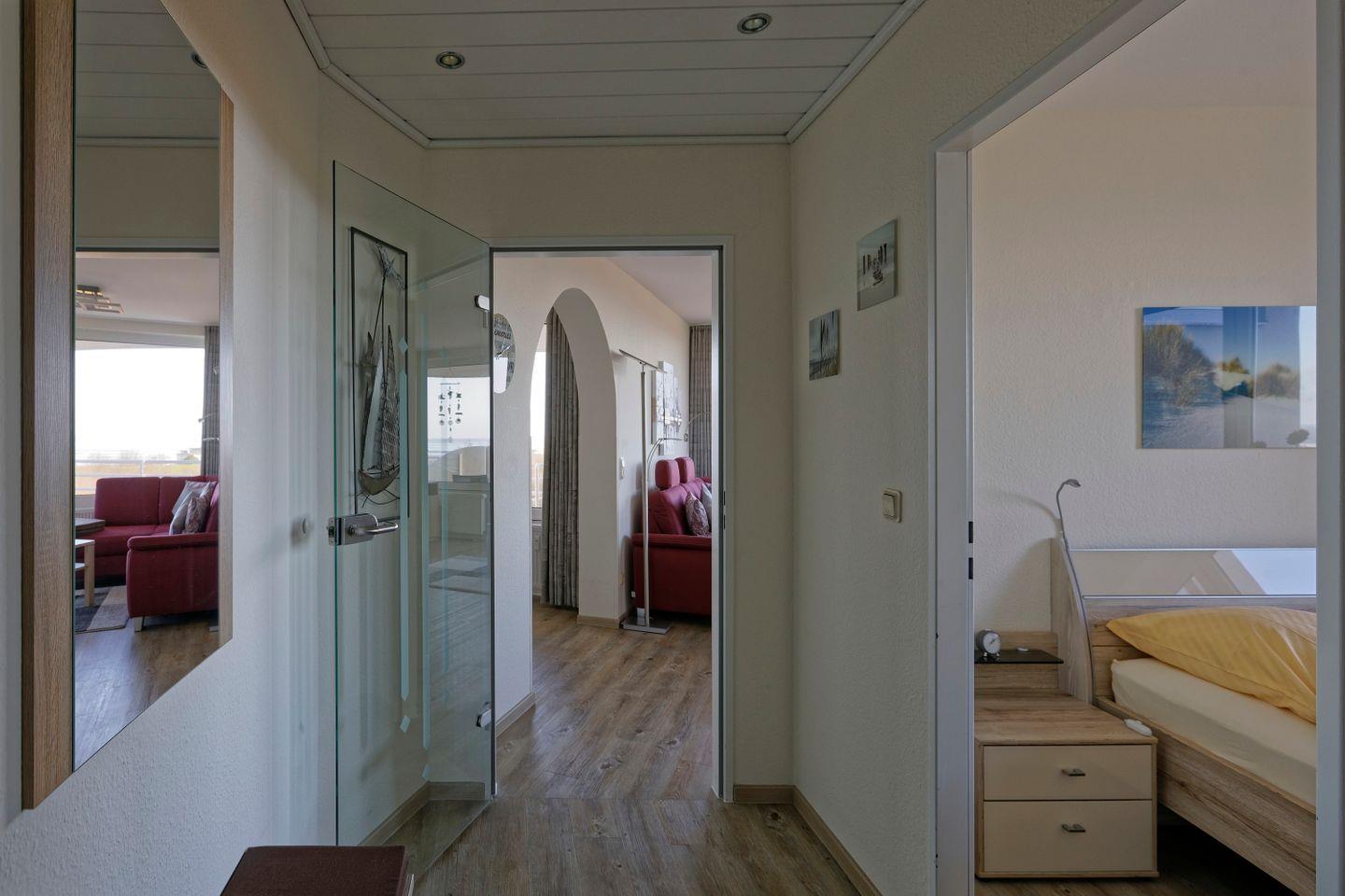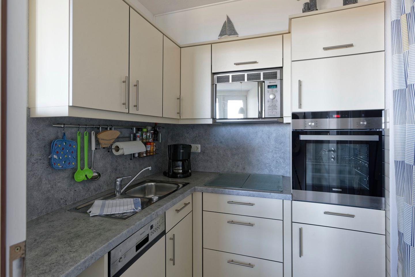 Haus "Lord Nelson", Typ 6, Appartement-Nr. 501, bis 4 Personen, 5. Etage, ca. 66 qm, Seesicht, Blick Richtung Weltnaturerbe Wattenmeer sowie auf den Weltschifffahrtsweg, Schlafzimmer mit Doppelbett, Wohnbereich mit Schrankbett, Dusche/WC, separate Küche mit Geschirrspüler und Mikrowelle, Balkon, kostenloser WLAN-Zugang im App., Kabel-TV, Nichtraucher, Haustiere sind nicht erlaubt, Strandkorb im Sommer 2025,Tiefgaragenstellplatz.