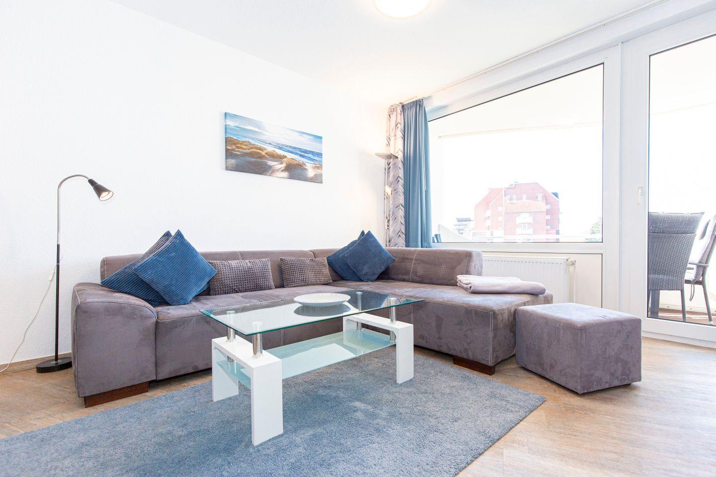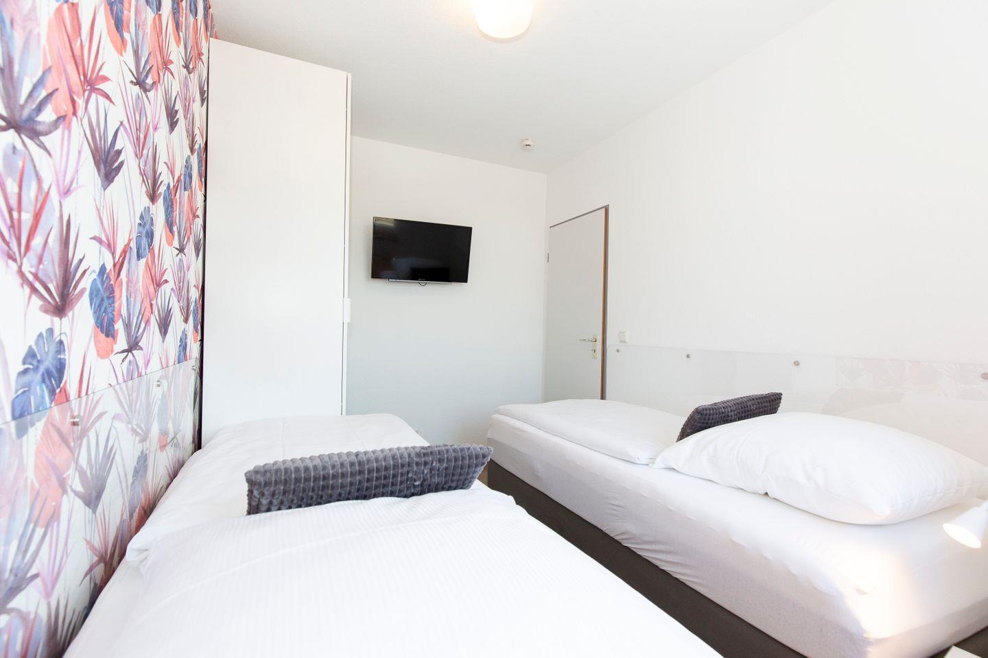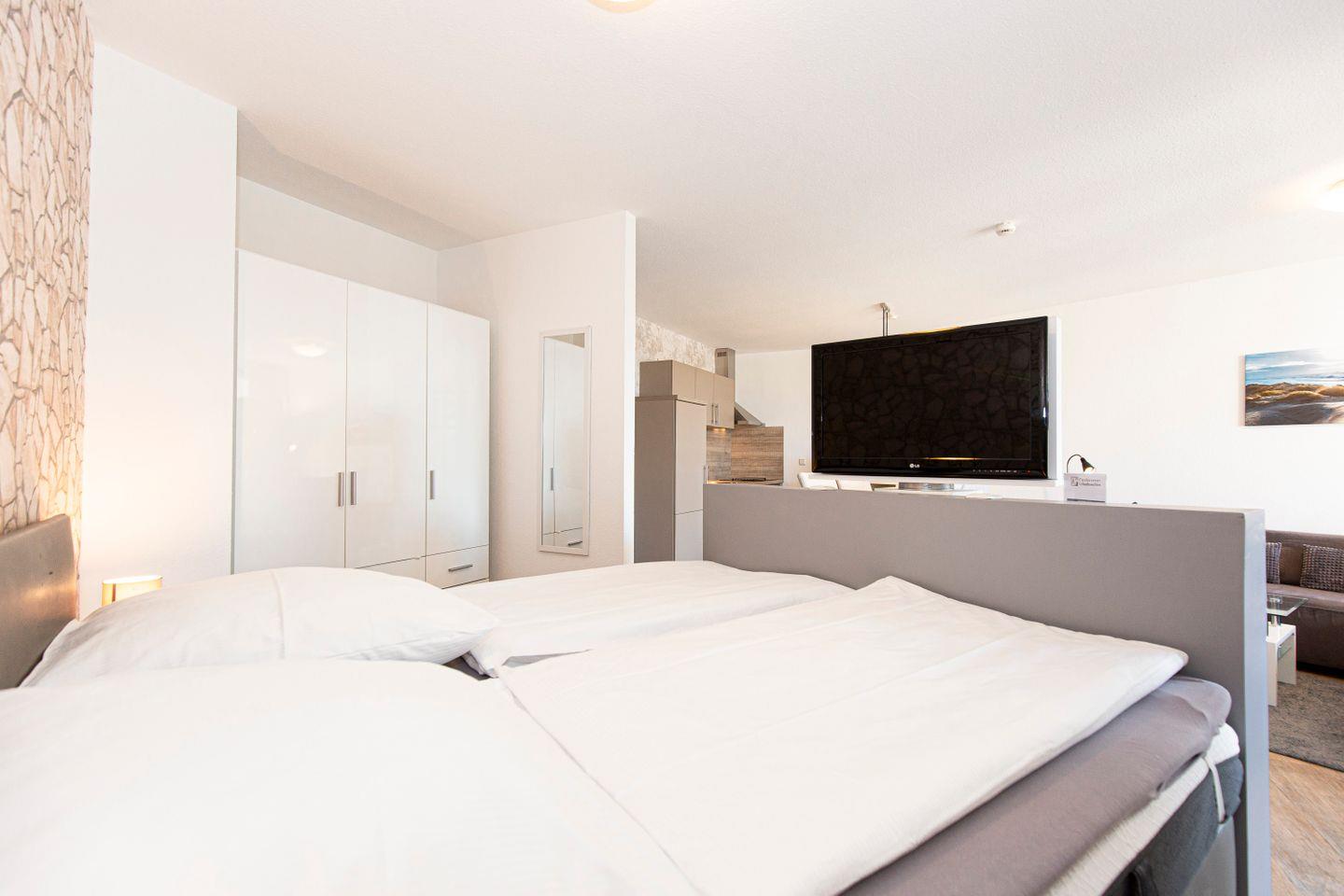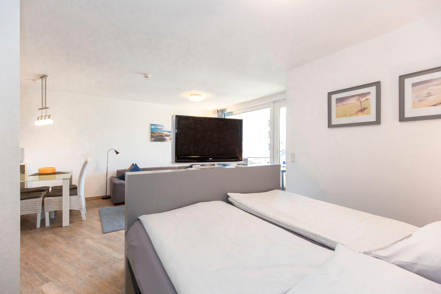 Haus "Trafalgar", Typ C, App.-Nr. 122, bis 4 Pers., 1.Etage, ca. 55 qm, Westseite (ohne Meerblick), Wohn/Schlafraum (Raumteiler) mit Boxspringbett (1,80 m x 2 m), sep. Schlafzimmer mit 2 Einzelbetten, Dusche/WC, Küchenzeile mit Mikrowelle und Geschirrspüler, 4-Platten Ceranfeld, Balkon, 2 mal Kabel-TV, kostenl. W-Lan Zugang im App, Tiefgaragenstellplatz, keine Haustiere erlaubt, Nichtraucherwohnung, Strandkorb im Sommer 2025.