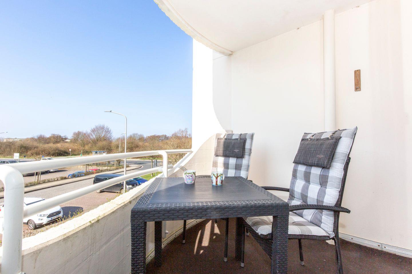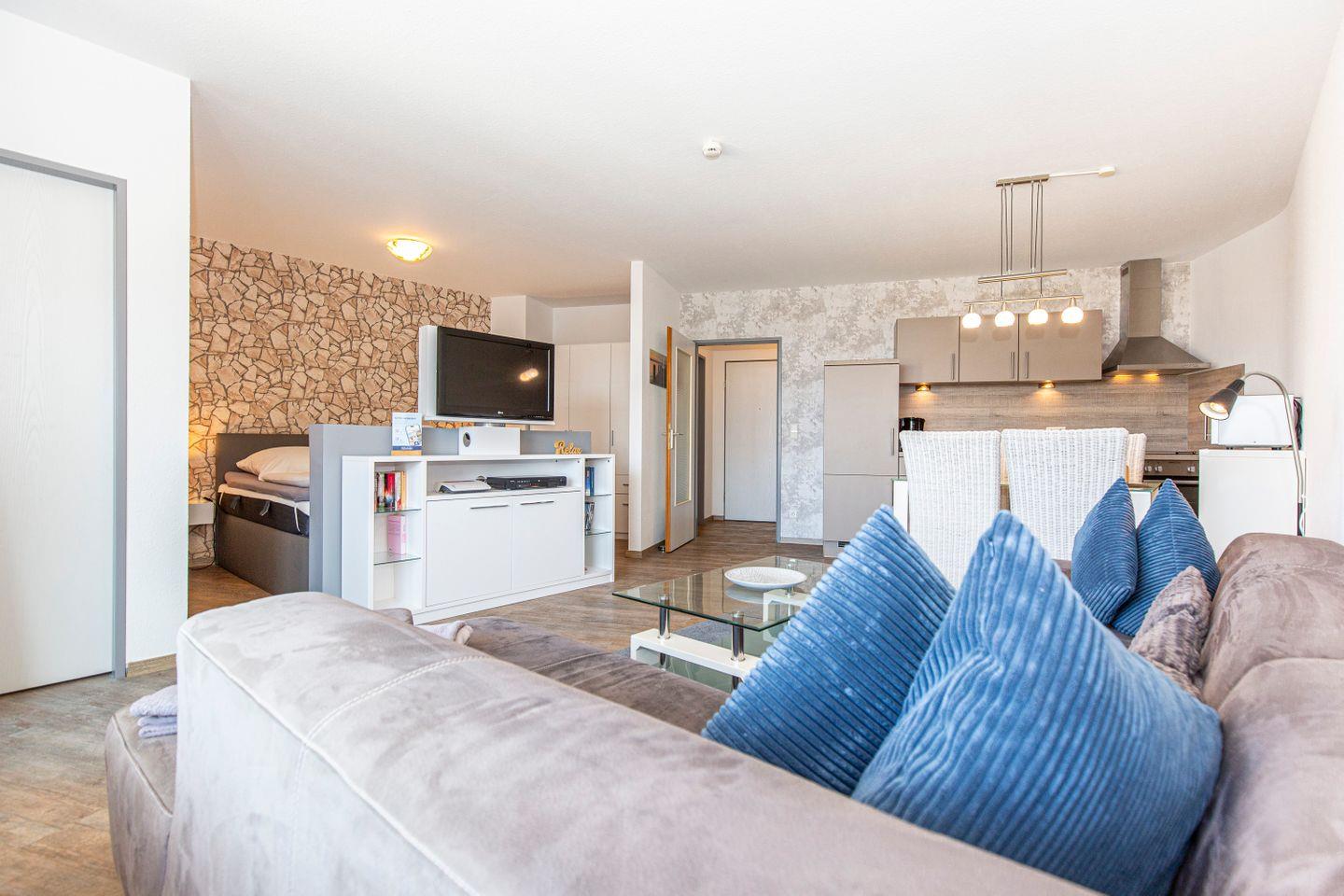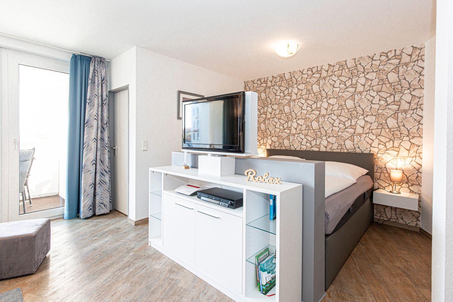 Haus "Trafalgar", Typ C, App.-Nr. 122, bis 4 Pers., 1.Etage, ca. 55 qm, Westseite (ohne Meerblick), Wohn/Schlafraum (Raumteiler) mit Boxspringbett (1,80 m x 2 m), sep. Schlafzimmer mit 2 Einzelbetten, Dusche/WC, Küchenzeile mit Mikrowelle und Geschirrspüler, 4-Platten Ceranfeld, Balkon, 2 mal Kabel-TV, kostenl. W-Lan Zugang im App, Tiefgaragenstellplatz, keine Haustiere erlaubt, Nichtraucherwohnung, Strandkorb im Sommer 2025.