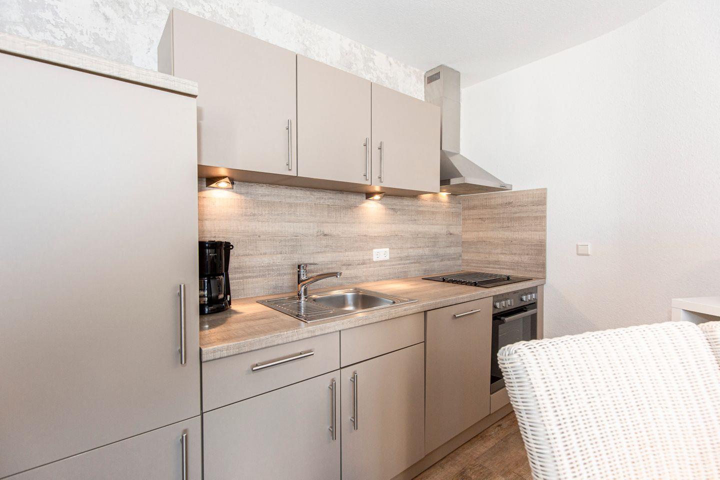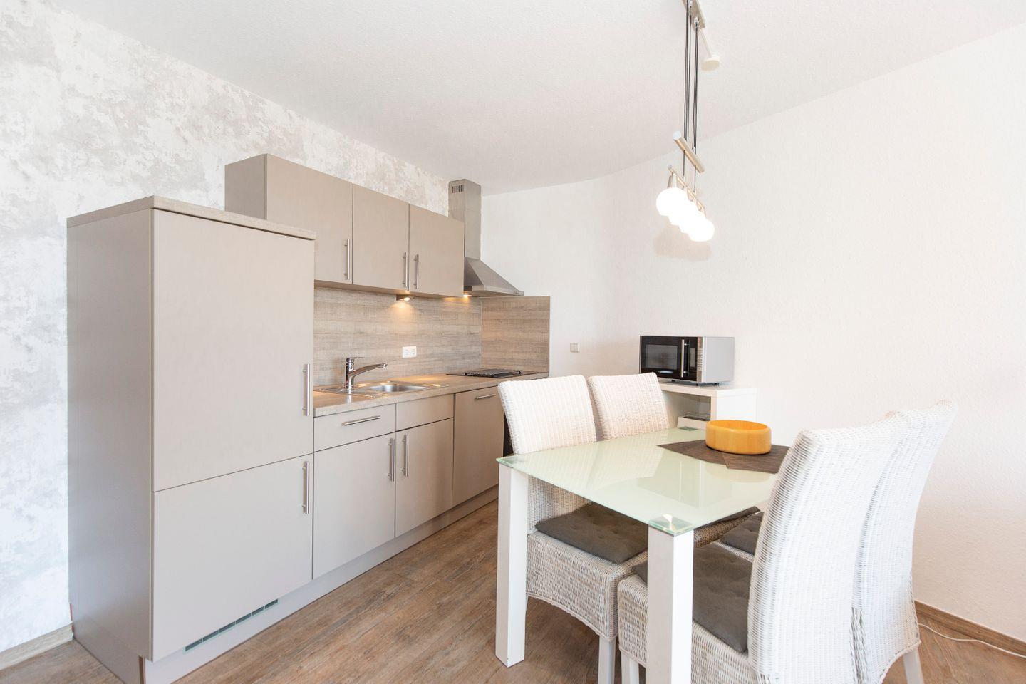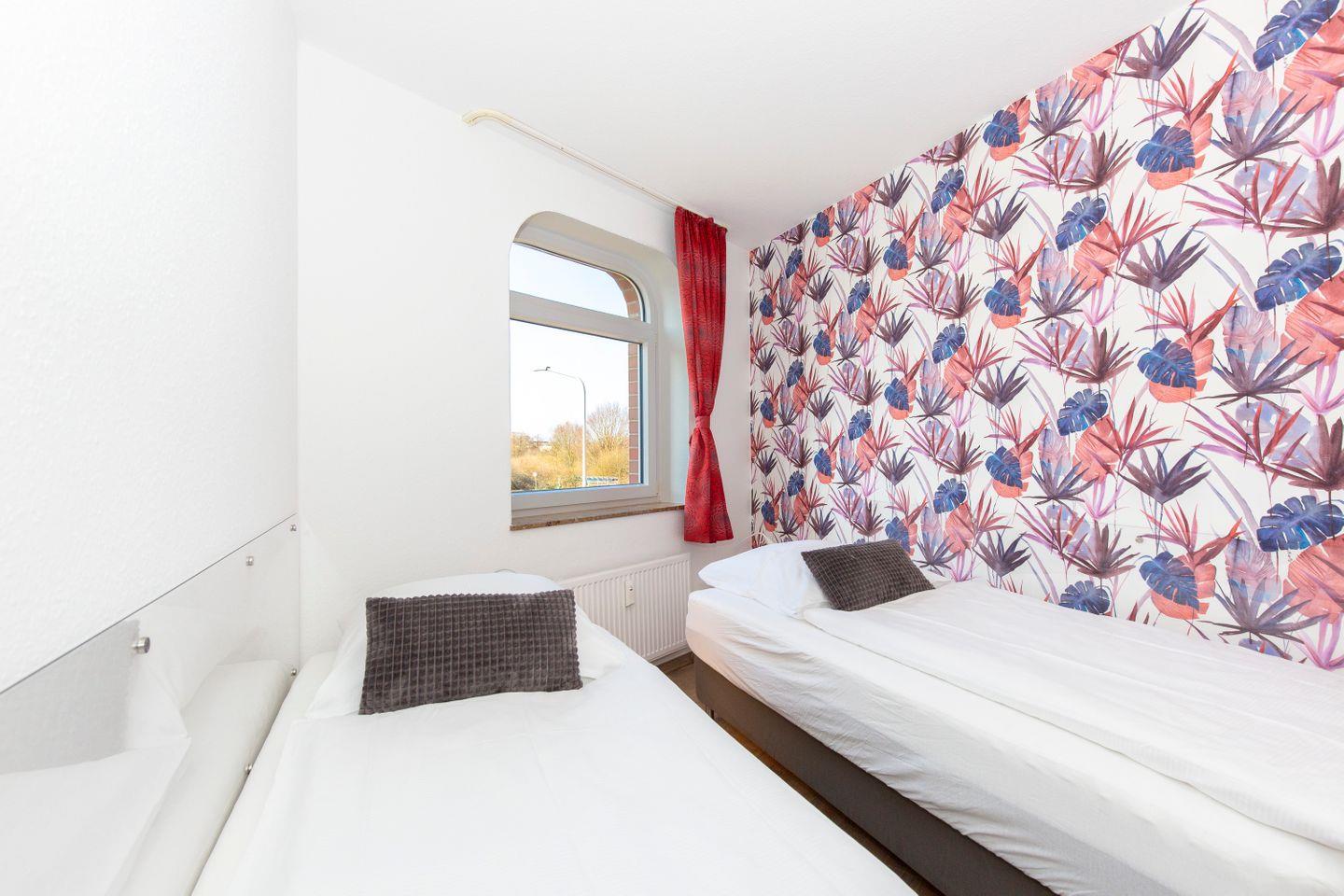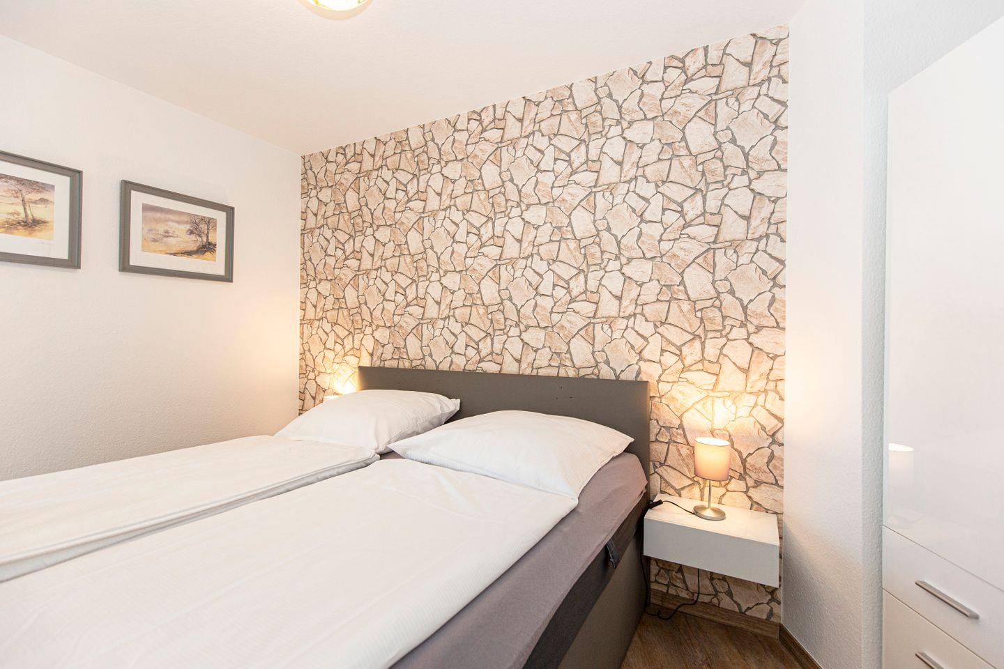 Haus "Trafalgar", Typ C, App.-Nr. 122, bis 4 Pers., 1.Etage, ca. 55 qm, Westseite (ohne Meerblick), Wohn/Schlafraum (Raumteiler) mit Boxspringbett (1,80 m x 2 m), sep. Schlafzimmer mit 2 Einzelbetten, Dusche/WC, Küchenzeile mit Mikrowelle und Geschirrspüler, 4-Platten Ceranfeld, Balkon, 2 mal Kabel-TV, kostenl. W-Lan Zugang im App, Tiefgaragenstellplatz, keine Haustiere erlaubt, Nichtraucherwohnung, Strandkorb im Sommer 2025.