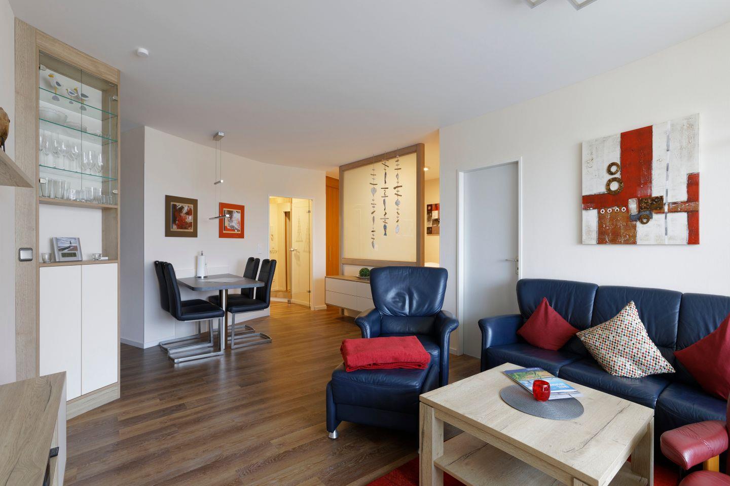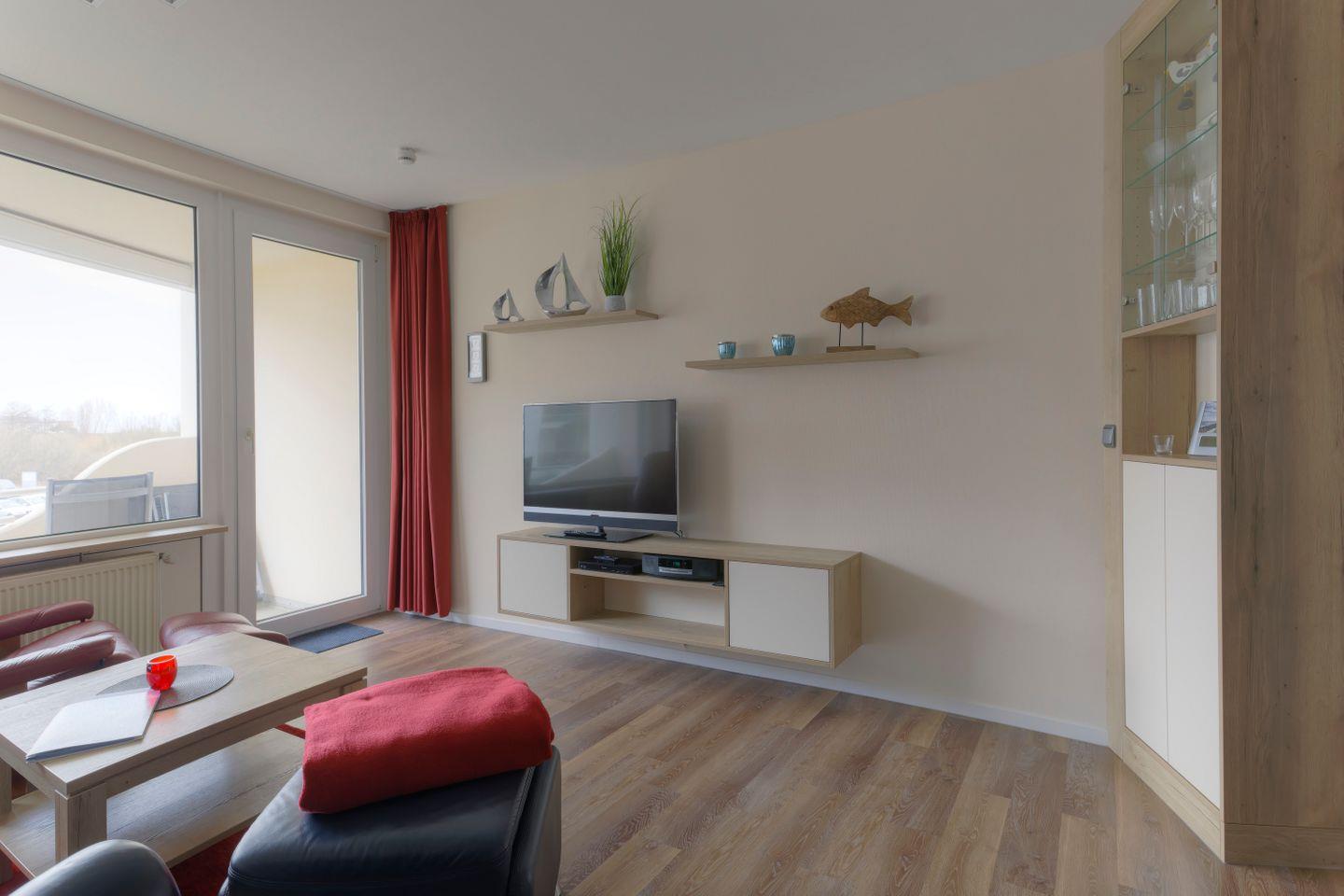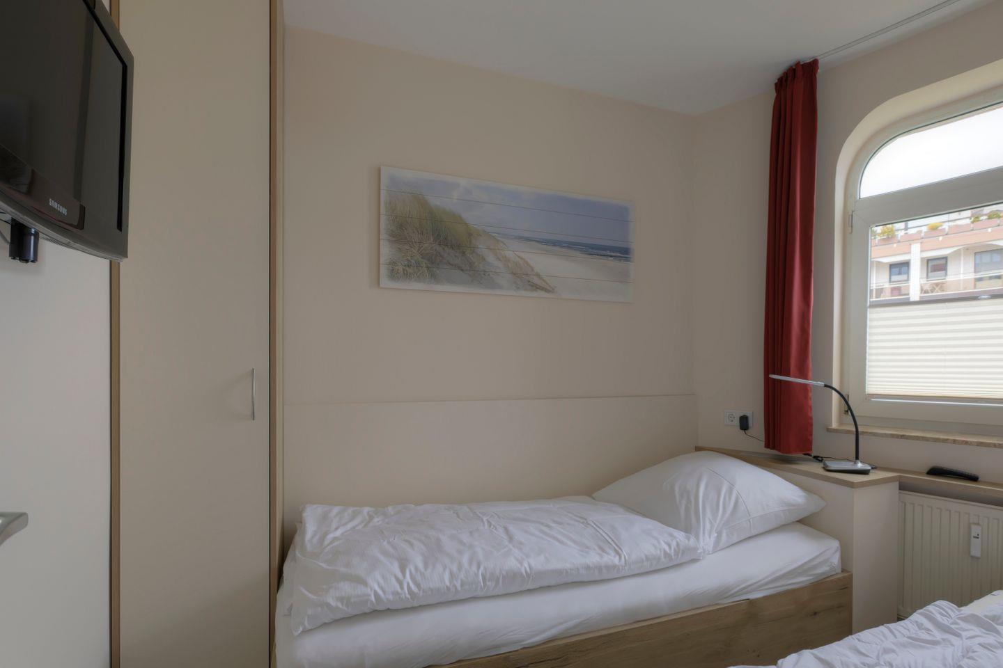 Haus "Trafalgar", Typ C, App.-Nr. 125, bis 4 Pers., 1.Etage, ca. 55 qm, Westseite (ohne Meerblick), Wohn/Schlafbereich mit Doppelbett (Raumteiler), separates Schlafzimmer mit 2 Einzelbetten und 2. TV-Gerät, Küchenzeile mit Backofen, Geschirrspüler und Mikrowelle, Dusche/WC, Balkon, Kabel-TV, kostenl. W-Lan Zugang im App, CD-Player, DVD-Spieler, Tiefgaragenstellplatz, Haustiere sind nicht gestattet, Nichtraucher, Strandkorb im Sommer 2025.