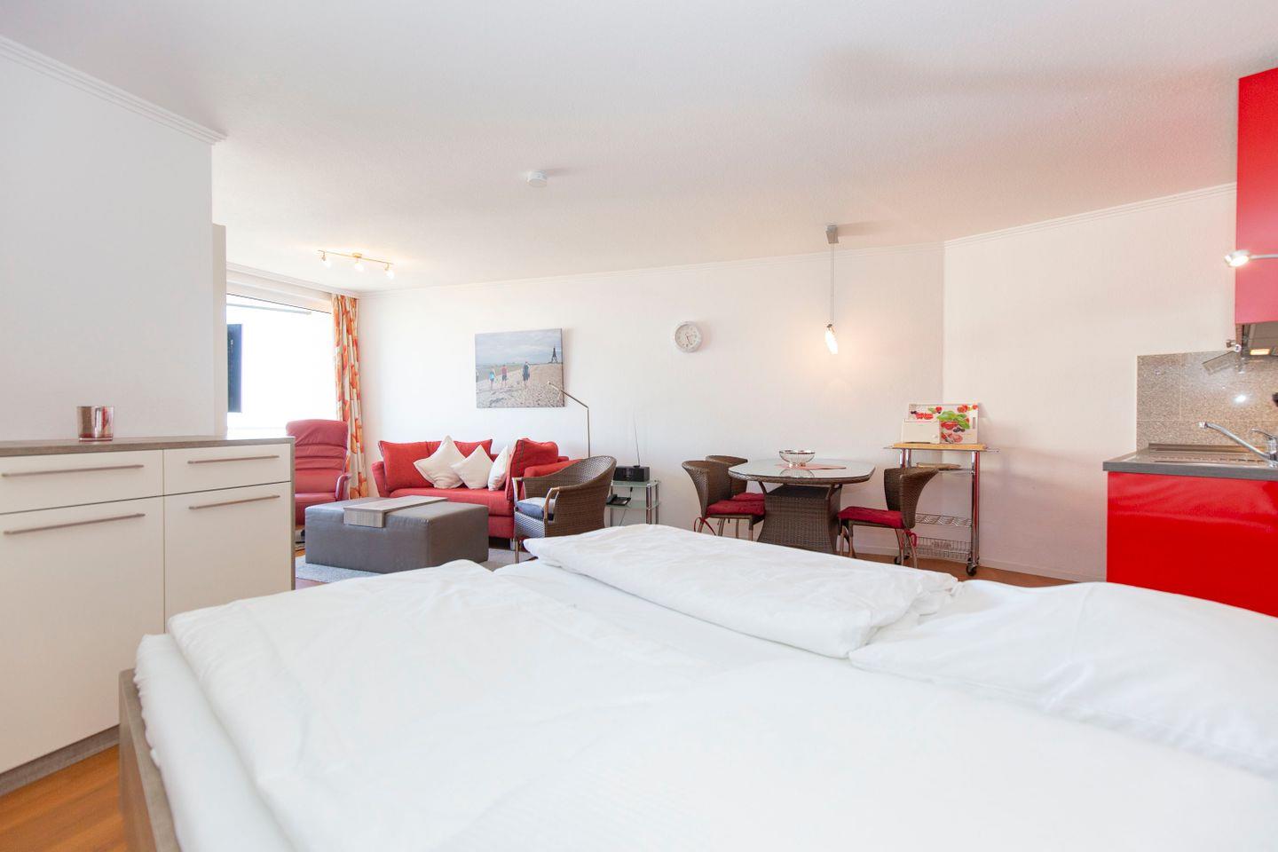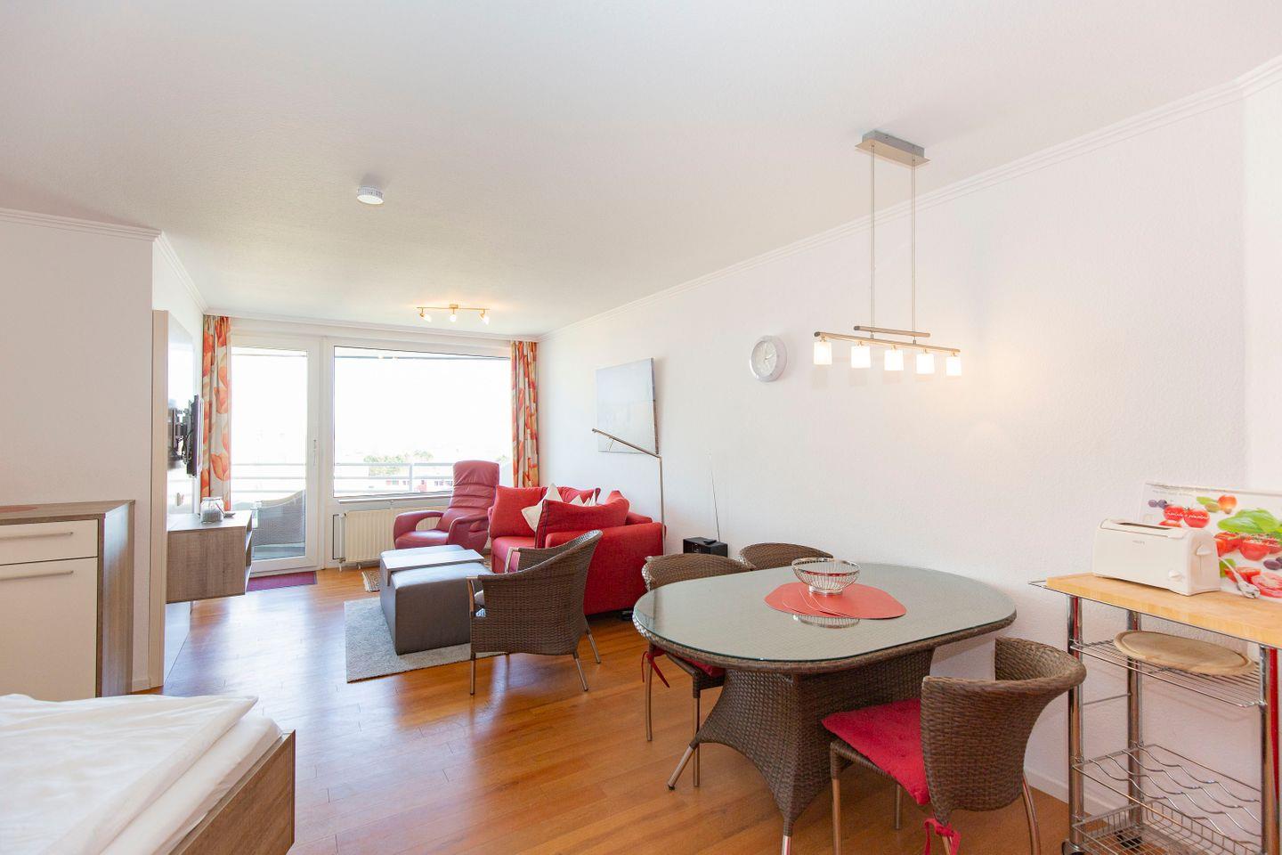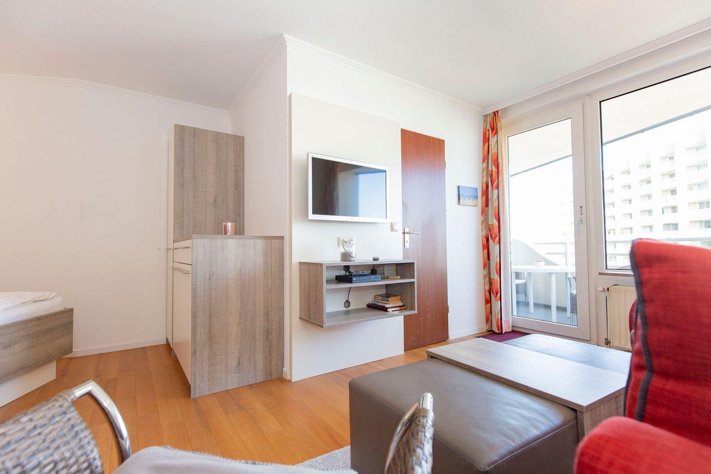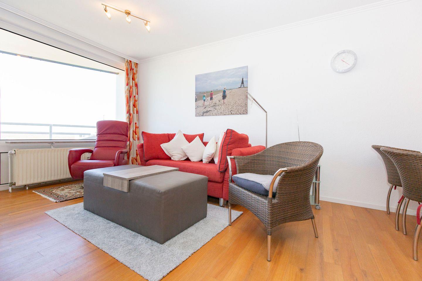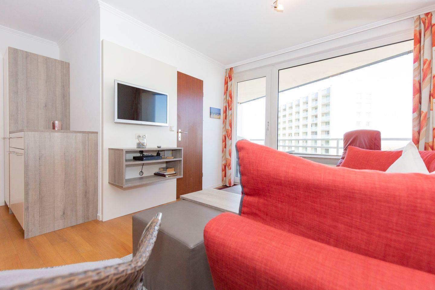 Haus "Lord Nelson", Typ 2, App.-Nr. "818", bis 4 Personen, 8. Etage, ca. 40 qm Größe, Weltschifffahrtsweg (seitlicher Meerblick Richtung Elbe), Wohnbereich mit feststehendem Doppelbett (1,80x2,00 m), sep. kleines Kinderzimmer mit Etagenbett, Dusche/WC, Küchenzeile mit Mikrowelle, Geschirrspüler, 4-Platten Ceranfeld, Telefon, Kabel-TV schwenkbar vom Sitzbereich/Sofa zum Bett, Blu-Ray-Player, Internet-Radio mit Bluetooth und USB, Balkon, Tiefgaragenstellplatz, Nichtraucherappartement, Haustiere nicht gestattet, kostenloser High-Speed- WLAN-Zugang im App., Strandkorb im Sommer 2026.
