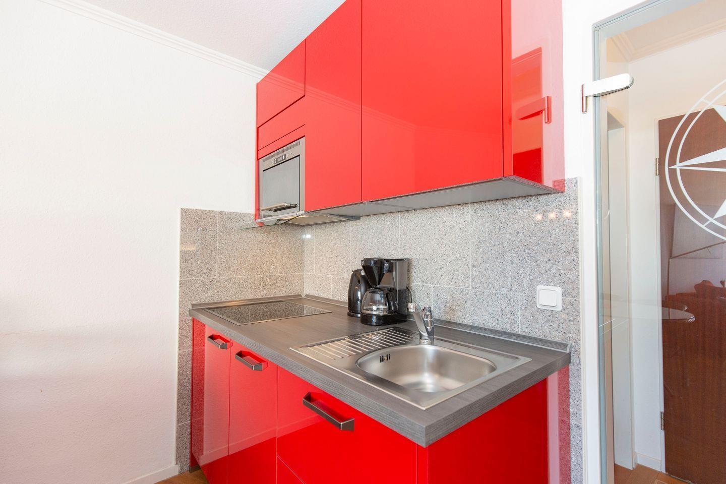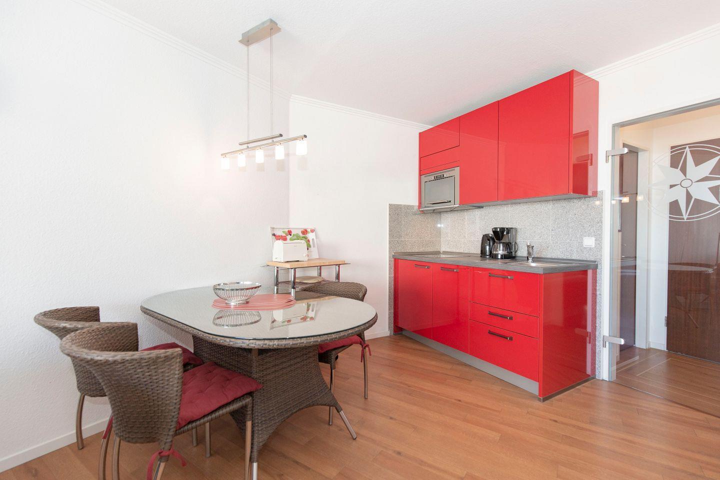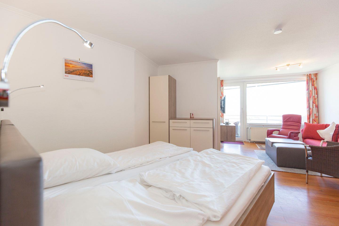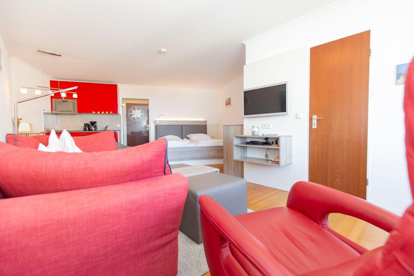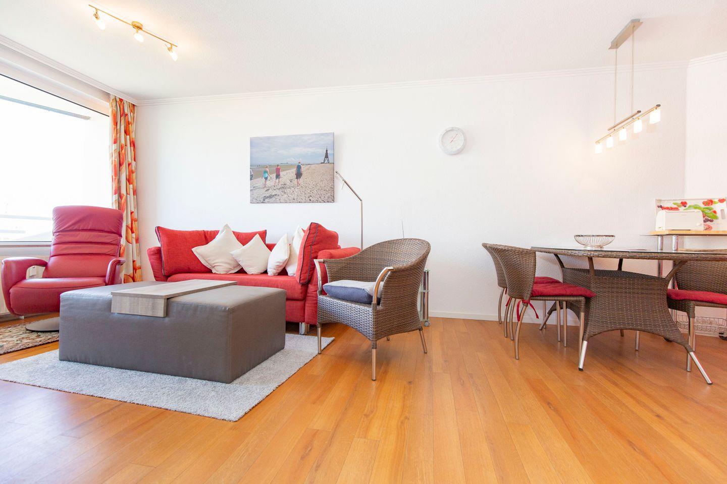 Haus "Lord Nelson", Typ 2, App.-Nr. "818", bis 4 Personen, 8. Etage, ca. 40 qm Größe, Weltschifffahrtsweg (seitlicher Meerblick Richtung Elbe), Wohnbereich mit feststehendem Doppelbett (1,80x2,00 m), sep. kleines Kinderzimmer mit Etagenbett, Dusche/WC, Küchenzeile mit Mikrowelle, Geschirrspüler, 4-Platten Ceranfeld, Telefon, Kabel-TV schwenkbar vom Sitzbereich/Sofa zum Bett, Blu-Ray-Player, Internet-Radio mit Bluetooth und USB, Balkon, Tiefgaragenstellplatz, Nichtraucherappartement, Haustiere nicht gestattet, kostenloser High-Speed- WLAN-Zugang im App., Strandkorb im Sommer 2026.