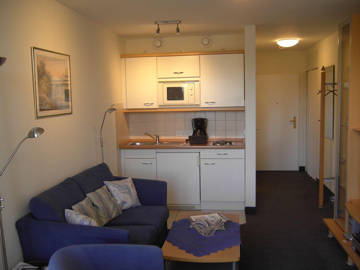 Haus "Kurpark-Residenz", Typ A, App.-Nr. "111", bis 3 Pers., 1. OG, ca. 42 m² Größe, Nord-Ostseite (Richtung "Kugelbake"), Wohnzimmer mit Schlafcouch, Schlafzimmer mit Doppelbett, Dusche/WC mit Hotel-Föhn, Küchenzeile mit Mikrowelle, Loggia, Telefon, SAT-TV, 3D-Flachbildschirm (40'') mit Ambilight, aktive 3D-Brillen sind vorhanden, 3D-Blu-ray-Player, S-VHS-Videorecorder, DVD-Player, Mini-Stereo-Anlage mit CD-Player, zusätzlicher Flachbildschirm (32'') mit Blu-ray- inklusiv DVD-Player im Schlafzimmer, Tiefgaragenstellplatz, Nichtraucherwohnung, keine Haustiere gestattet, kostenl. W-Lan Zugang im App., Strandkorb im Sommer 2025