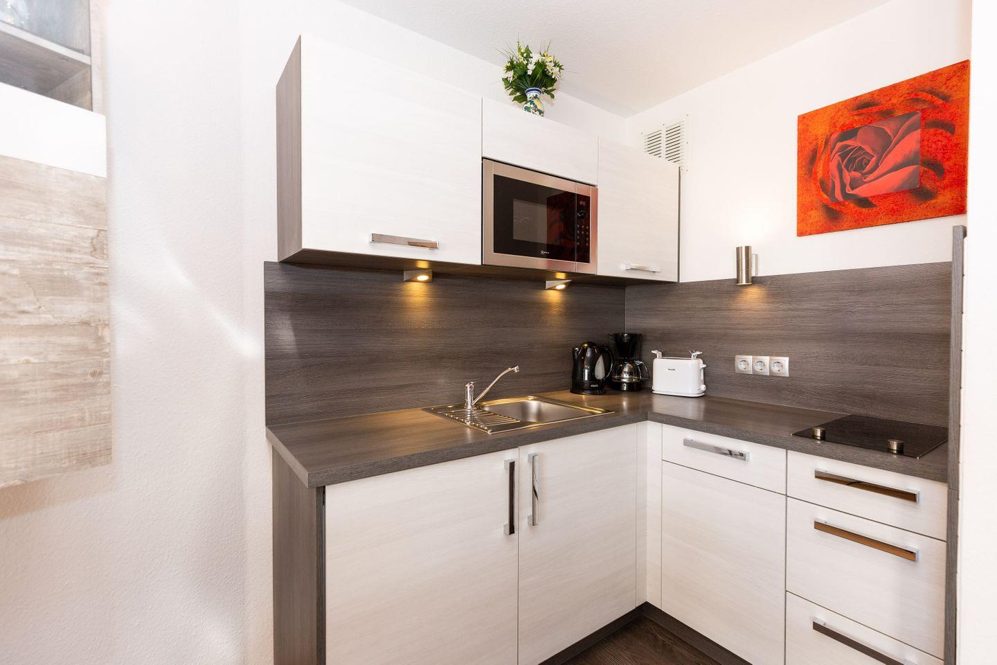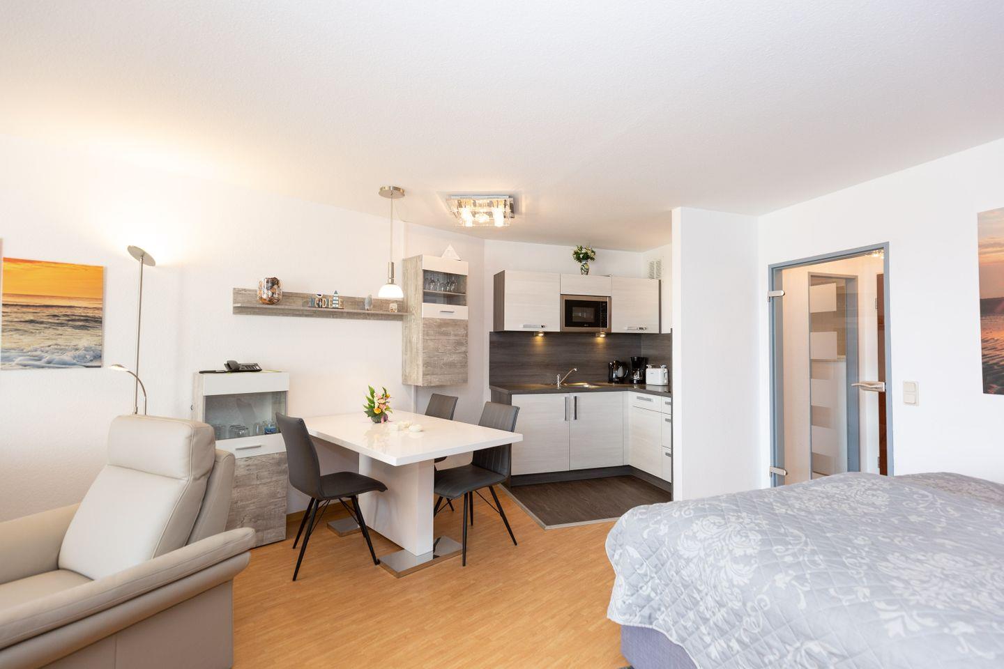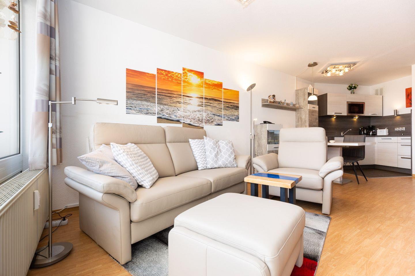 Haus "Lord Nelson", Typ 2, App.-Nr. "217", bis 3 Personen, 2. Etage, ca. 40 qm Wohnungsgröße, Ostseite (ohne Meerblick/Richtung Elbe), Balkon, Wohnbereich mit in den Schrank integrierten Boxspringbett (mit zwei Einzelmatratzen) , separates kleines Kinderzimmer mit Einzelbett, Dusche/WC, Küchenzeile mit Mikrowelle, Kabel-TV, kostenl. WLAN-Zugang im App., Tiefgaragenstellplatz, Strandkorb im Sommer 2026, Nichtraucherappartement