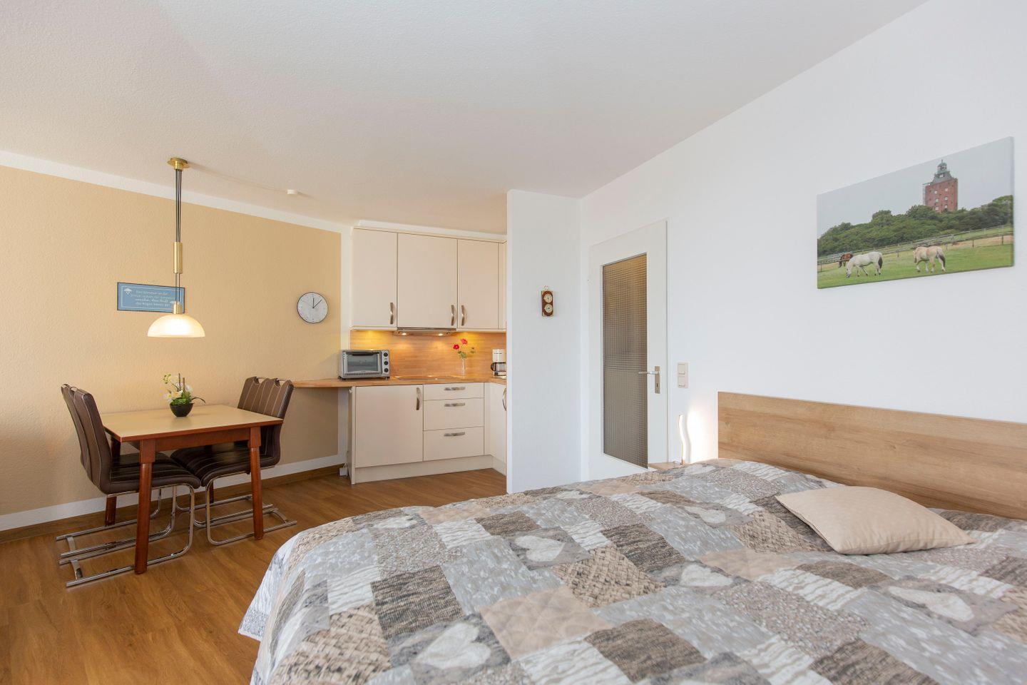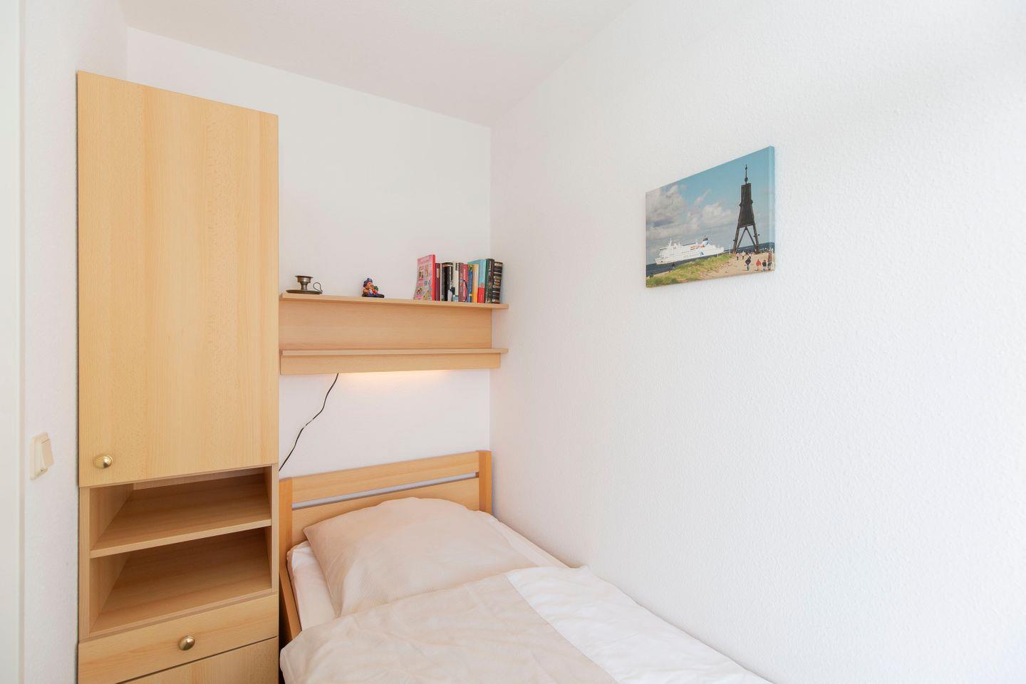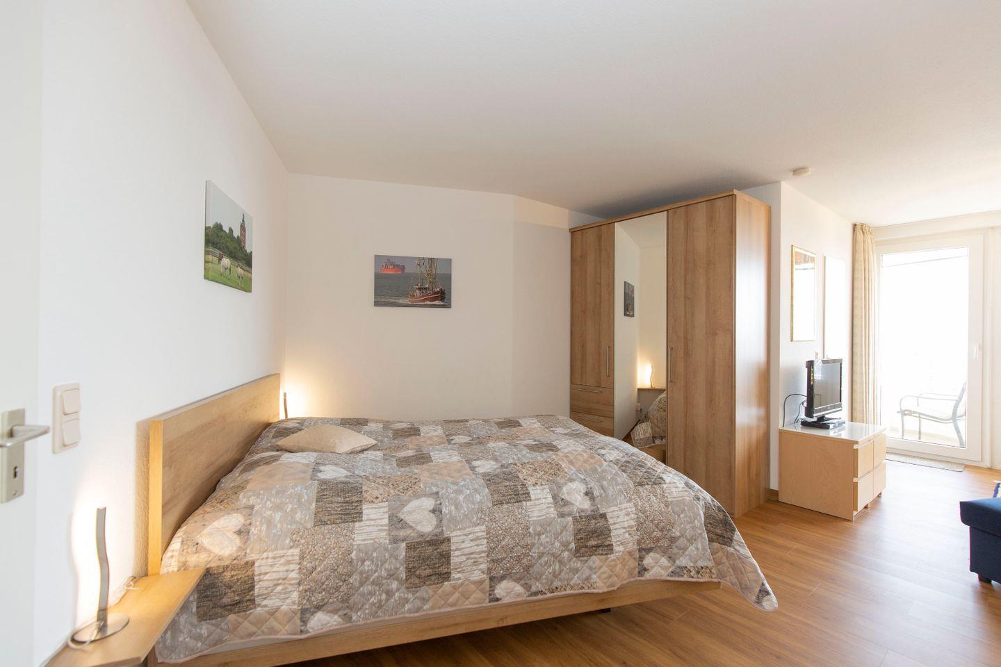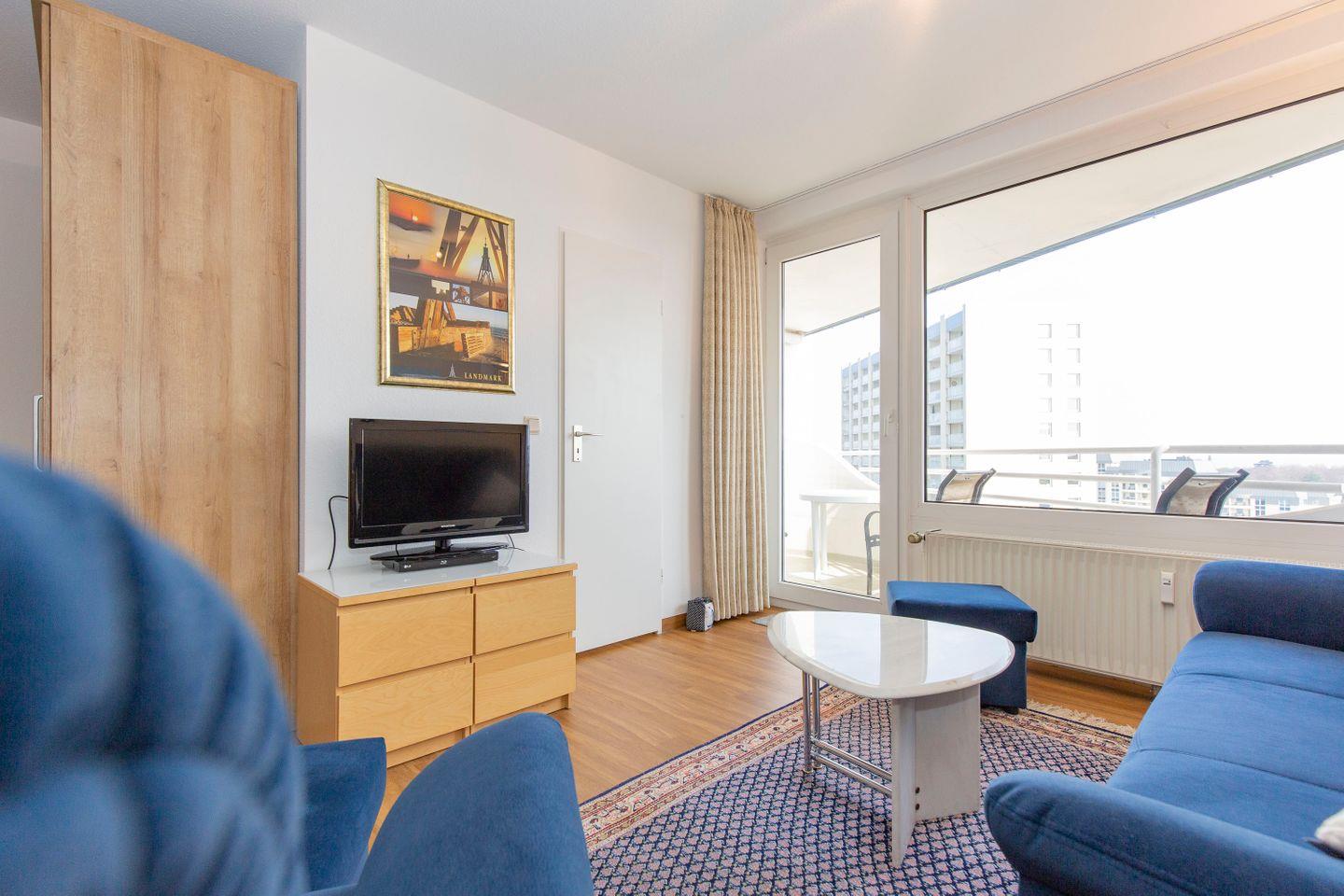 Haus "Lord Nelson", Typ 2, App.-Nr. "815", bis 3 Pers., 8. Etage, ca. 40 qm Größe, Weltschifffahrtsweg (seitlicher Meerblick Richtung Elbe), Wohnbereich mit Doppelbett, sep. kleines Schlafzimmer mit Einzelbett, Dusche/WC, Küchenzeile mit Mikrowelle, Geschirrspüler, 4-Platten-Ceranfeld, Kabel-TV, kostenl. W-Lan Zugang im App., Balkon, Außenstellplatz, Strandkorb im Sommer 2026, Nichtraucher, für Haustiere gesperrt.