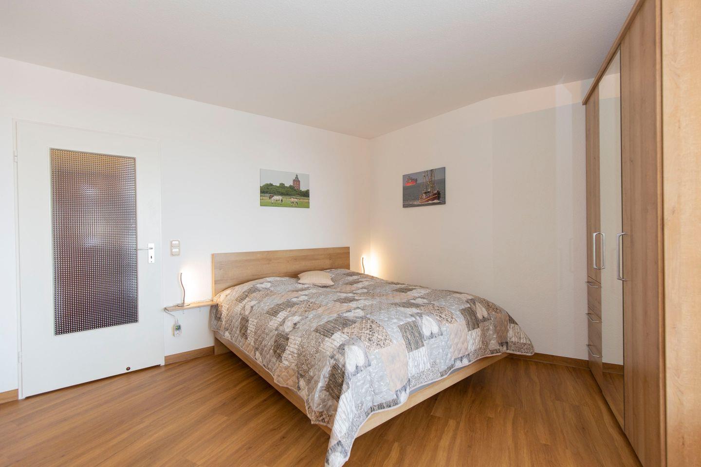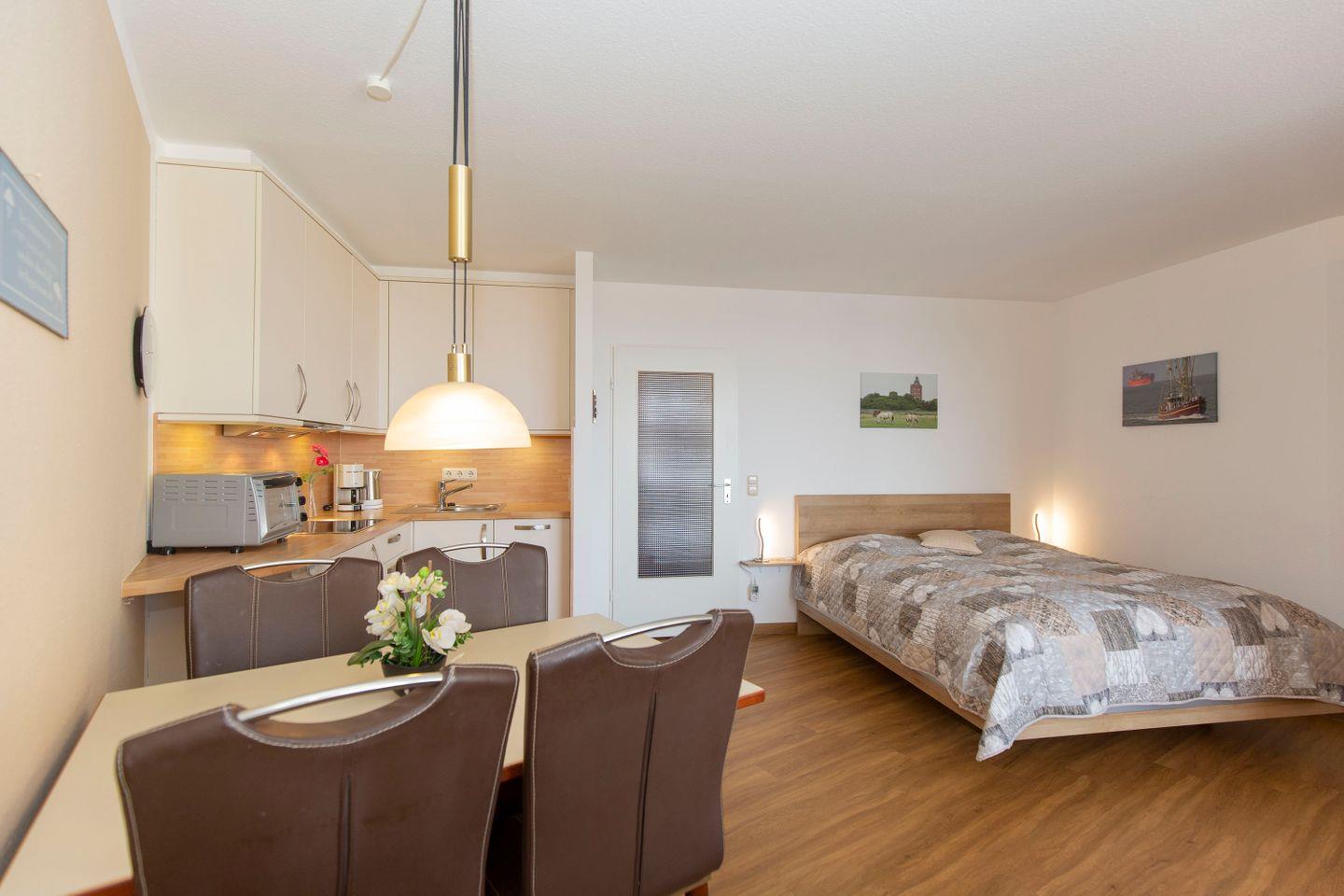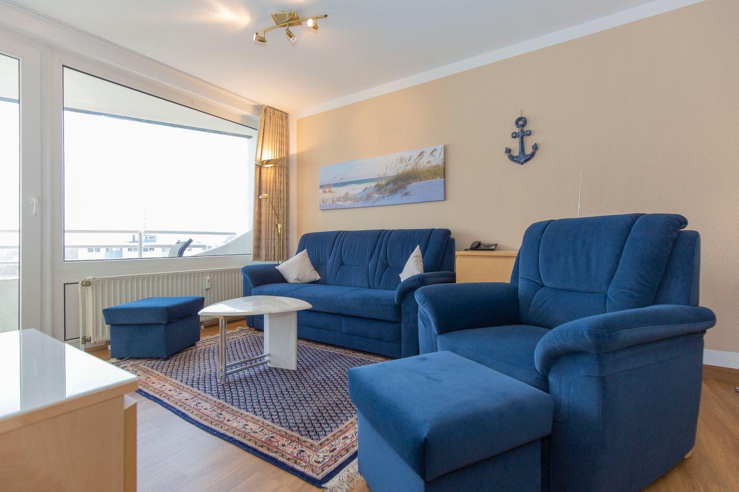 Haus "Lord Nelson", Typ 2, App.-Nr. "815", bis 3 Pers., 8. Etage, ca. 40 qm Größe, Weltschifffahrtsweg (seitlicher Meerblick Richtung Elbe), Wohnbereich mit Doppelbett, sep. kleines Schlafzimmer mit Einzelbett, Dusche/WC, Küchenzeile mit Mikrowelle, Geschirrspüler, 4-Platten-Ceranfeld, Kabel-TV, kostenl. W-Lan Zugang im App., Balkon, Außenstellplatz, Strandkorb im Sommer 2026, Nichtraucher, für Haustiere gesperrt.