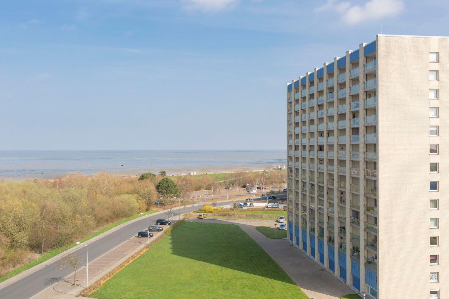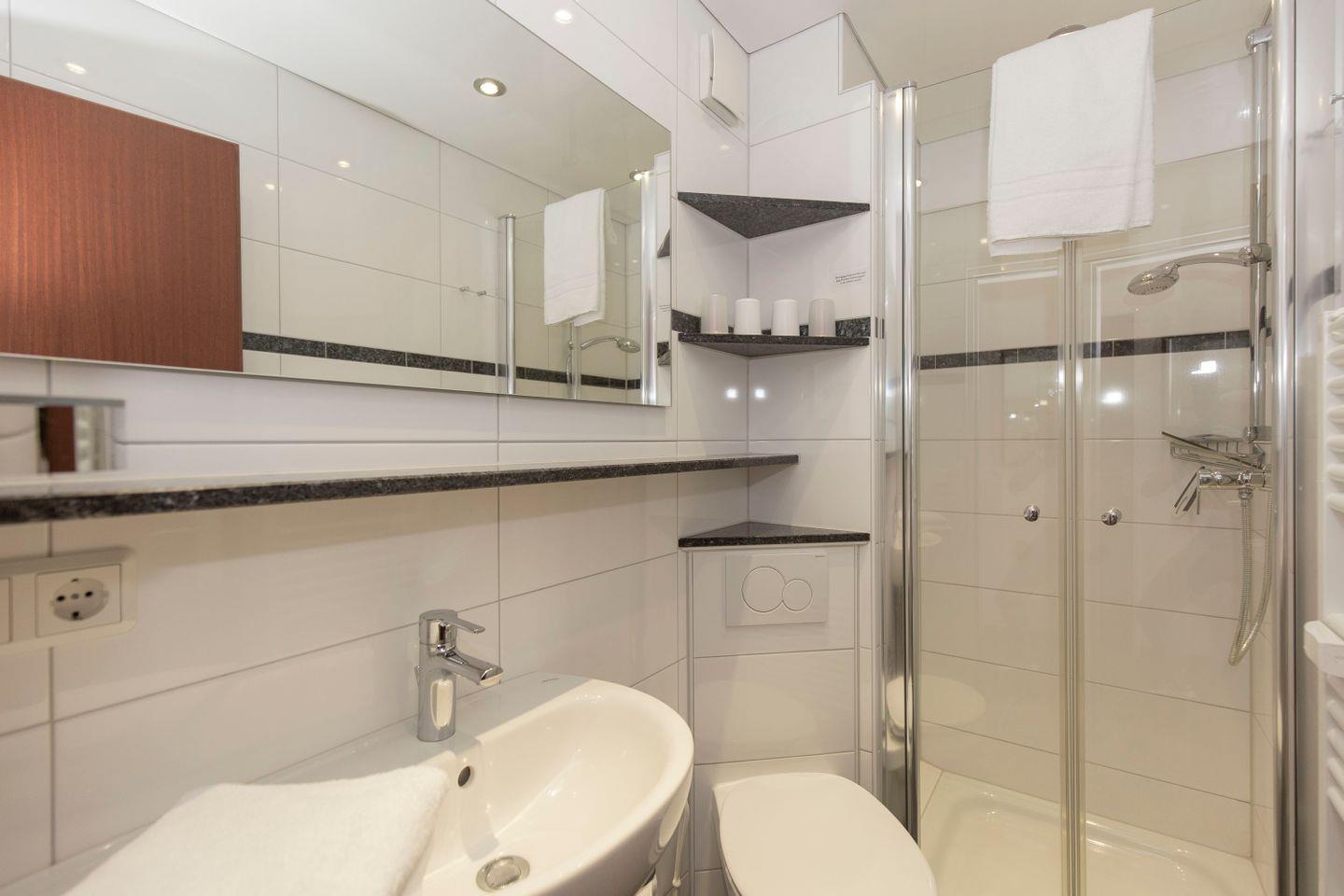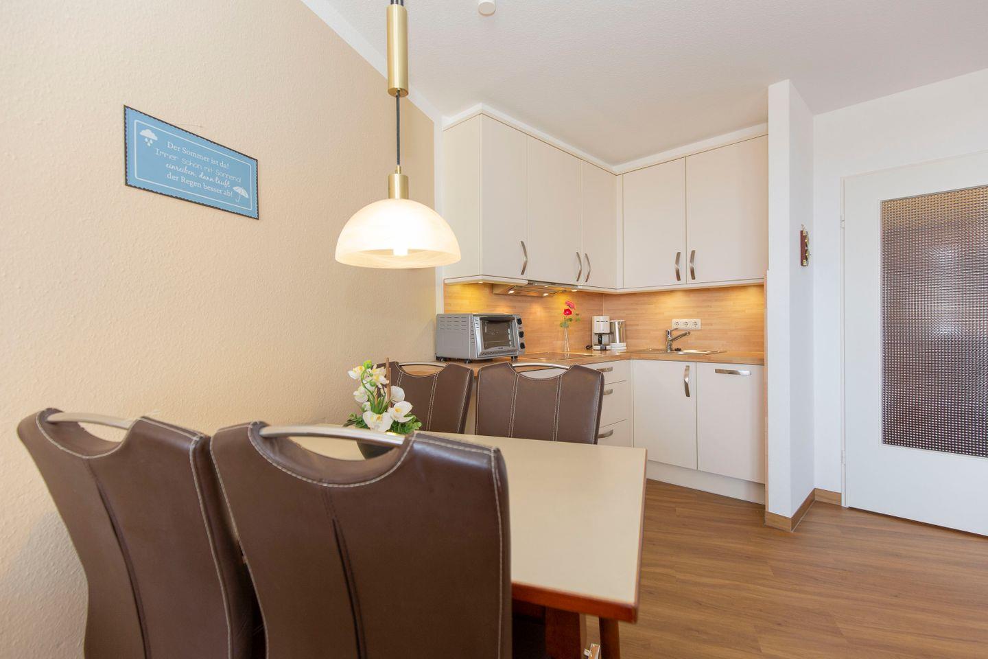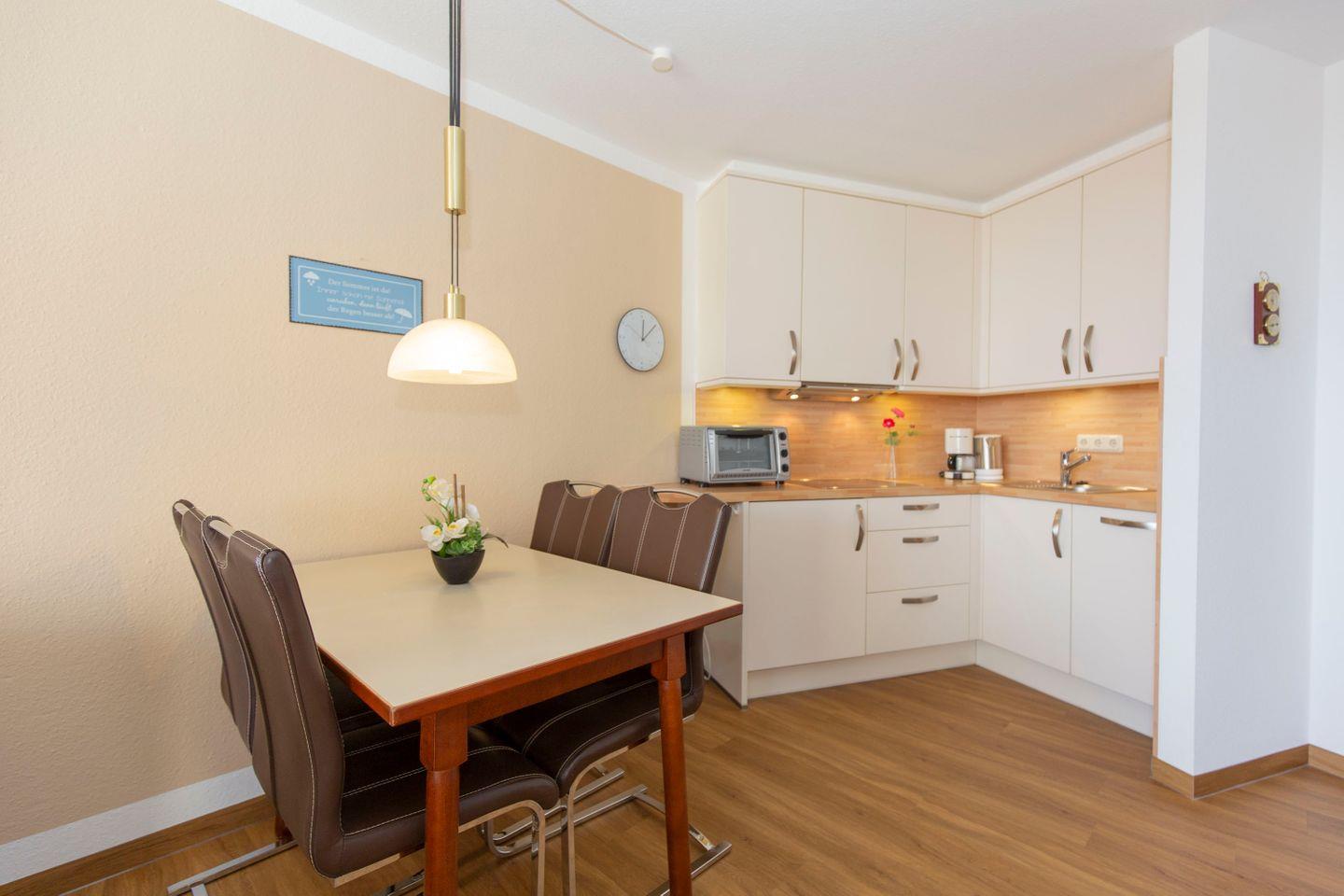 Haus "Lord Nelson", Typ 2, App.-Nr. "815", bis 3 Pers., 8. Etage, ca. 40 qm Größe, Weltschifffahrtsweg (seitlicher Meerblick Richtung Elbe), Wohnbereich mit Doppelbett, sep. kleines Schlafzimmer mit Einzelbett, Dusche/WC, Küchenzeile mit Mikrowelle, Geschirrspüler, 4-Platten-Ceranfeld, Kabel-TV, kostenl. W-Lan Zugang im App., Balkon, Außenstellplatz, Strandkorb im Sommer 2026, Nichtraucher, für Haustiere gesperrt.
