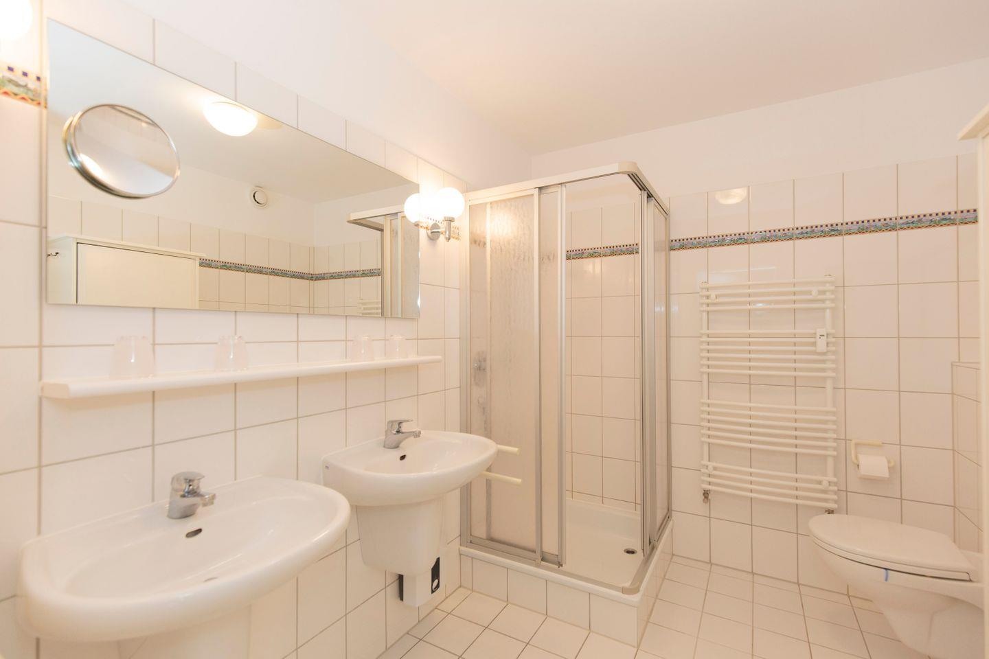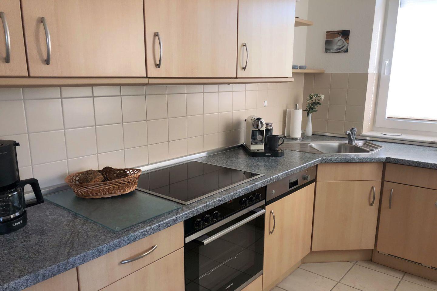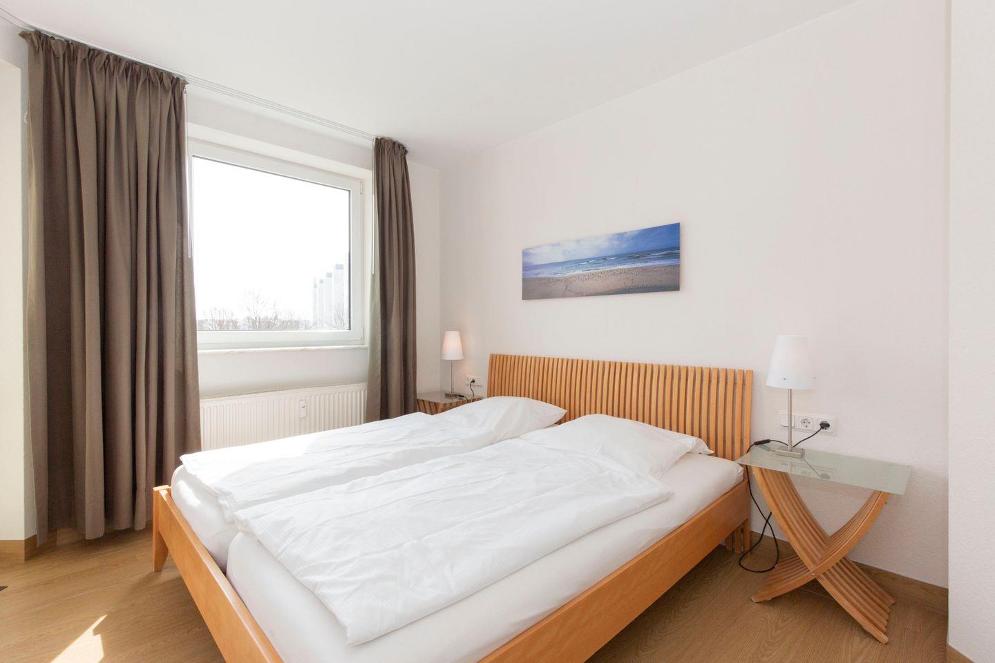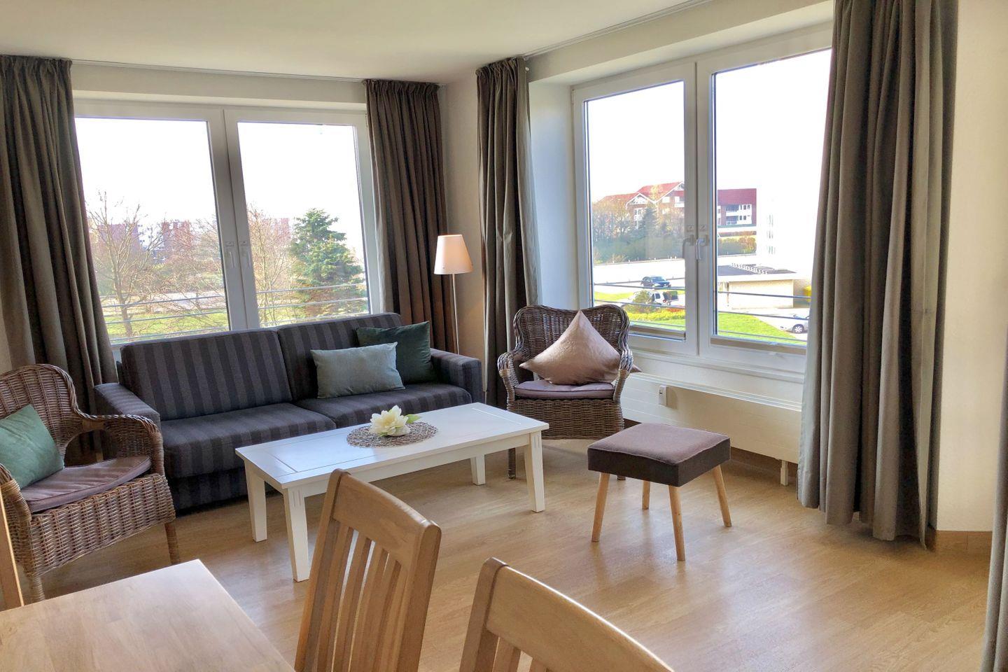 Haus "Kurpark-Residenz", Typ F, Appartement-Nr. "223", bis 6 Personen, 2. OG, Süd/Westseite, ca. 80 m² Wohnungsgröße, Wohnzimmer mit Schlafcouch, zwei separate Schlafzimmer mit Doppelbett, Dusche/WC, separate Küche mit Backofen, Geschirrspüler und einer Nespresso Kapselmaschine, 2 x Loggia, SAT-TV, kostenl. W-Lan Zugang im App., Haustiere sind nicht gestattet, Nichtraucher, Tiefgaragenstellplatz, Strandkorb im Sommer 2025.