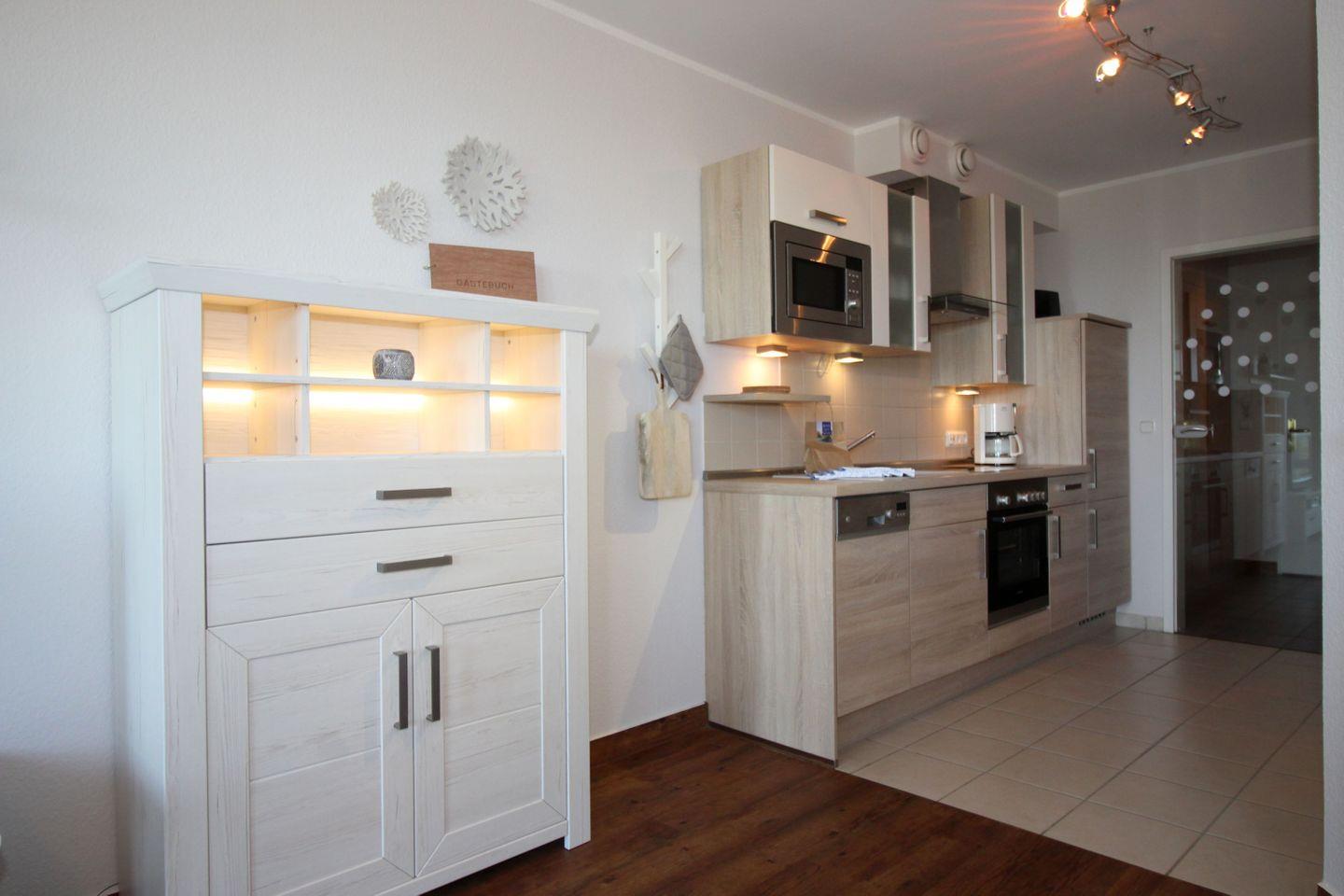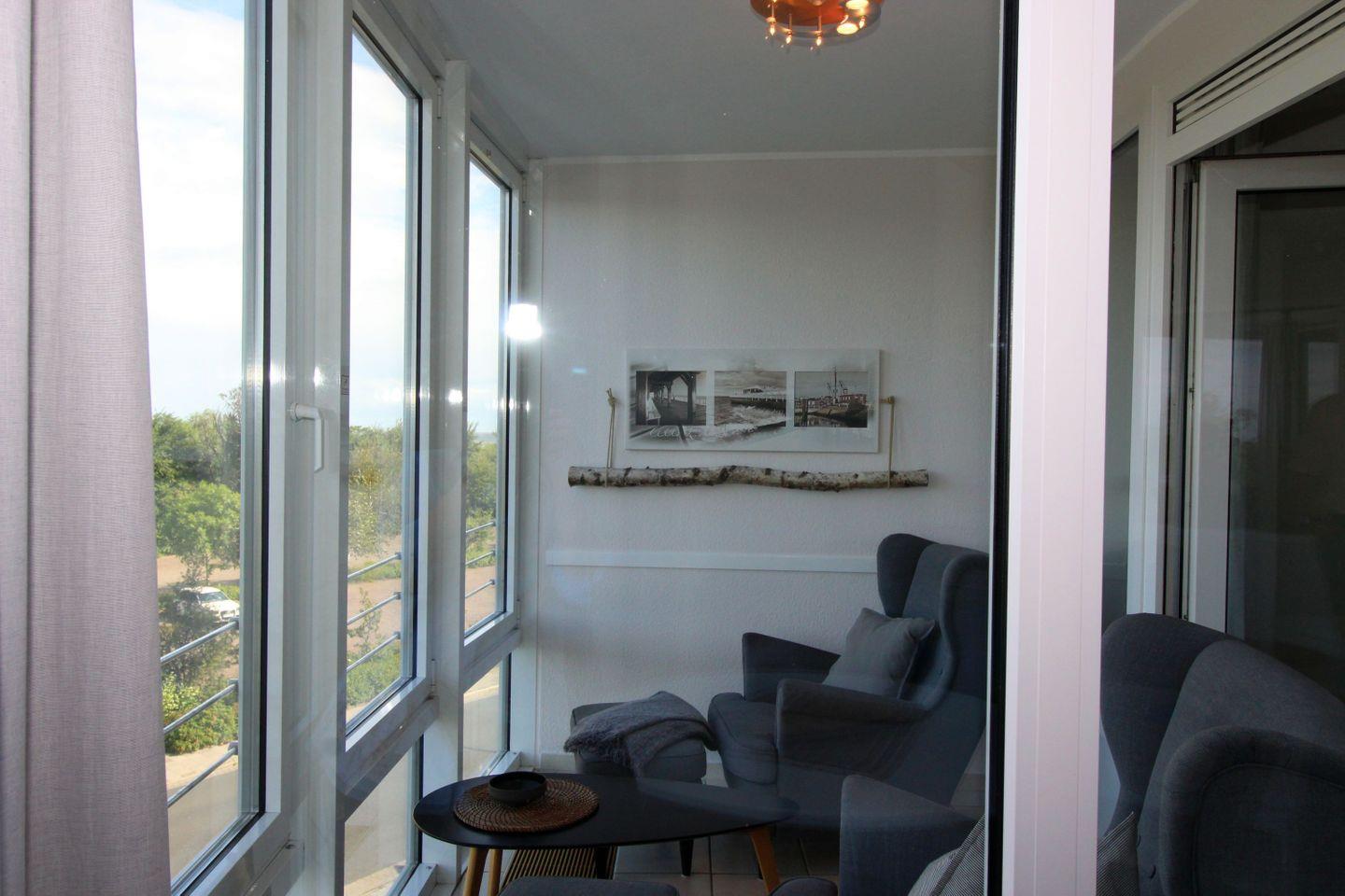 Haus "Kurpark-Residenz", Typ C, Appartement-Nr. "216", bis 4 Personen, 2. OG, Nordseite (Seesicht Richtung "Elbe"), ca. 52 m² Wohnungsgröße, Wohnzimmer mit Schlafcouch, separates Schlafzimmer mit Doppelbett (innenliegend), Dusche/WC, Küchenzeile mit Mikrowelle, Backofen und Geschirrspüler, Wintergarten, SAT-TV, WLAN, Tiefgaragenstellplatz, Nichtraucher, Strandkorb im Sommer 2025.