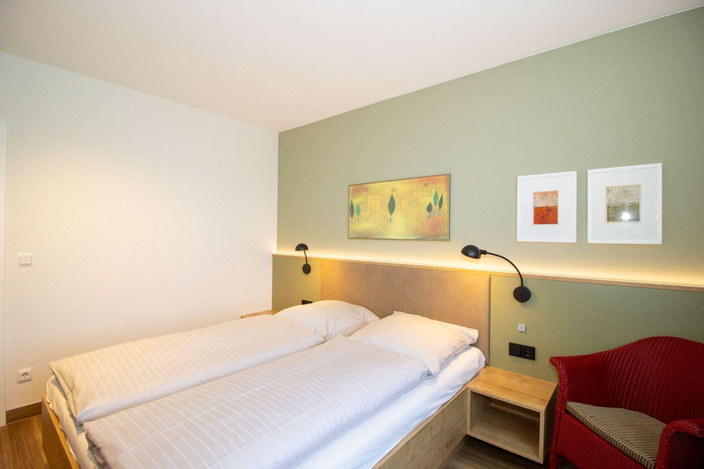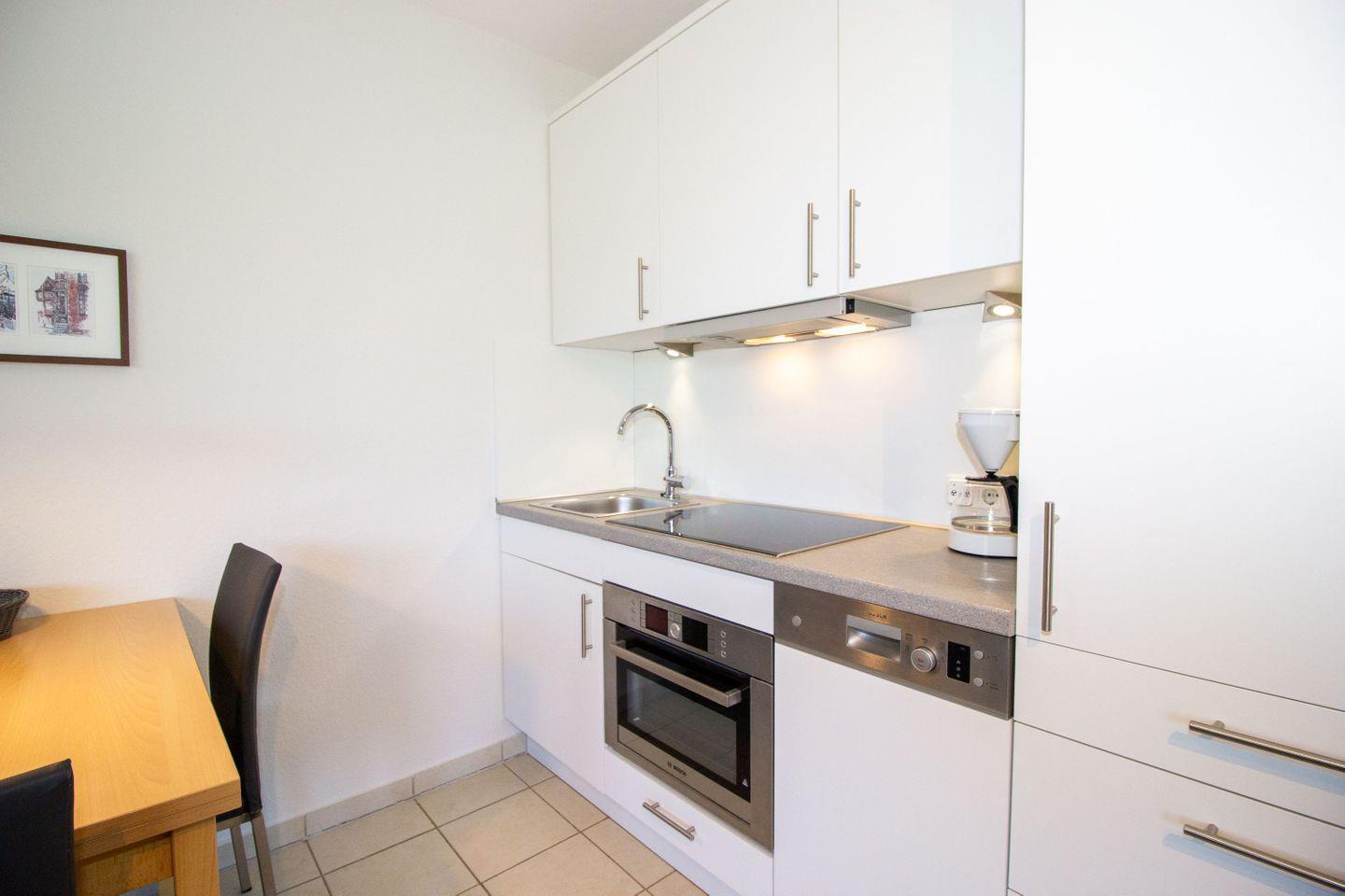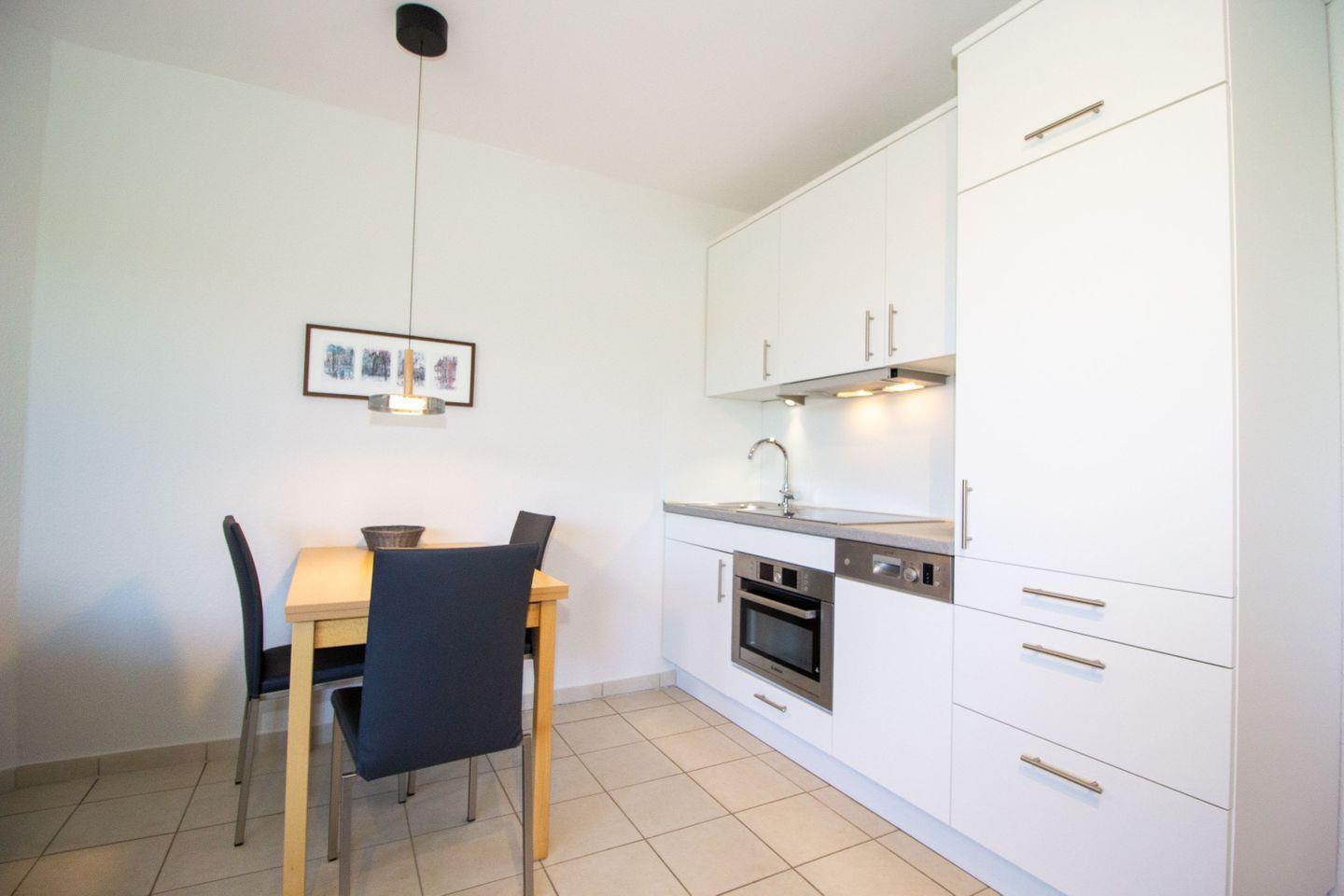 Haus "Kurpark-Residenz", Typ C, Appartement-Nr. "117", 1. OG, Nordseite , ca. 48 m² Wohnungsgröße für maximal 4 Personen, Wohnzimmer mit Schlafsofa, SAT-Fernseher und Stereoanlage, kostenl. W-Lan Zugang im App., separates Schlafzimmer mit Doppelbett (Breite 160cm) und TV Gerät, Dusche/WC, großzügig ausgestattete Küchenzeile mit Mikrowelle, Backofen und Geschirrspüler, Sonnenterrasse in der 1. Etage nutzbar, Tiefgaragenstellplatz, Nichtraucher, Haustiere sind nicht gestattet, Strandkorb im Sommer 2026.