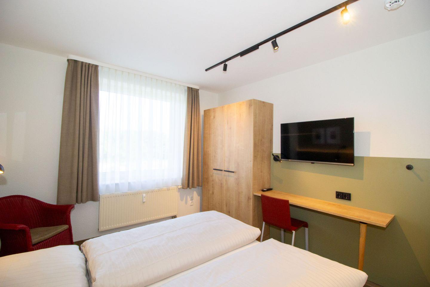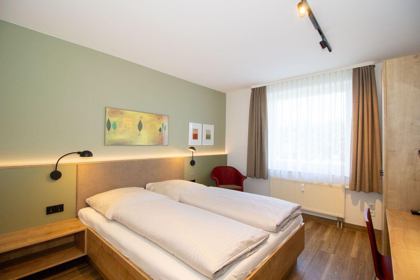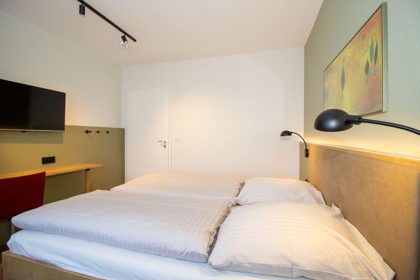 Haus "Kurpark-Residenz", Typ C, Appartement-Nr. "117", 1. OG, Nordseite , ca. 48 m² Wohnungsgröße für maximal 4 Personen, Wohnzimmer mit Schlafsofa, SAT-Fernseher und Stereoanlage, kostenl. W-Lan Zugang im App., separates Schlafzimmer mit Doppelbett (Breite 160cm) und TV Gerät, Dusche/WC, großzügig ausgestattete Küchenzeile mit Mikrowelle, Backofen und Geschirrspüler, Sonnenterrasse in der 1. Etage nutzbar, Tiefgaragenstellplatz, Nichtraucher, Haustiere sind nicht gestattet, Strandkorb im Sommer 2026.