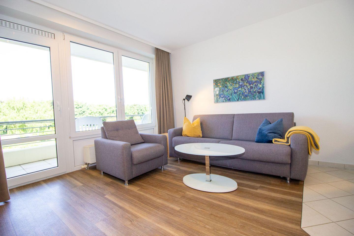 Schönes Appartement mit Schlafsofa im Wohnbereich, dessen Fensterfront auf den Deich gerichtet ist. Das separate, gemütliche Schlafzimmer bietet weiteren zwei Personen eine Schlafgelegenheit.