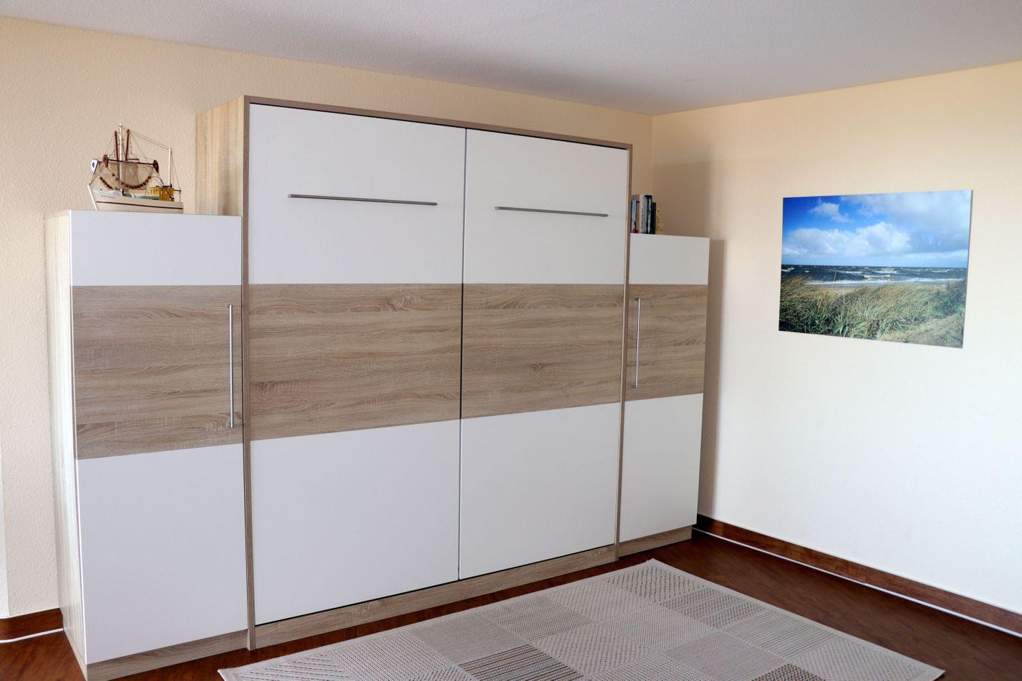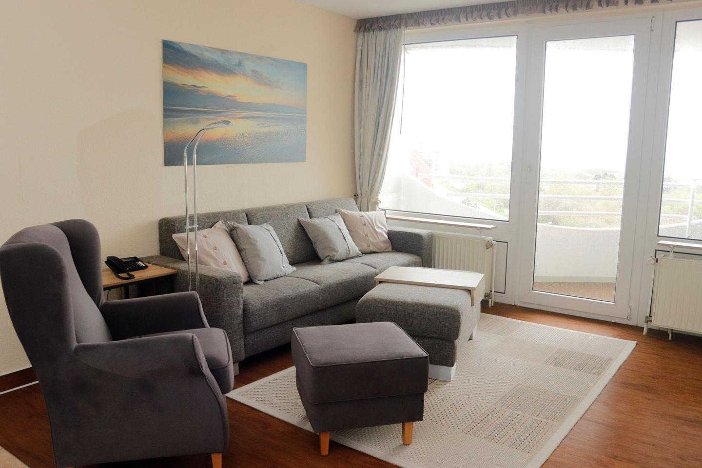 Haus "Lord Nelson", Typ 4, App.-Nr. "707", bis 2 Pers., 7. Etage, ca. 40 qm, am Weltnaturerbe Wattenmeer (Meerblick Richtung Neuwerk), Wohnbereich mit Schrankbett, Dusche/WC, Küchenzeile mit Geschirrspüler, Mikrowelle, Telefon, Kabel-TV, kostenl. W-Lan Zugang im App., Balkon, Tiefgaragenstellplatz, Strandkorb im Sommer 2025.