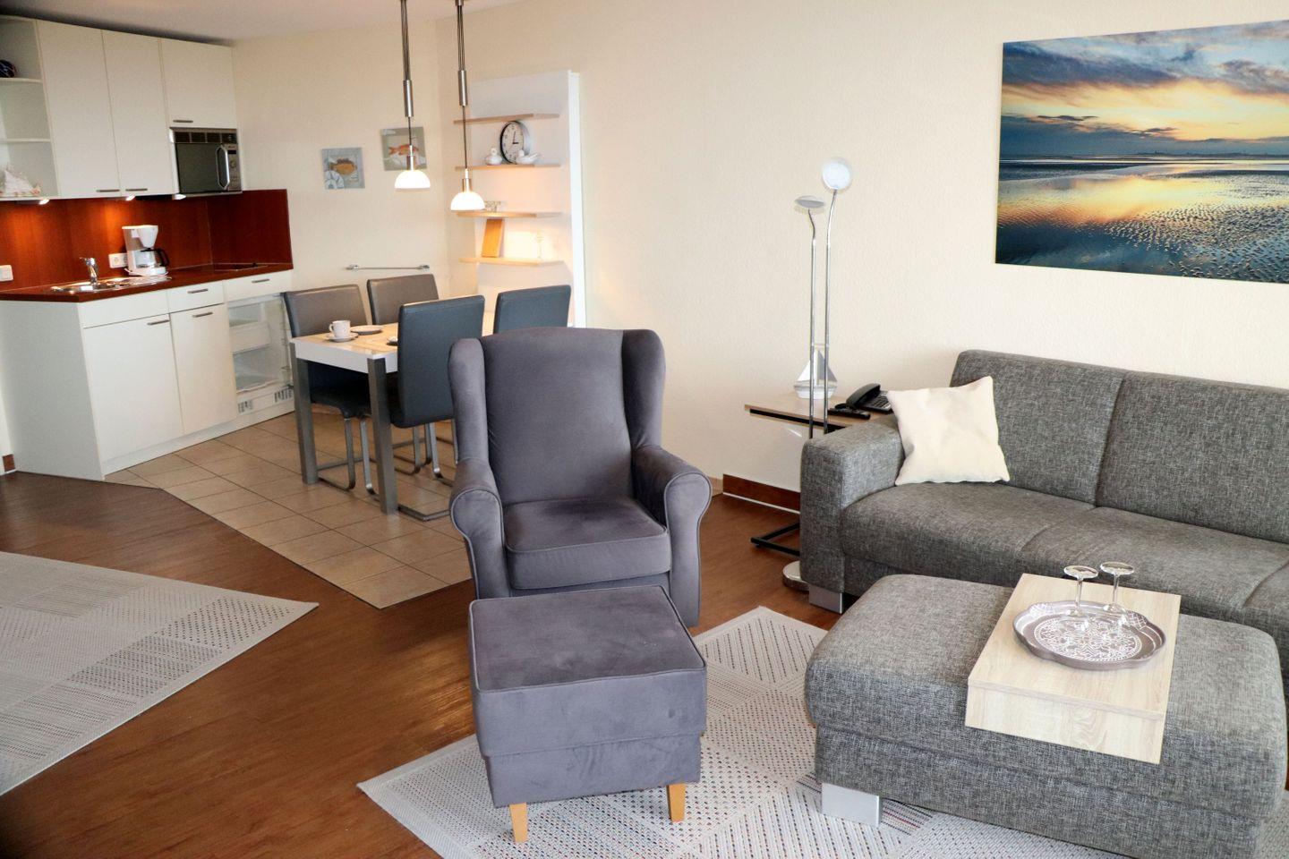 Die 40 m² große Ferienwohnung (Hundefreundlich) bietet Platz für bis zu zwei Urlaubsgästen, perfekt für Paare oder Alleinreisende. Helle Räume und eine elegante Einrichtung kreieren Wohlfühlambiente und machen das Urlaubsdomizil zu einem liebenswerten Rückzugsort. Hier wohnen Sie ganz nah an der Nordsee in absoluter Top-Lage.