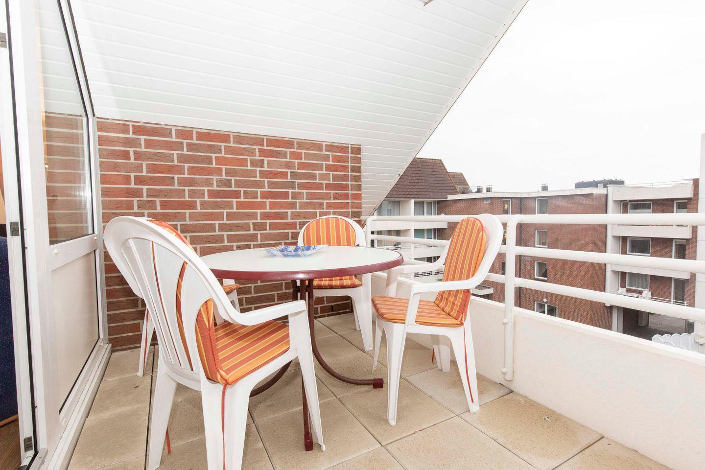 Nach einem ereignisreichen Urlaubstag können die Urlaubsgäste den Tag auf dem geschützten Balkon an der frischen Nordseeluft gemeinsam Revue passieren lassen.