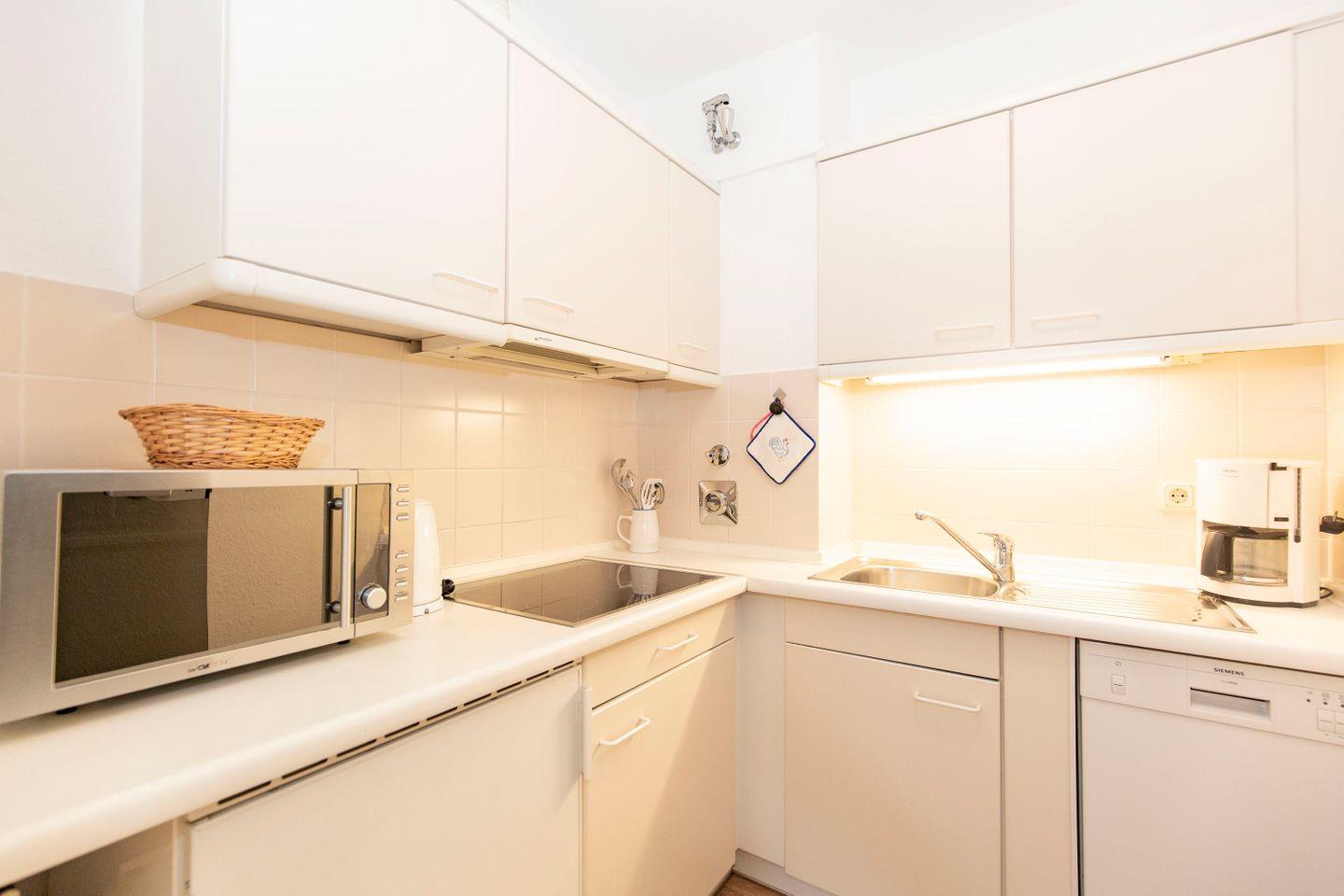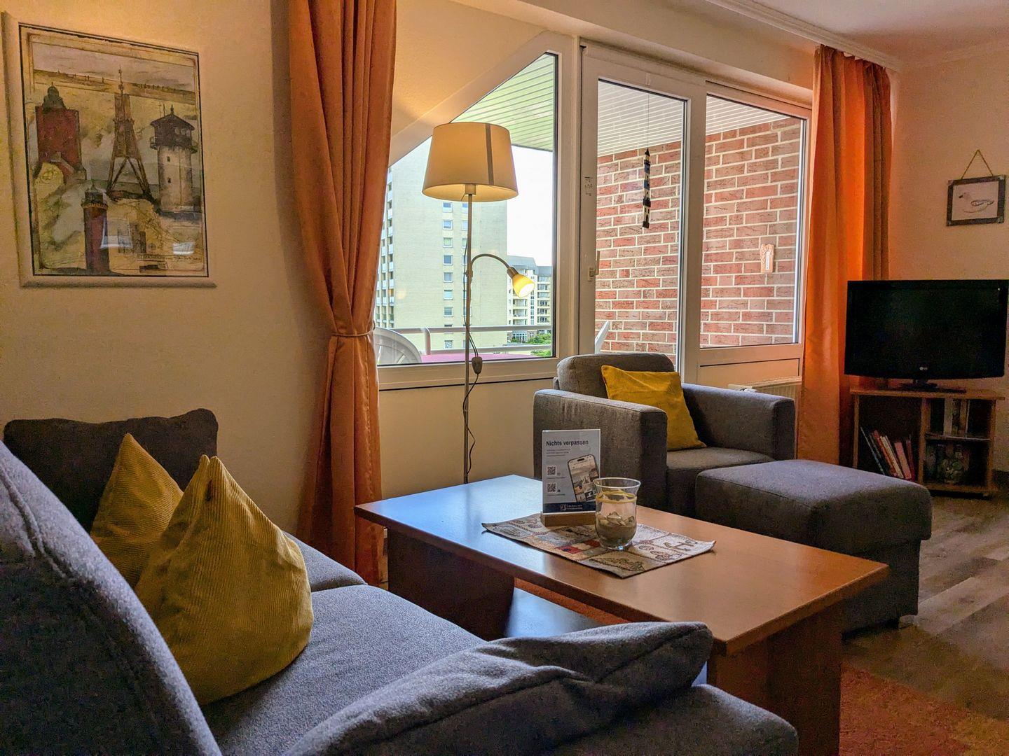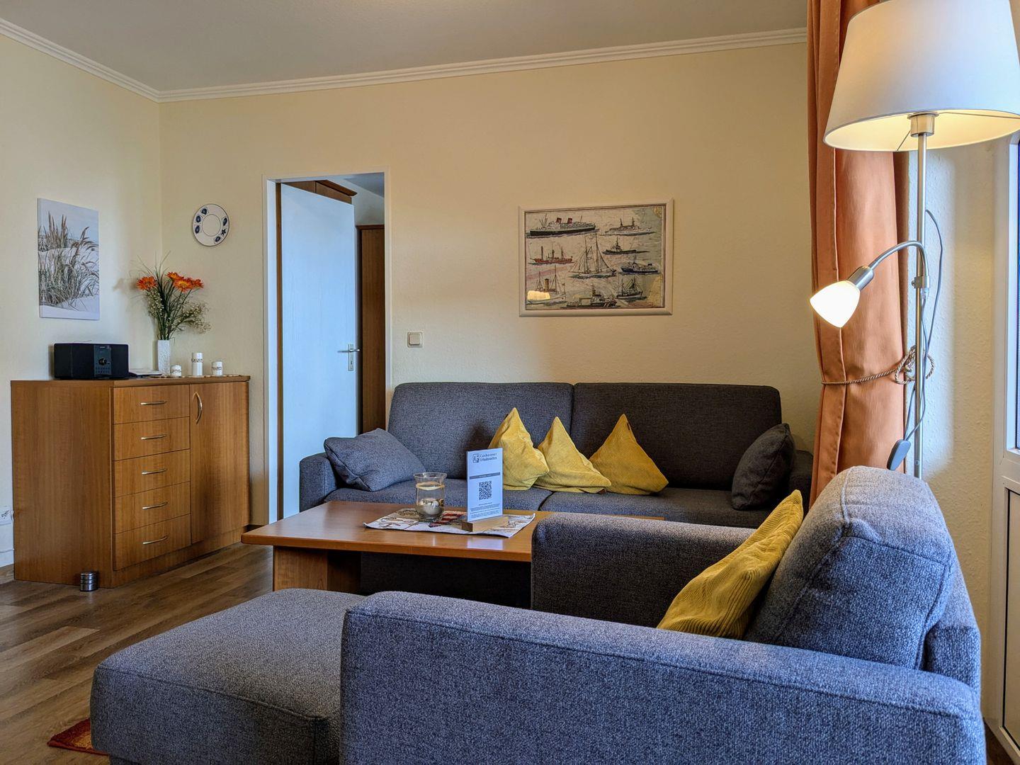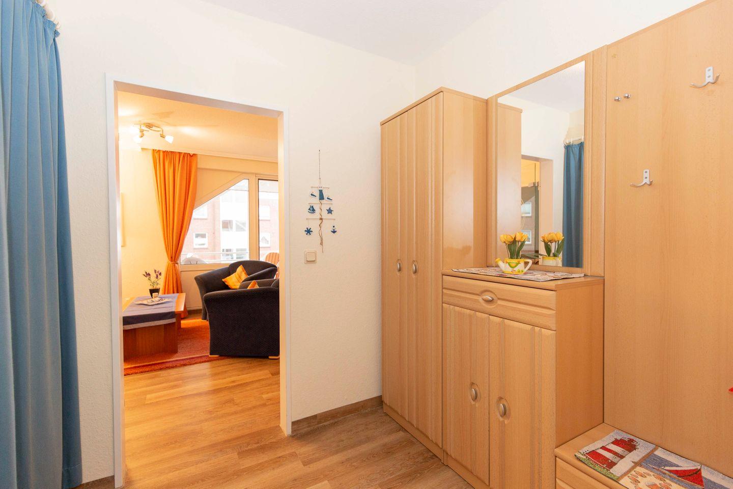 Haus "Trafalgar", Typ C, App-Nr. "355", max. bis 4 Pers., 3. Etage, ca. 53 qm Größe, Nordseite (ohne Meerblick), Wohn/Schlafraum mit Schlafcouch, Schlafzimmer mit Doppelbett, sep. Küche mit Mikrowelle, Ceranfeld und Geschirrspüler, Dusche/WC, Gäste WC, Balkon, Telefon, Kabel-TV, kostenl. W-Lan Zugang im App, Tiefgaragenstellplatz, Nichtraucherappartement, Strandkorb im Sommer 2025, max. 2 Hunde pro Buchung