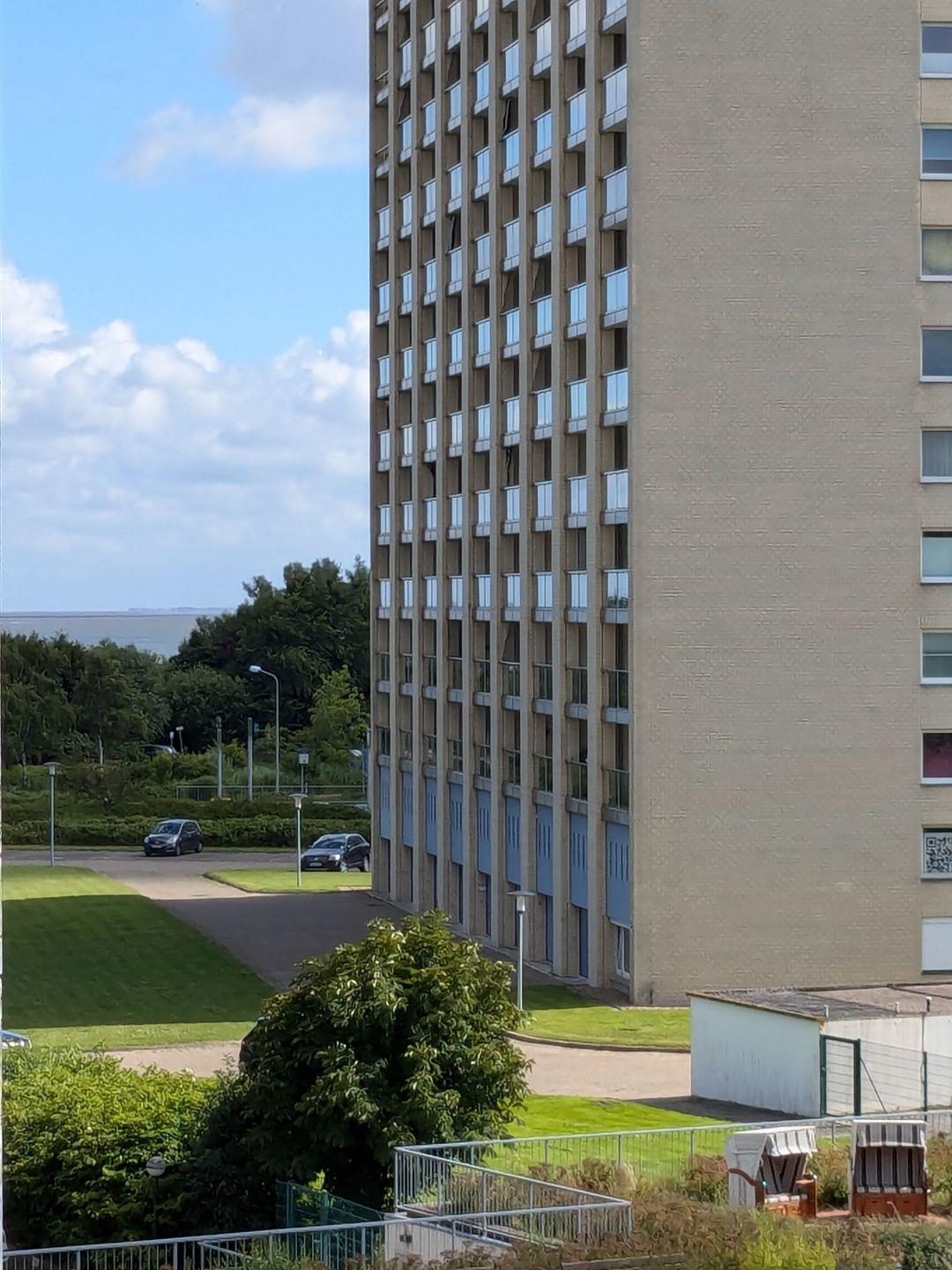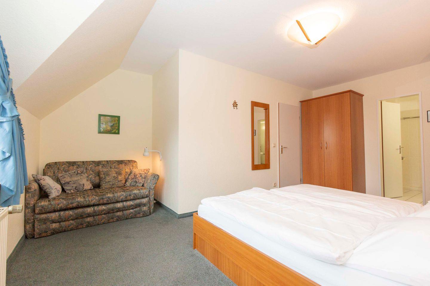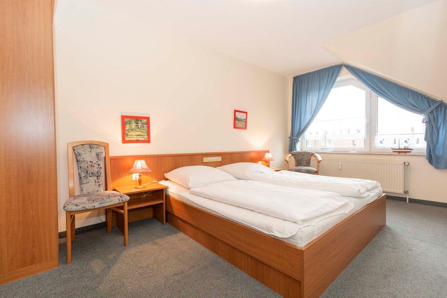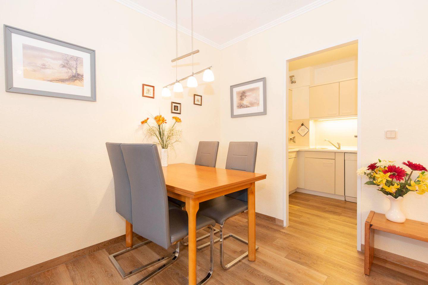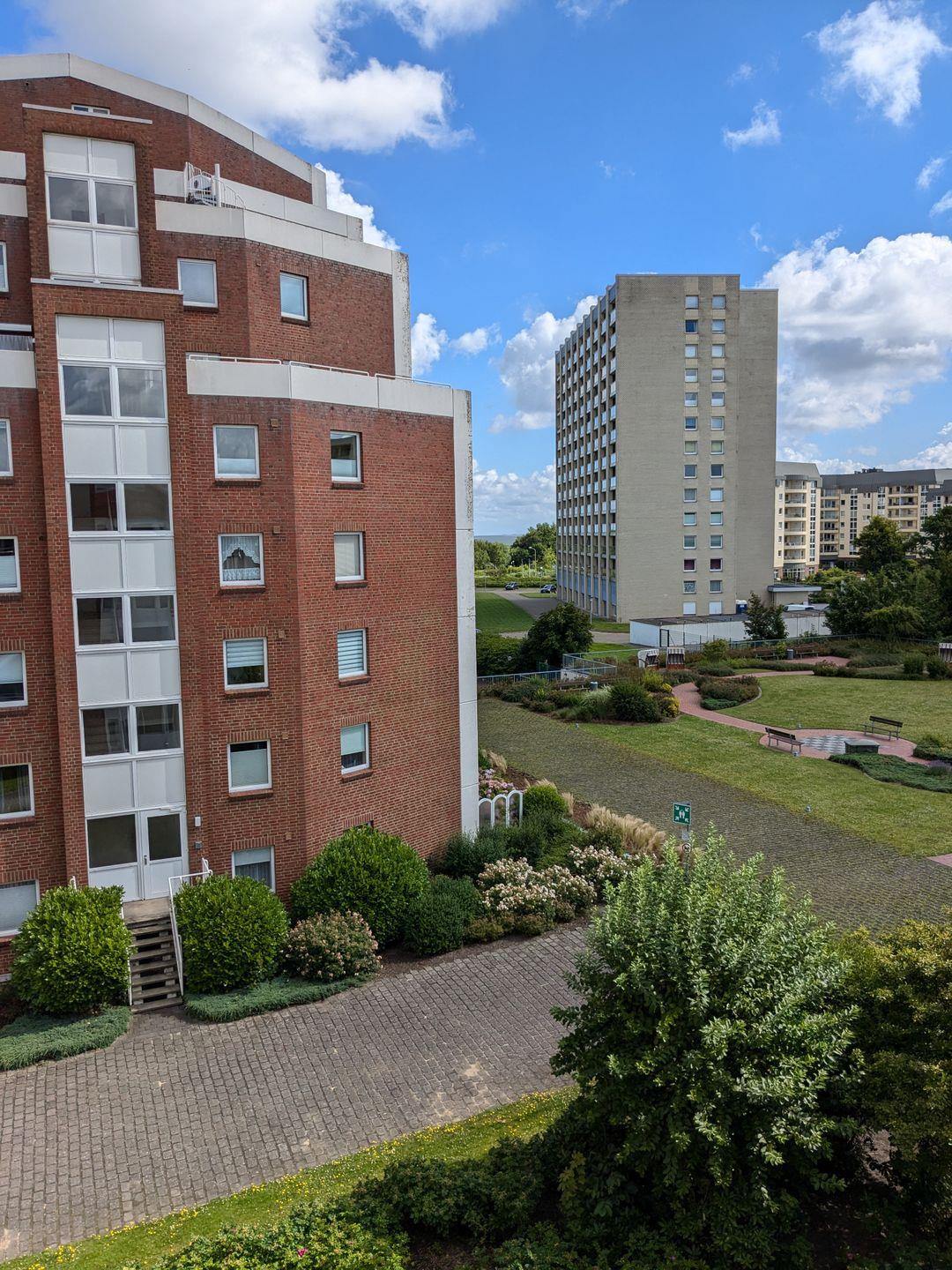 Haus "Trafalgar", Typ C, App-Nr. "355", max. bis 4 Pers., 3. Etage, ca. 53 qm Größe, Nordseite (ohne Meerblick), Wohn/Schlafraum mit Schlafcouch, Schlafzimmer mit Doppelbett, sep. Küche mit Mikrowelle, Ceranfeld und Geschirrspüler, Dusche/WC, Gäste WC, Balkon, Telefon, Kabel-TV, kostenl. W-Lan Zugang im App, Tiefgaragenstellplatz, Nichtraucherappartement, Strandkorb im Sommer 2025, max. 2 Hunde pro Buchung