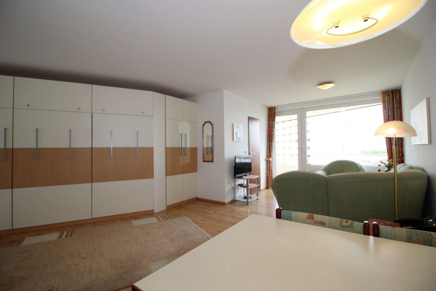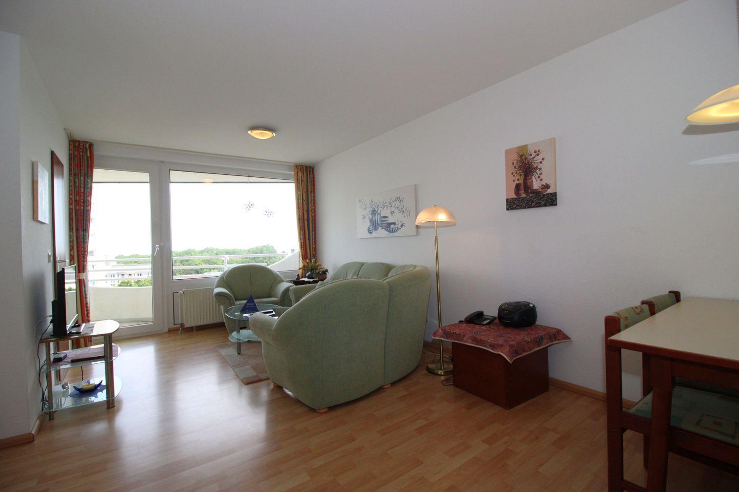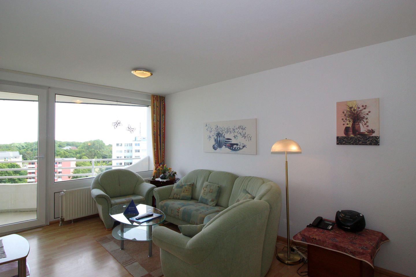 Haus "Lord Nelson", Typ 2, Appartement-Nr. "817", bis 4 Personen, 8. Etage, ca. 40 qm Wohnungsgröße, Weltschifffahrtsweg (seitlicher Meerblick Richtung Elbe), Wohnbereich mit Schrankbett, separates kleines Kinderzimmer mit Etagenbett, Dusche/WC, Küchenzeile mit Geschirrspüler und Mikrowelle/4 Platten-Ceranfeld, Telefon, Kabel-TV, Nichtraucher App., Balkon, Tiefgaragenstellplatz, Strandkorb im Sommer 2025, kostenloser WLAN-Zugang.