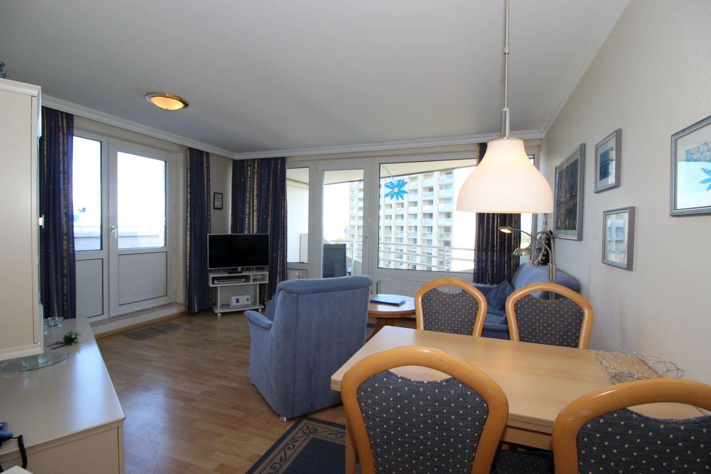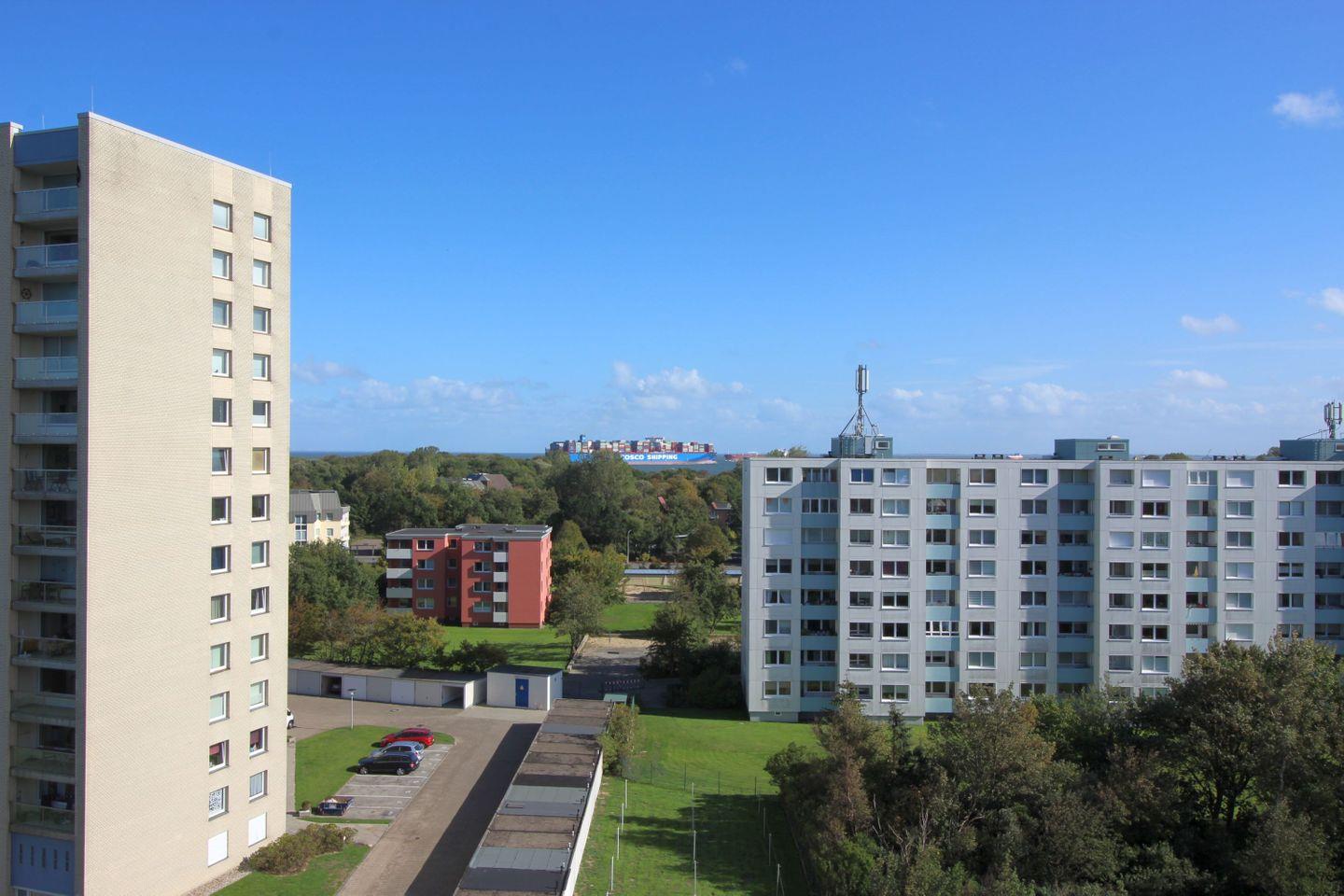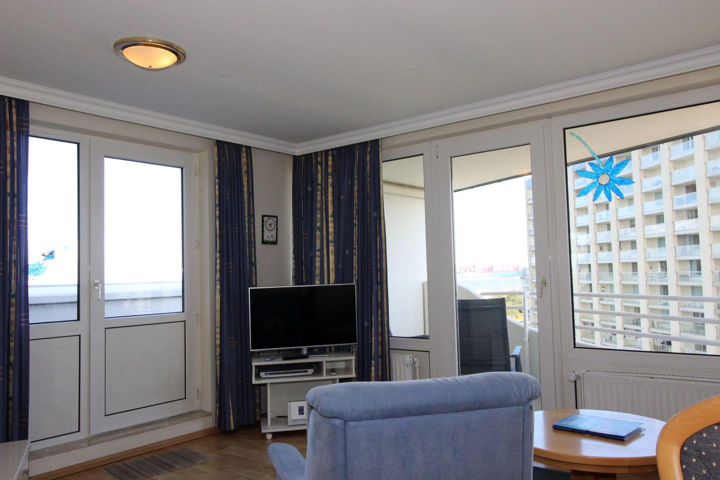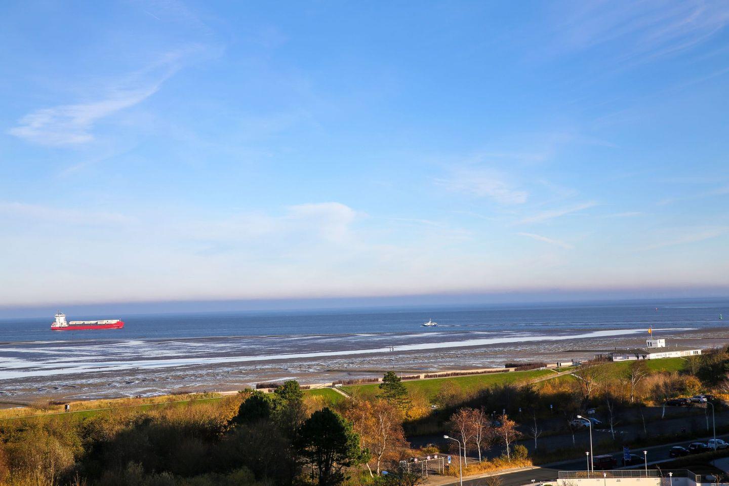 Haus "Lord Nelson", Typ 1, Appartement-Nr. "819", bis 2 Personen, 8. Etage, ca. 43 qm Wohnungsgröße, Meerblick Richtung Elbmündung und Weltschifffahrtsweg, separates Schlafzimmer mit zwei Einzelbetten, Dusche/WC, Küchenzeile mit Geschirrspüler, Mikrowelle, 4-Platten-Ceranfeld, Telefon, Kabel-TV, kostenl. WLAN-Zugang im App., Balkon, Dachterrasse, Haustiere nicht erlaubt, Nichtraucherappartement, Tiefgaragenstellplatz, Strandkorb im Sommer 2026.