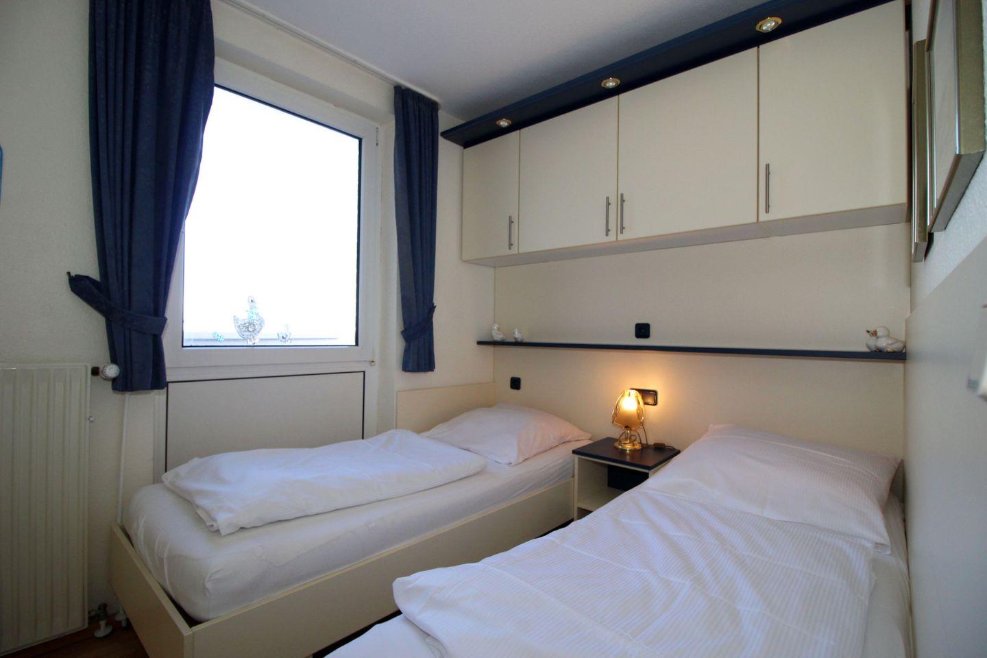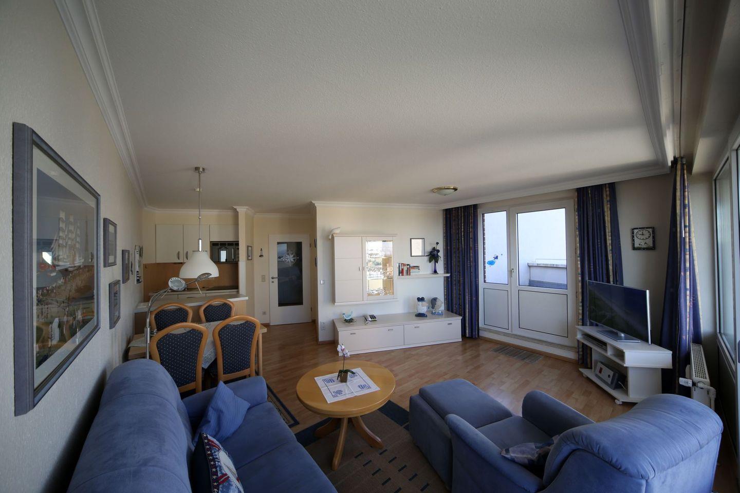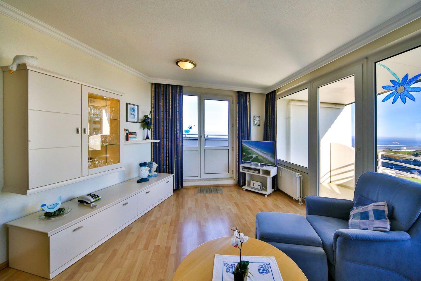 Haus "Lord Nelson", Typ 1, Appartement-Nr. "819", bis 2 Personen, 8. Etage, ca. 43 qm Wohnungsgröße, Meerblick Richtung Elbmündung und Weltschifffahrtsweg, separates Schlafzimmer mit zwei Einzelbetten, Dusche/WC, Küchenzeile mit Geschirrspüler, Mikrowelle, 4-Platten-Ceranfeld, Telefon, Kabel-TV, kostenl. WLAN-Zugang im App., Balkon, Dachterrasse, Haustiere nicht erlaubt, Nichtraucherappartement, Tiefgaragenstellplatz, Strandkorb im Sommer 2026.