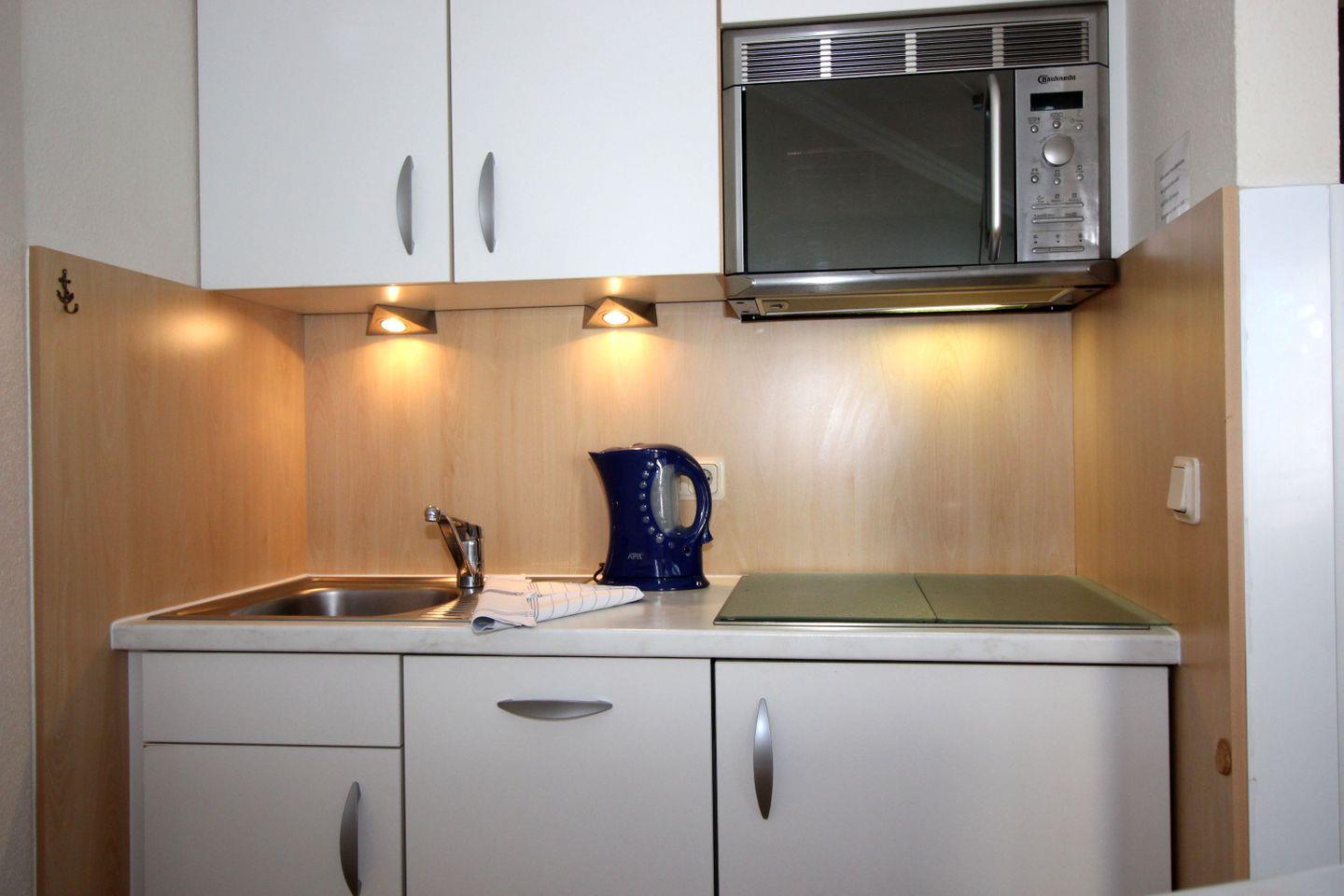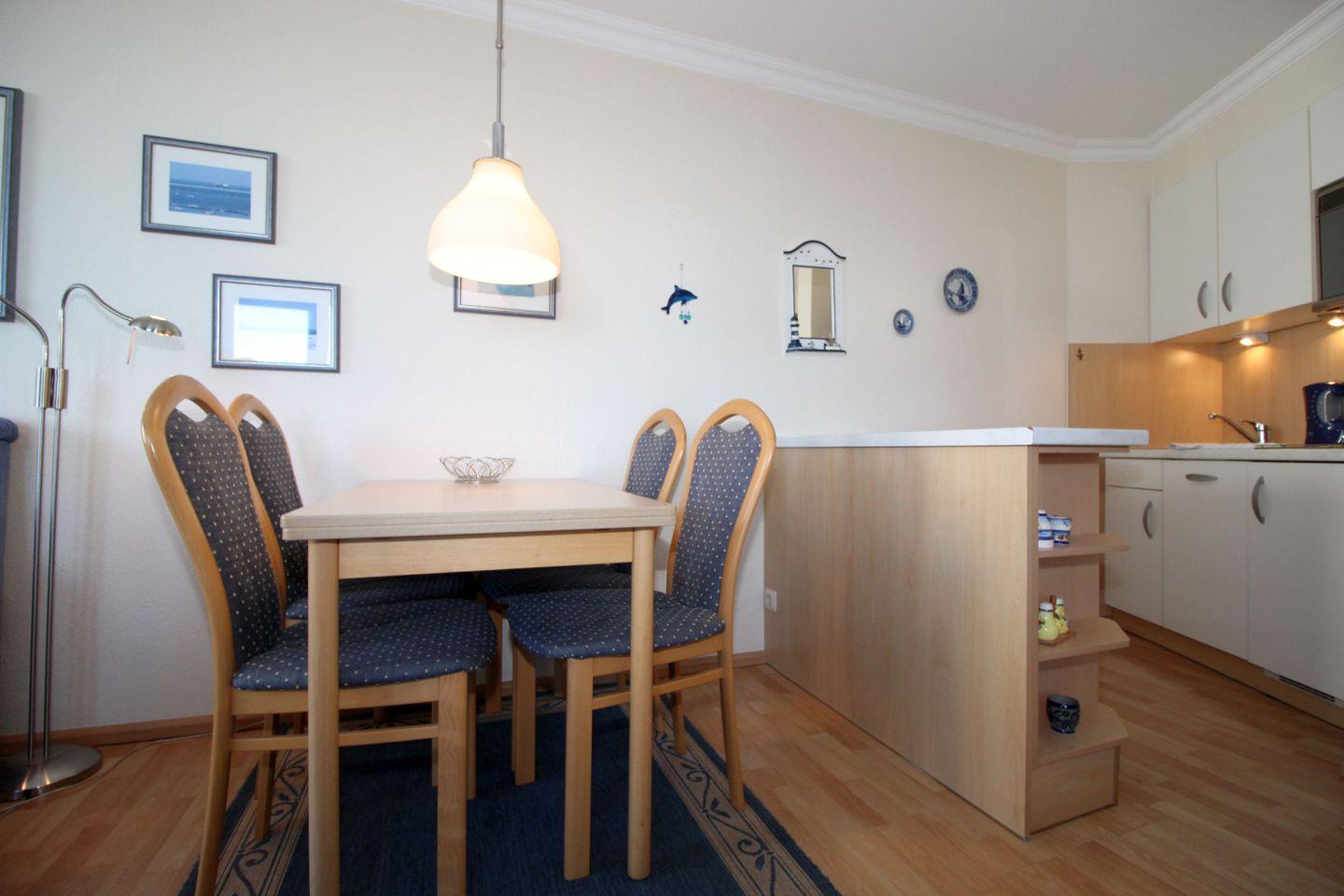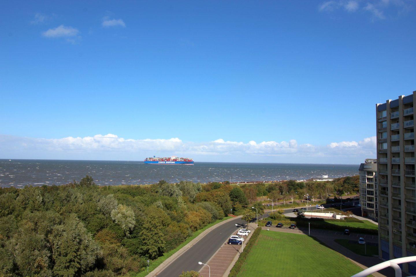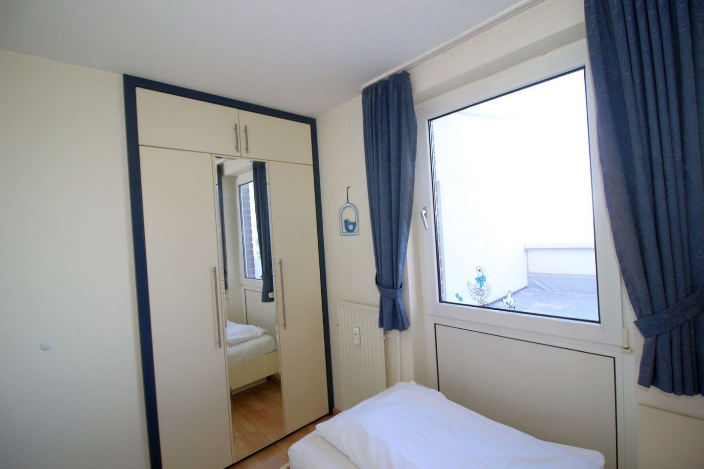 Haus "Lord Nelson", Typ 1, Appartement-Nr. "819", bis 2 Personen, 8. Etage, ca. 43 qm Wohnungsgröße, Meerblick Richtung Elbmündung und Weltschifffahrtsweg, separates Schlafzimmer mit zwei Einzelbetten, Dusche/WC, Küchenzeile mit Geschirrspüler, Mikrowelle, 4-Platten-Ceranfeld, Telefon, Kabel-TV, kostenl. WLAN-Zugang im App., Balkon, Dachterrasse, Haustiere nicht erlaubt, Nichtraucherappartement, Tiefgaragenstellplatz, Strandkorb im Sommer 2026.