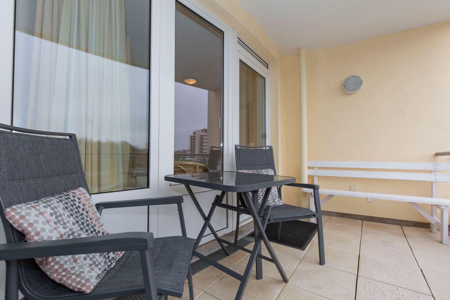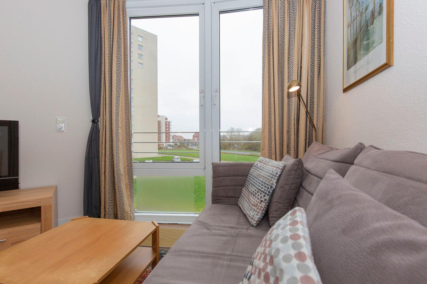 Haus "Kurpark-Residenz", Typ A, App.-Nr. "119", bis 3 Personen, 1.OG, ca. 38 m² Größe, Westseite, Wohnzimmer mit Schlafcouch, separates Schlafzimmer mit Doppelbett, Dusche/WC, Küchenzeile mit Backofen, Loggia, SAT-TV,WLAN im App., Tiefgaragenstellplatz, Nichtraucher, Haustiere sind nicht gestattet, Strandkorb im Sommer 2026.