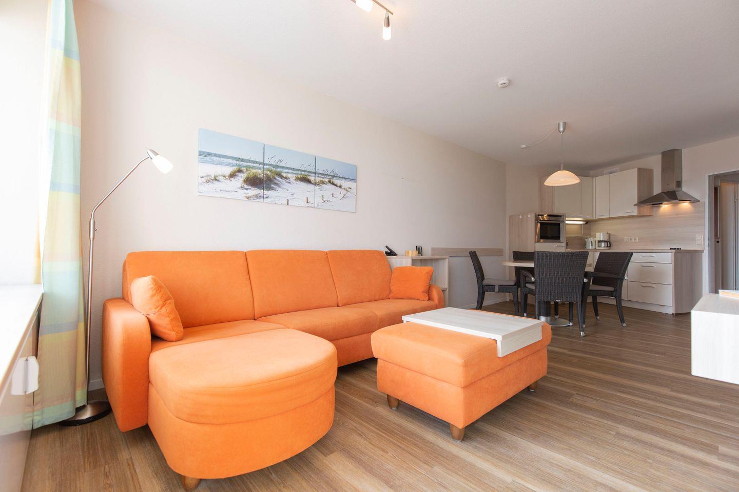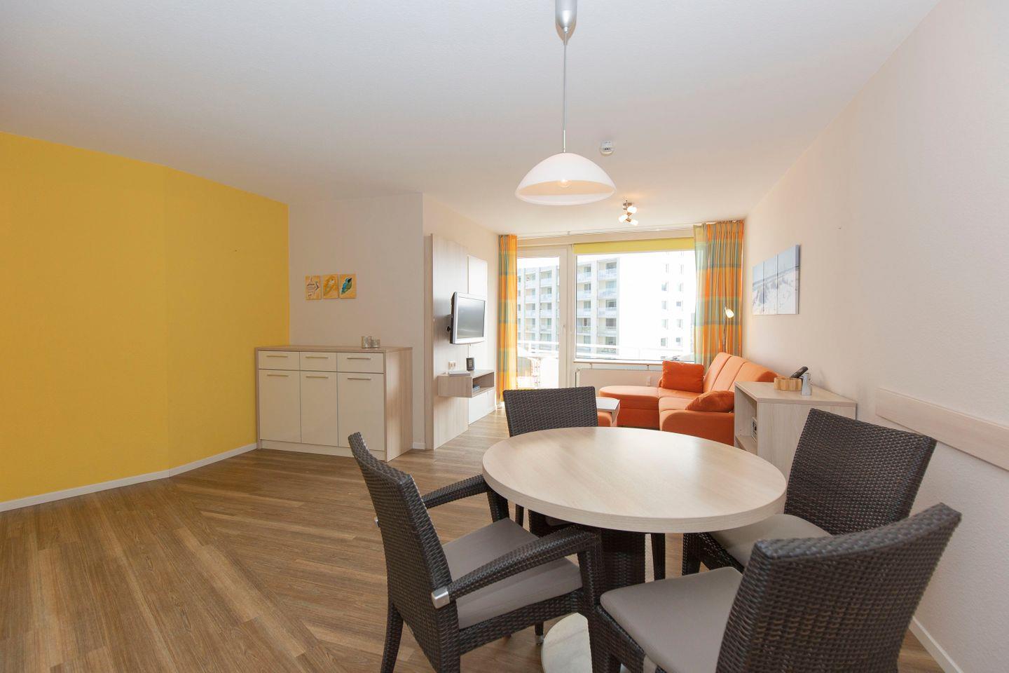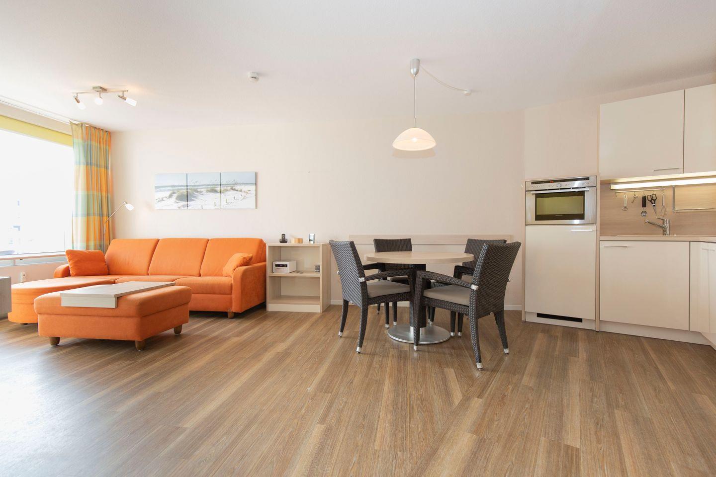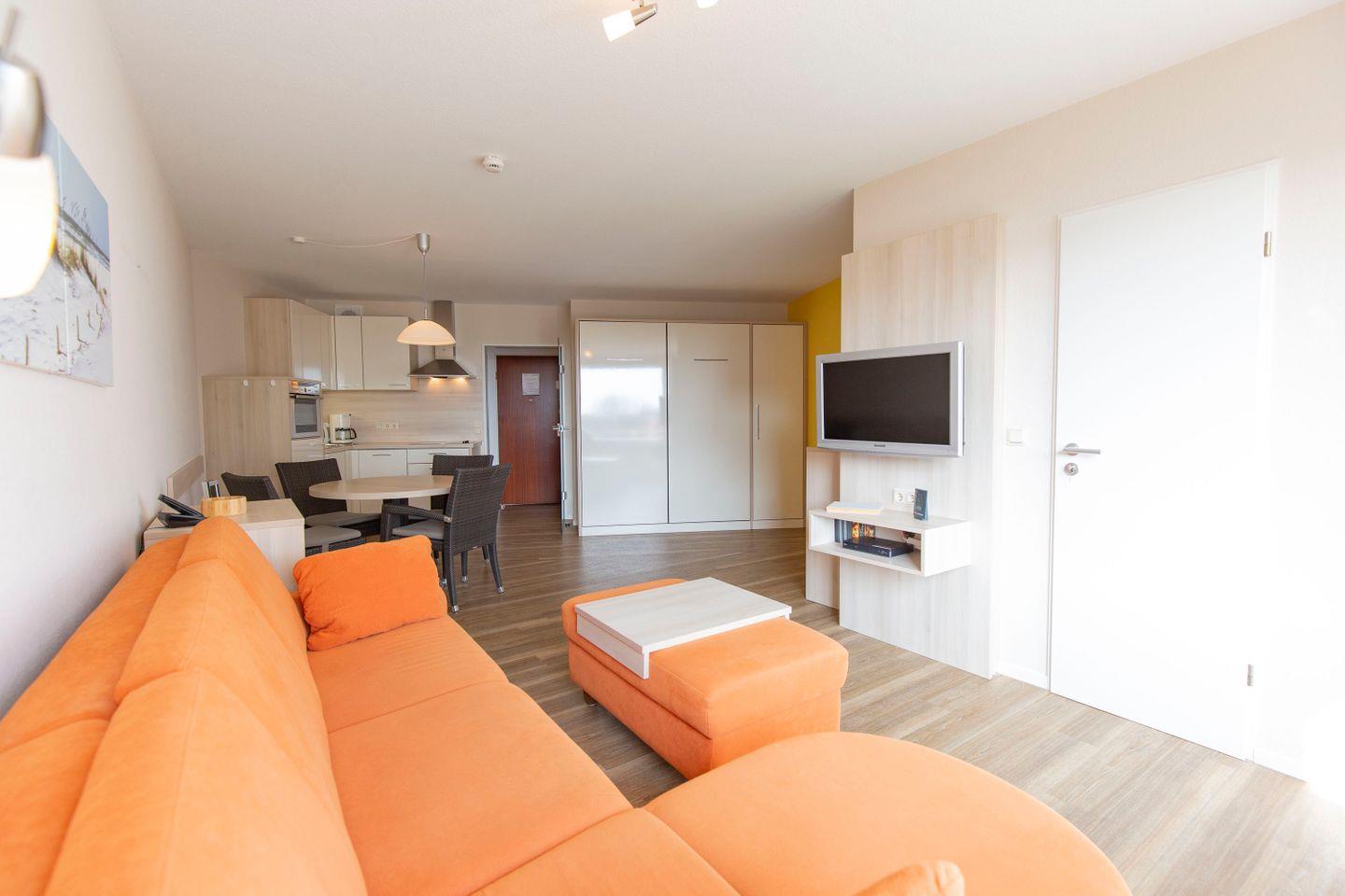 Haus "Lord Nelson", Typ 2, App.-Nr. 419, bis 4 Pers., ca. 40 qm, Weltschifffahrtsweg, seitlicher Meerblick Richtung Elbe, Wohnbereich mit Schrankbett (einzeln klappbar), Kinderzimmer mit Etagenbett, Dusche/WC, Küchenzeile mit 4-Platten-Ceranfeld, Geschirrspüler, Mikrowelle, Backofen, Balkon, Flatscreen-TV (schwenkbar zum Bett), Blu-Ray-Player, Stereo Musiksystem mit Bluetooth, CD, USB DAB+ und Radio, kostenl. W-Lan Zugang im App., Nichtraucherwohnung, Haustiere sind nicht erlaubt, Tiefgaragenstellplatz, Strandkorb im Sommer 2026.