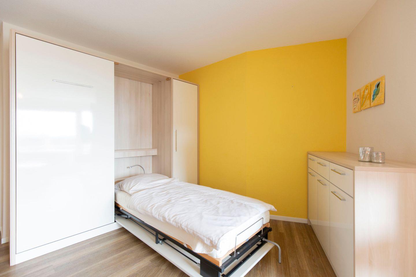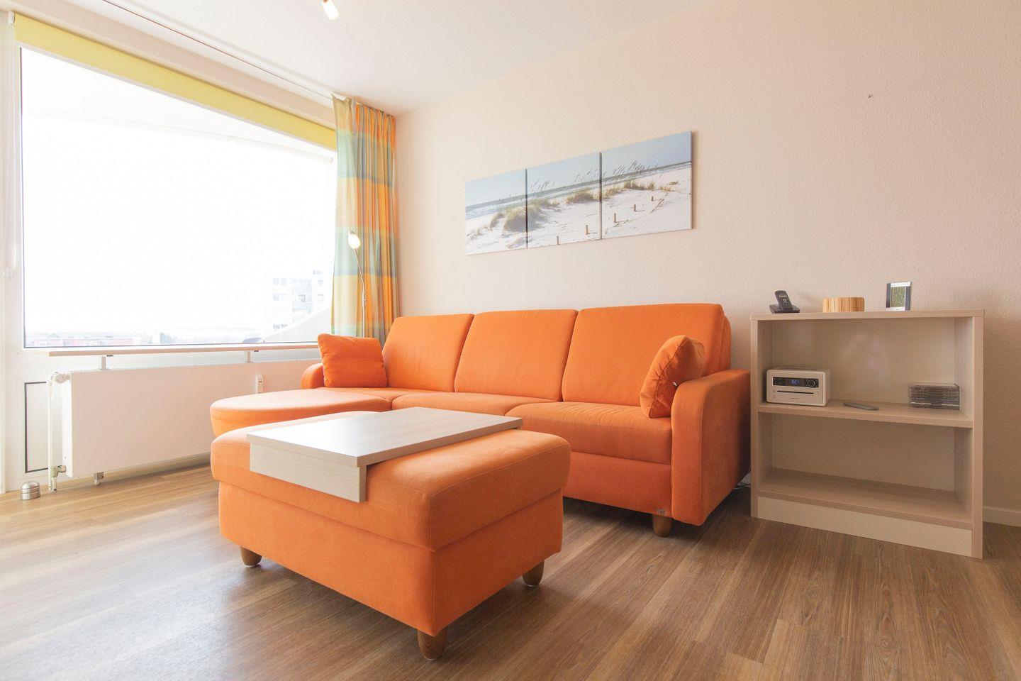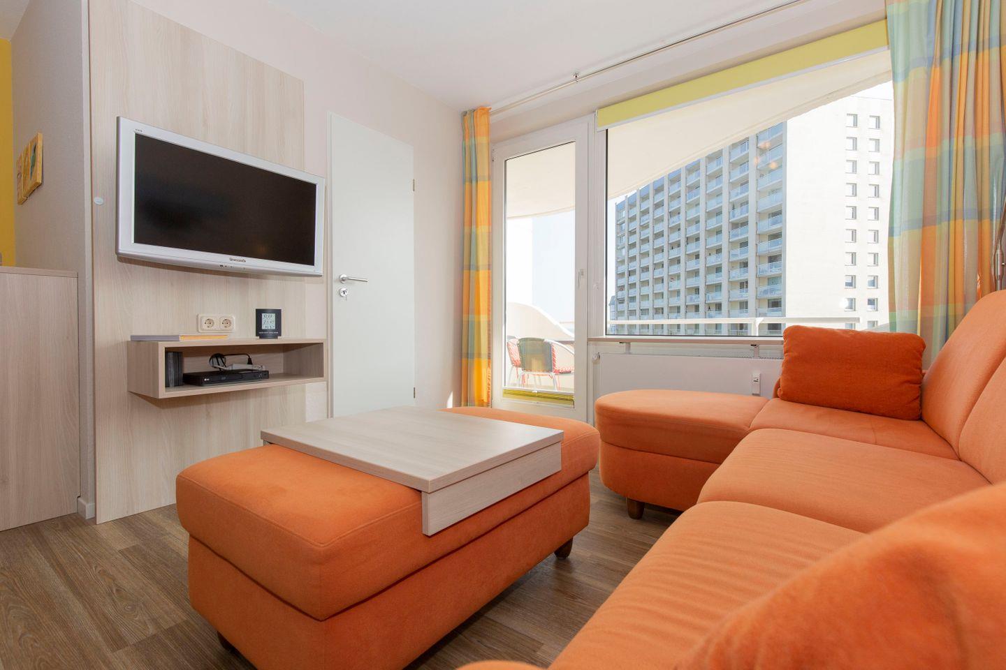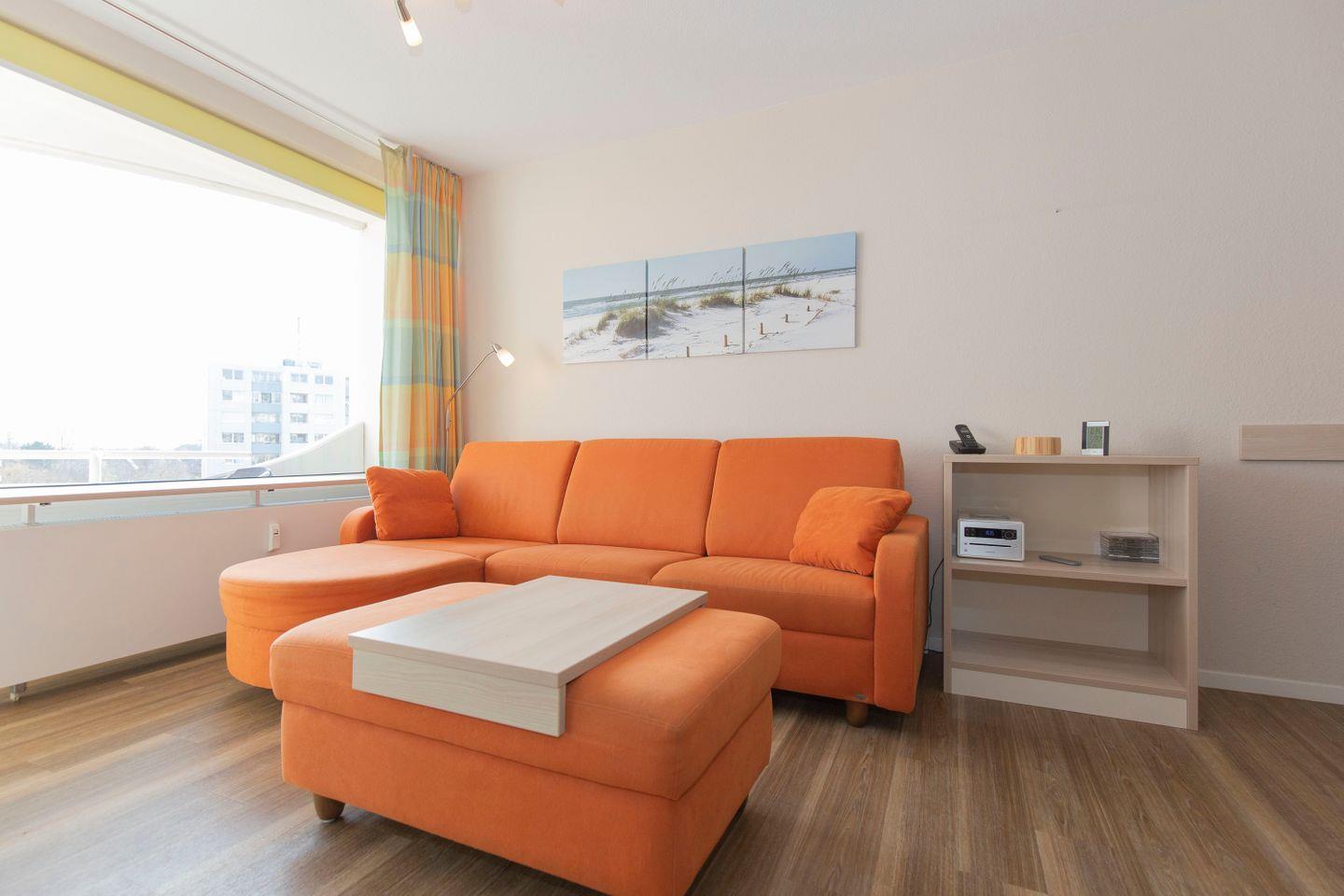 Haus "Lord Nelson", Typ 2, App.-Nr. 419, bis 4 Pers., ca. 40 qm, Weltschifffahrtsweg, seitlicher Meerblick Richtung Elbe, Wohnbereich mit Schrankbett (einzeln klappbar), Kinderzimmer mit Etagenbett, Dusche/WC, Küchenzeile mit 4-Platten-Ceranfeld, Geschirrspüler, Mikrowelle, Backofen, Balkon, Flatscreen-TV (schwenkbar zum Bett), Blu-Ray-Player, Stereo Musiksystem mit Bluetooth, CD, USB DAB+ und Radio, kostenl. W-Lan Zugang im App., Nichtraucherwohnung, Haustiere sind nicht erlaubt, Tiefgaragenstellplatz, Strandkorb im Sommer 2026.
