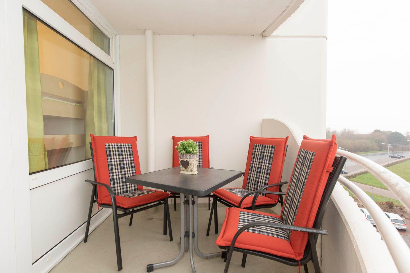 Der Balkon bietet einen Meerblick in Richtung Elbe. Ob beim Frühstück oder bei einem Glas Wein nach einem aufregenden Urlaubstag, auf dem Balkon können Sie Ihren Urlaub jederzeit unter freiem Himmel und an der frischen Nordseeluft genießen.