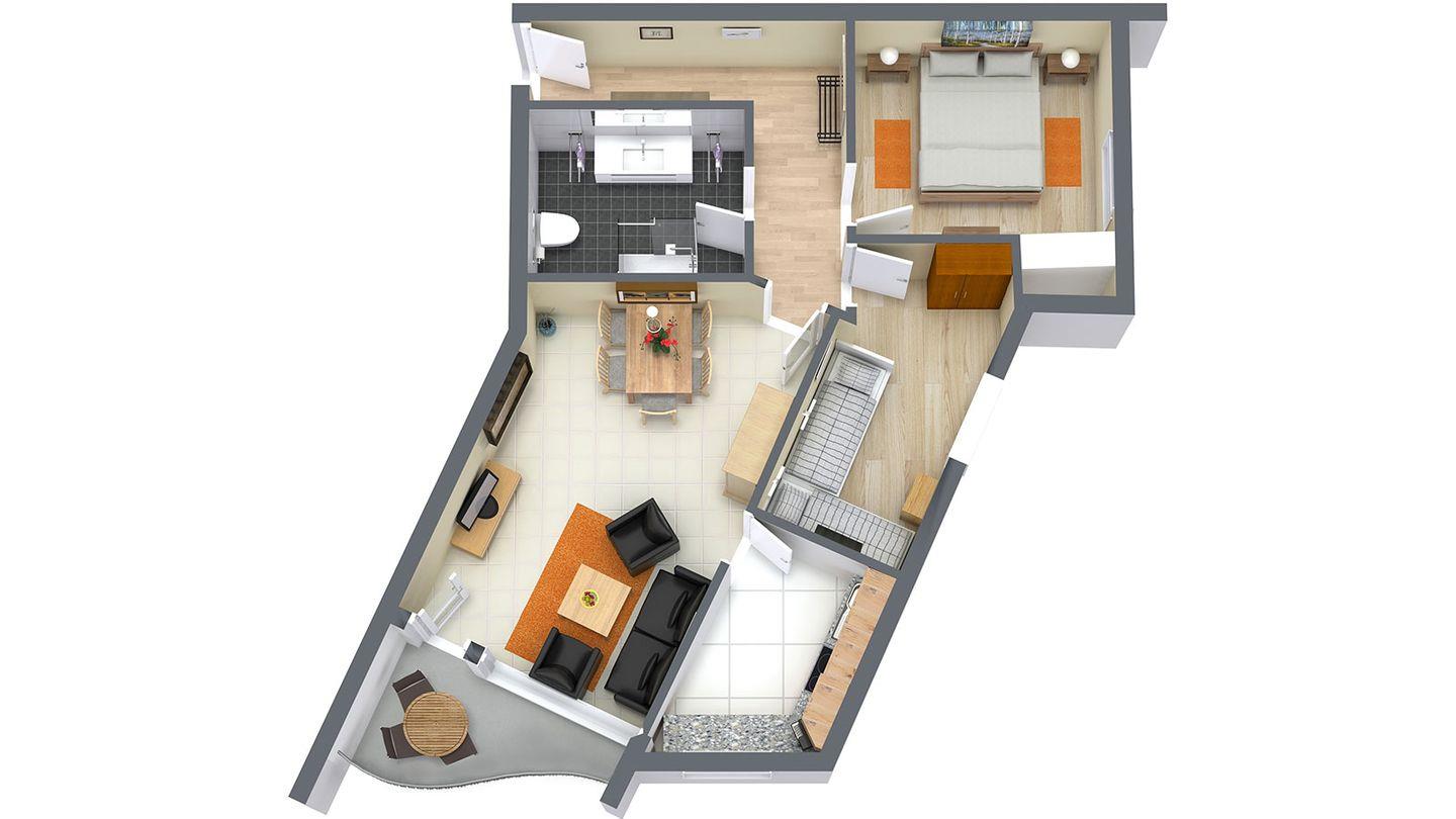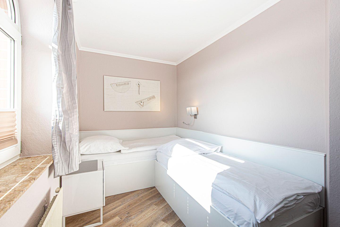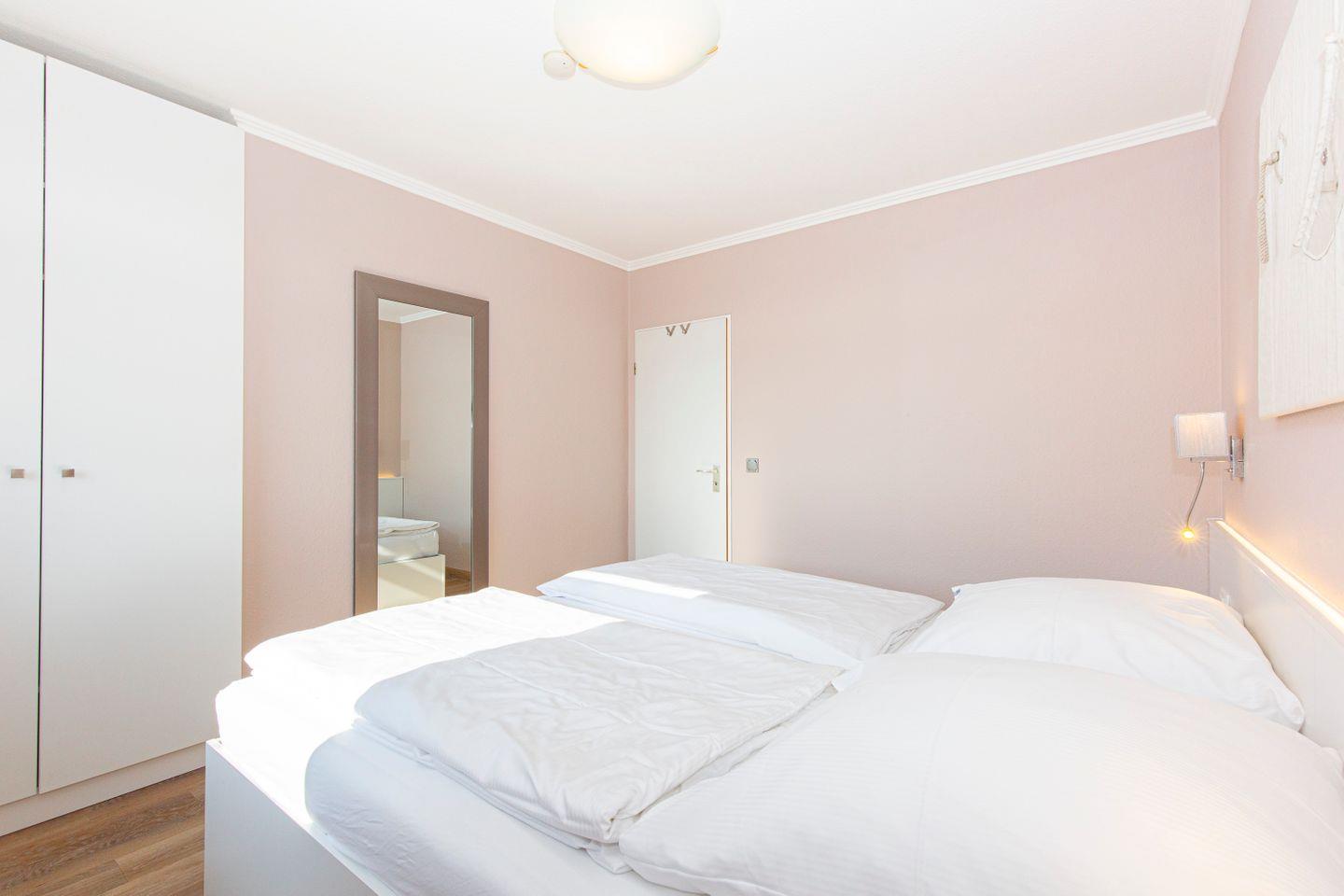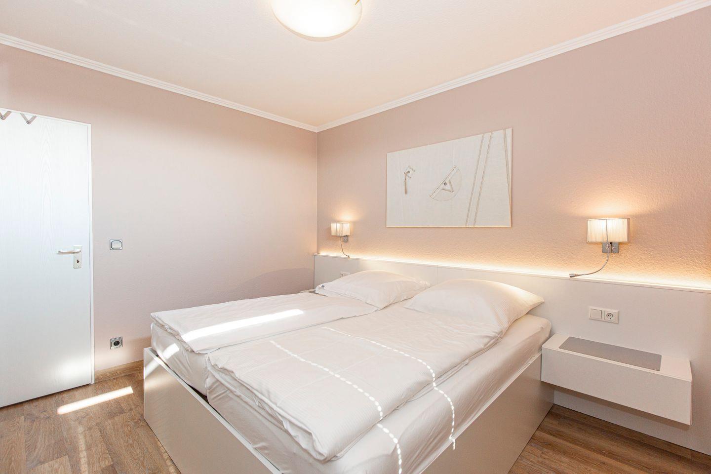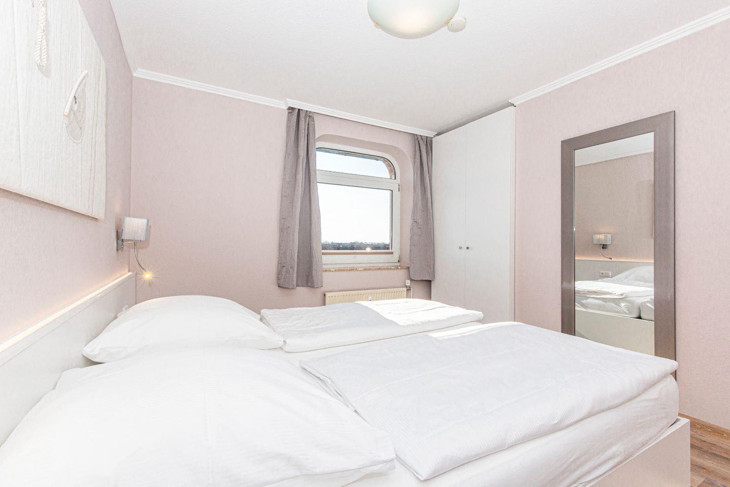 Haus "Trafalgar", Typ D, Appartement-Nr. 327, bis 6 Personen, 3. Etage, ca. 66 qm, Westseite (Meerblick), Wohn/Schlafraum mit Schlafcouch, separates Schlafzimmer mit zwei Einzelbetten, Schlafzimmer mit Doppelbett, separate Küche mit Ceranfeld, Backofen, Geschirrspüler und Mikrowelle, Dusche/WC, Balkon, Telefon, Kabel-TV, W-Lan im App, Tiefgaragenstellplatz, Haustiere sind nicht gestattet, Strandkorb im Sommer 2026.