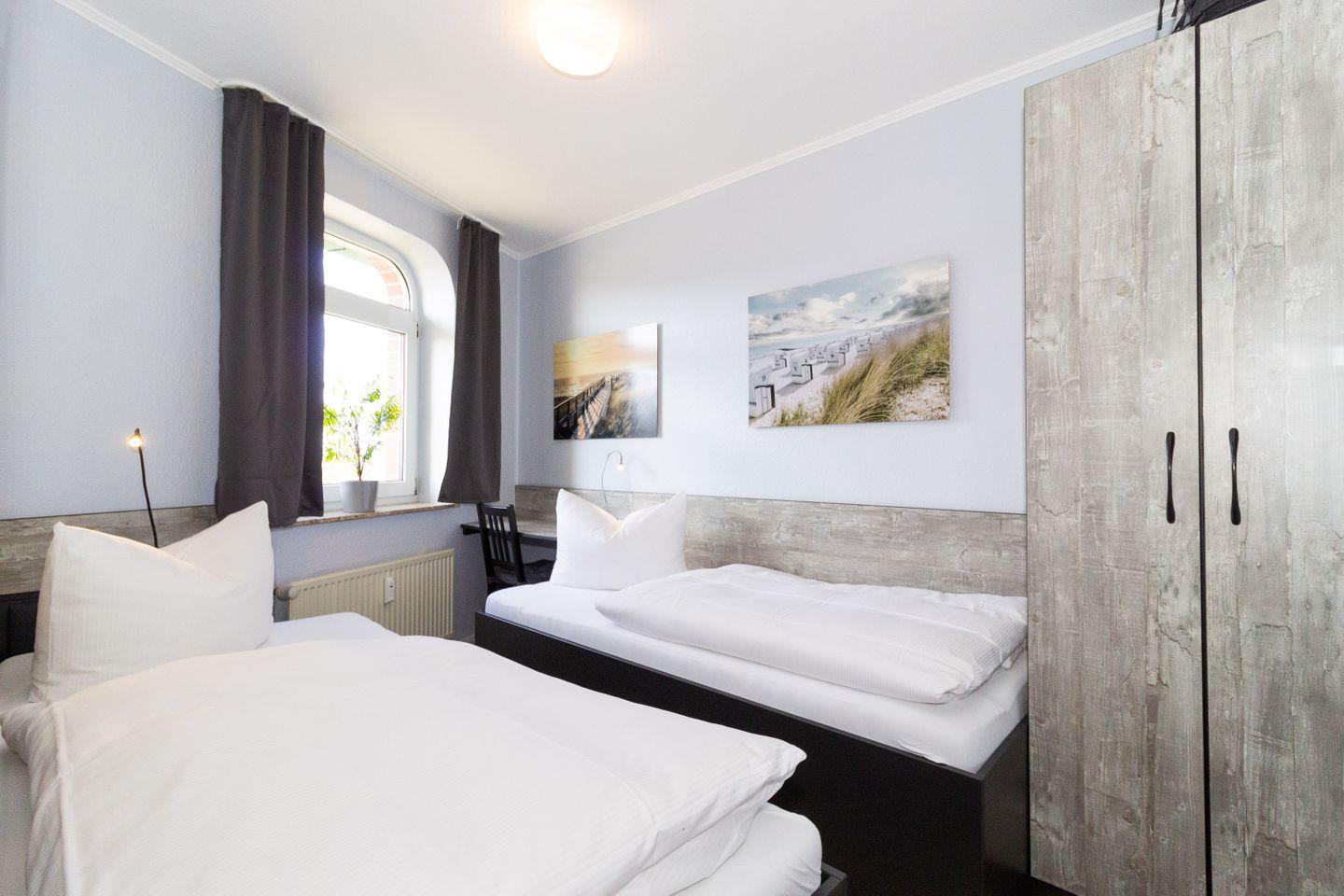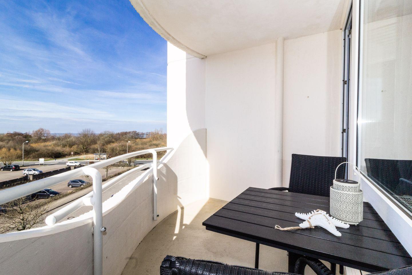 Haus "Trafalgar", Typ C, App.-Nr. "326", bis 4 Personen, 3. Etage, ca. 55 qm, Westseite (Meerblick), Wohn/Schlafraum mit Doppelbett (durchgehende Matratze), separates Schlafzimmer mit zwei Einzelbetten, Küchenzeile mit Ceranfeld, Backofen, Geschirrspüler und Mikrowelle, Dusche/WC, Nichtraucherwohnung ,Balkon, Telefon, WLAN im App., Flatscreen-TV (Kabel), Nichtraucherwohnung, Tiefgaragenstellplatz, keine Haustiere erlaubt, Strandkorb im Sommer 2026