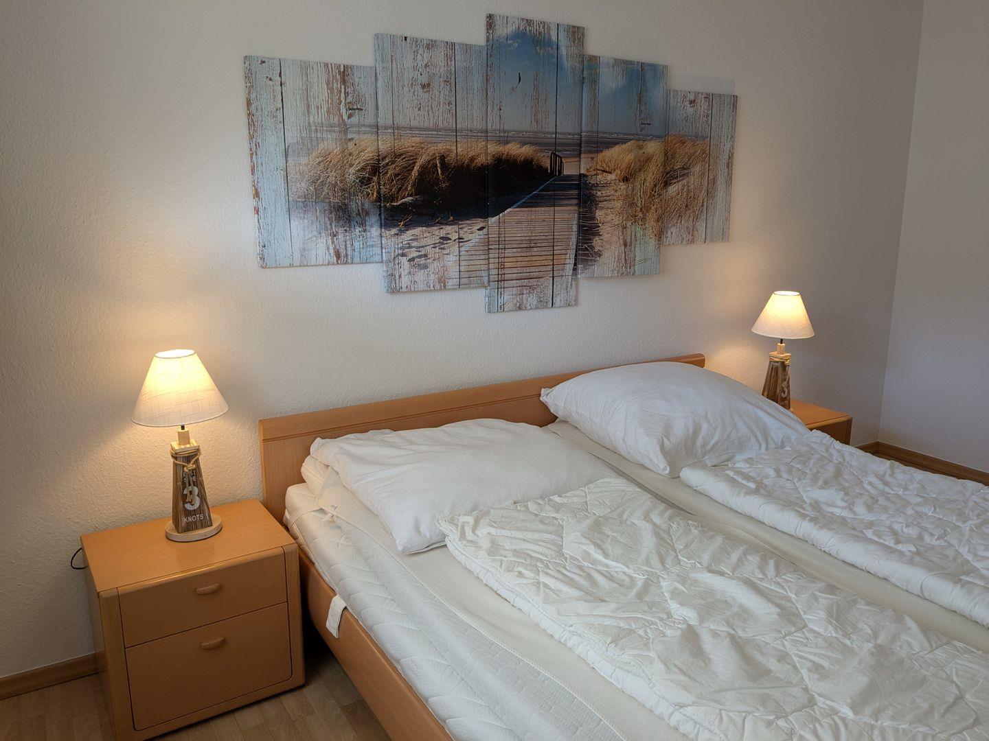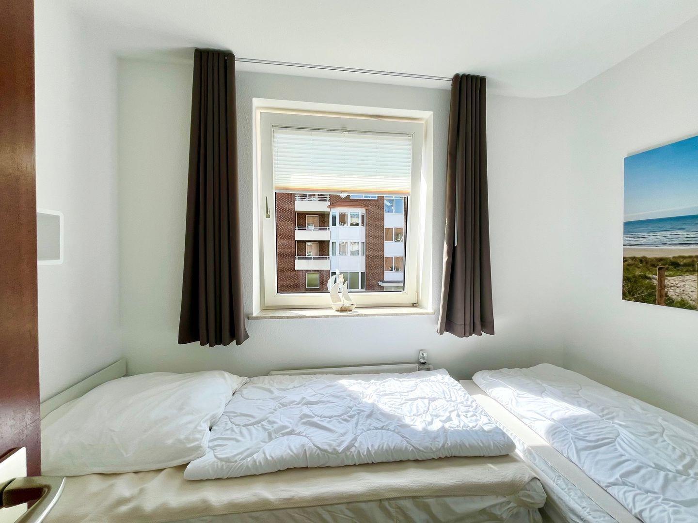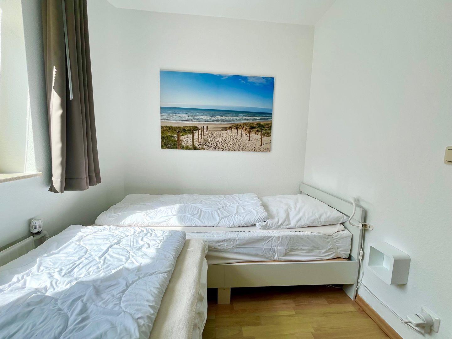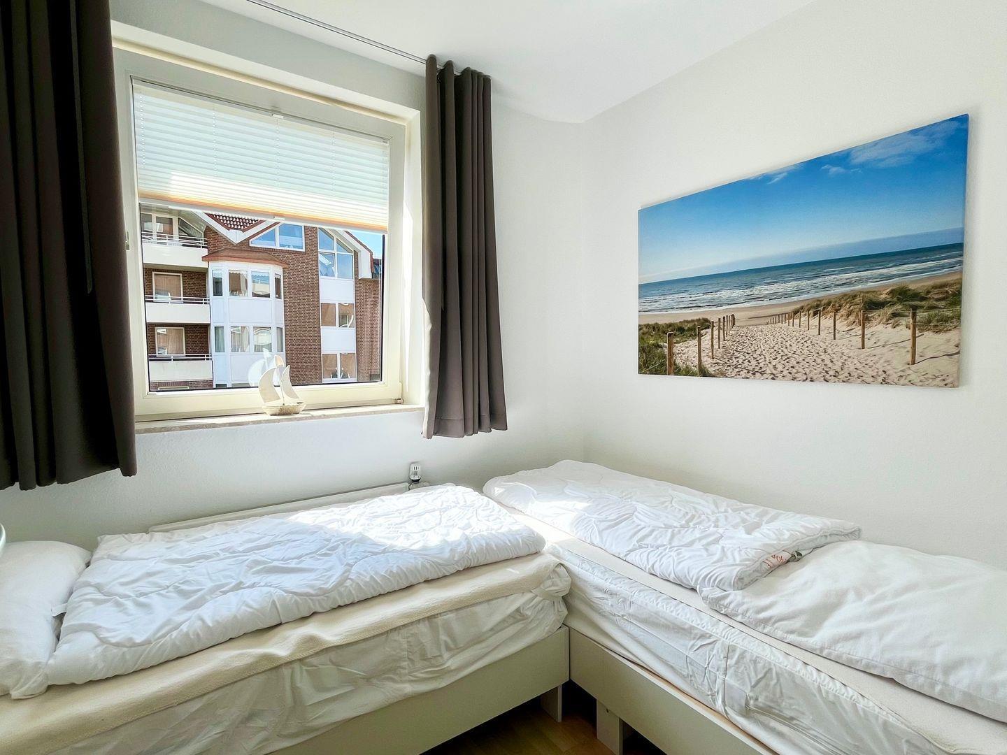 Haus "Lord Nelson", Typ 6, Appartement-Nr. "110", bis 6 Personen, 1. Etage, ca. 66 qm Größe, Südseite (ohne Meerblick/Richtung Trafalgar), Schlafzimmer mit Doppelbett, 2. Schlafzimmer mit zwei Einzelbetten, Wohnbereich mit Schrankbett (einzeln klappbar), Dusche/WC, sep. Küche mit Backofen, Geschirrspüler und Mikrowelle, Nichtraucher App. ,Balkon (Südseite), Flachbildschirm, kostenl. W-Lan Zugang im App., Haustiere sind auf Anfrage gestattet, Außenstellplatz, Strandkorb im Sommer 2026.
