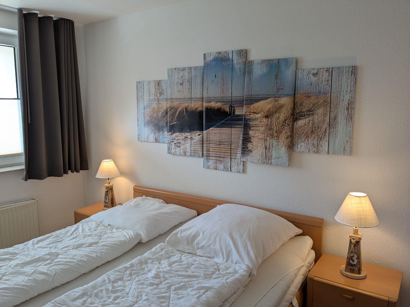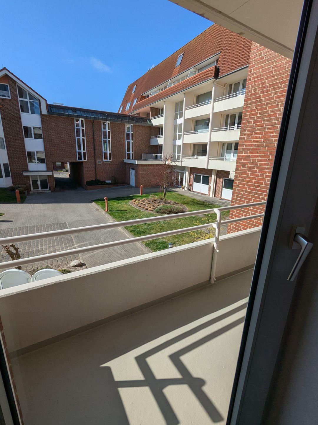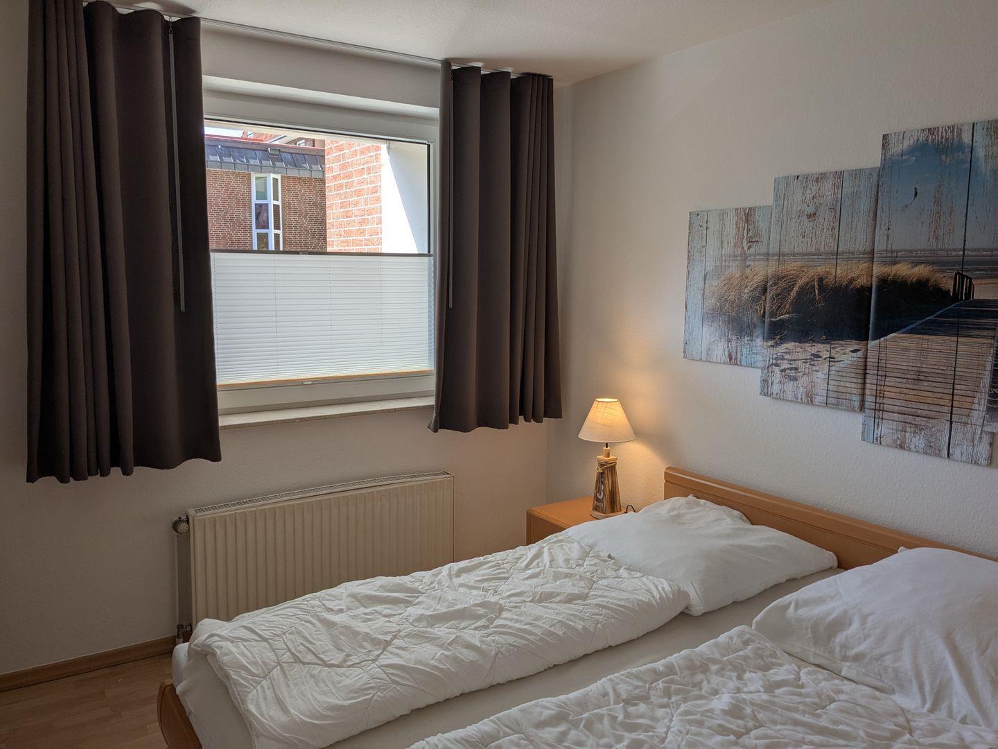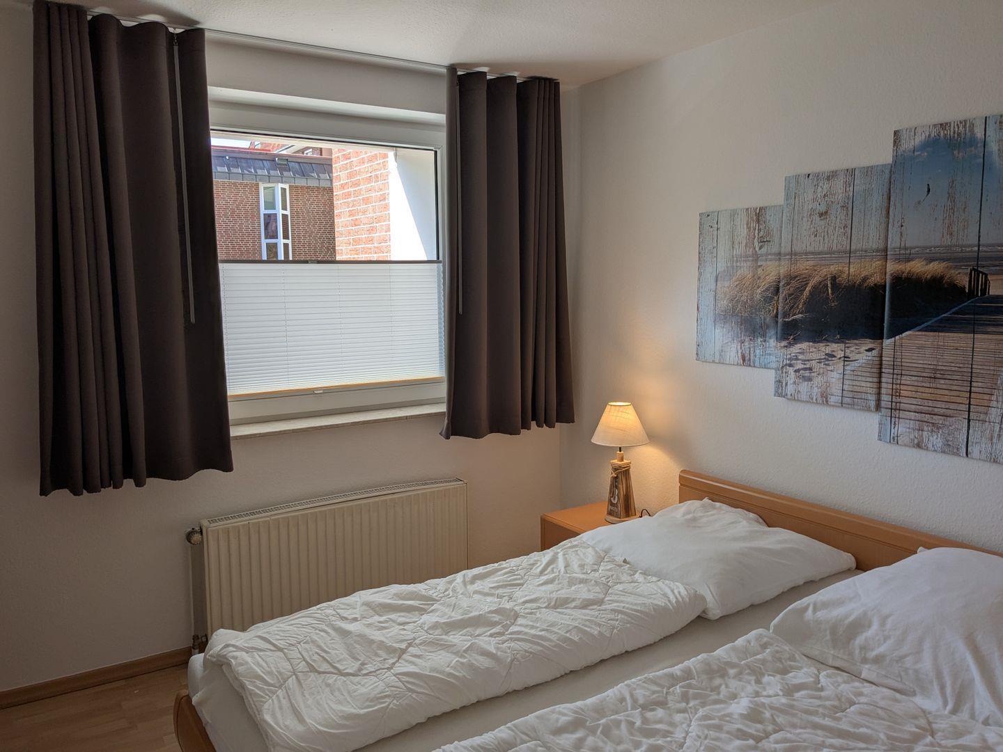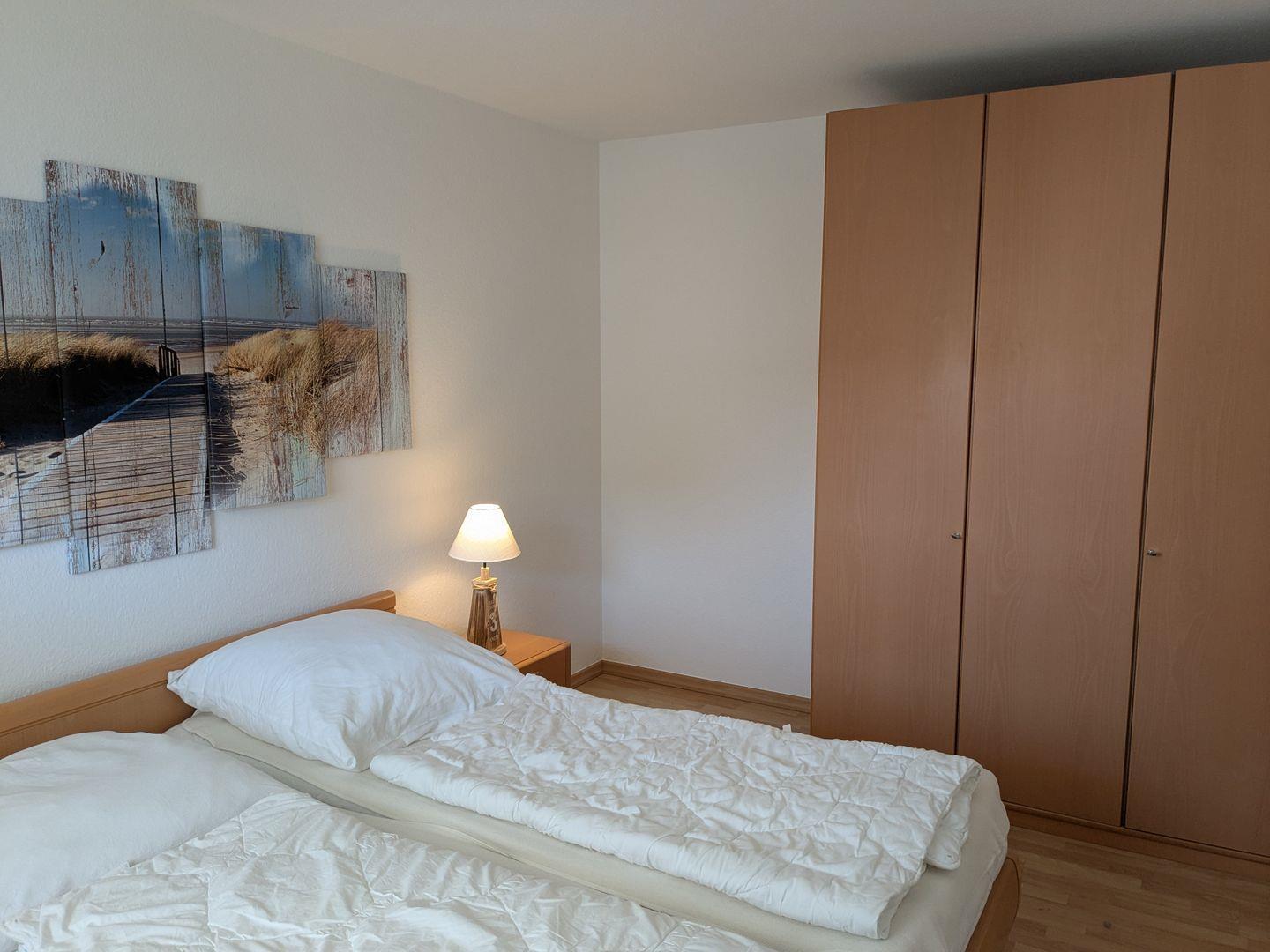 Haus "Lord Nelson", Typ 6, Appartement-Nr. "110", bis 6 Personen, 1. Etage, ca. 66 qm Größe, Südseite (ohne Meerblick/Richtung Trafalgar), Schlafzimmer mit Doppelbett, 2. Schlafzimmer mit zwei Einzelbetten, Wohnbereich mit Schrankbett (einzeln klappbar), Dusche/WC, sep. Küche mit Backofen, Geschirrspüler und Mikrowelle, Nichtraucher App. ,Balkon (Südseite), Flachbildschirm, kostenl. W-Lan Zugang im App., Haustiere sind auf Anfrage gestattet, Außenstellplatz, Strandkorb im Sommer 2026.